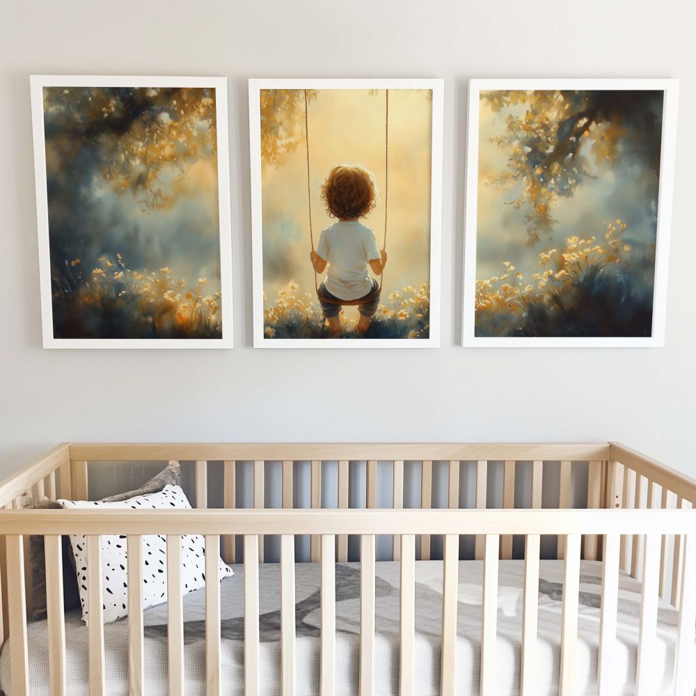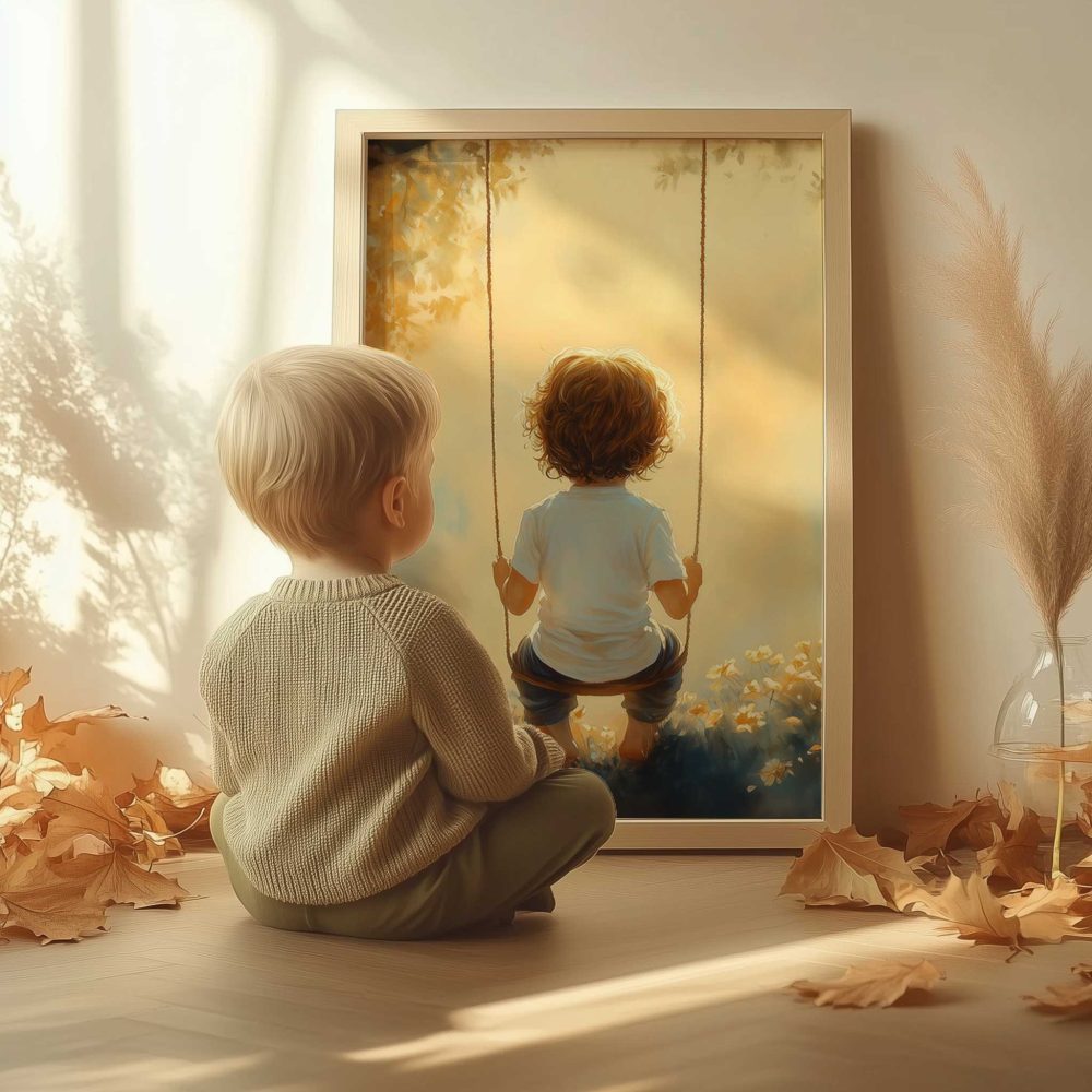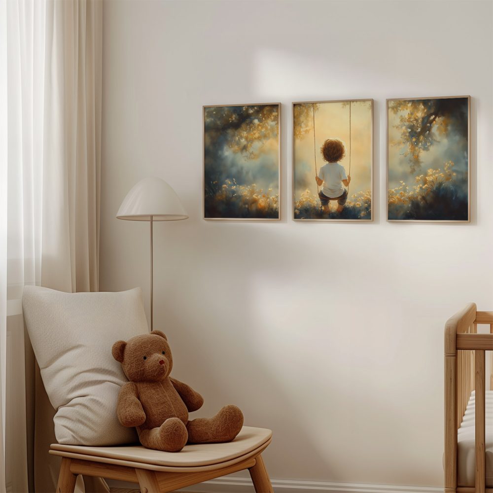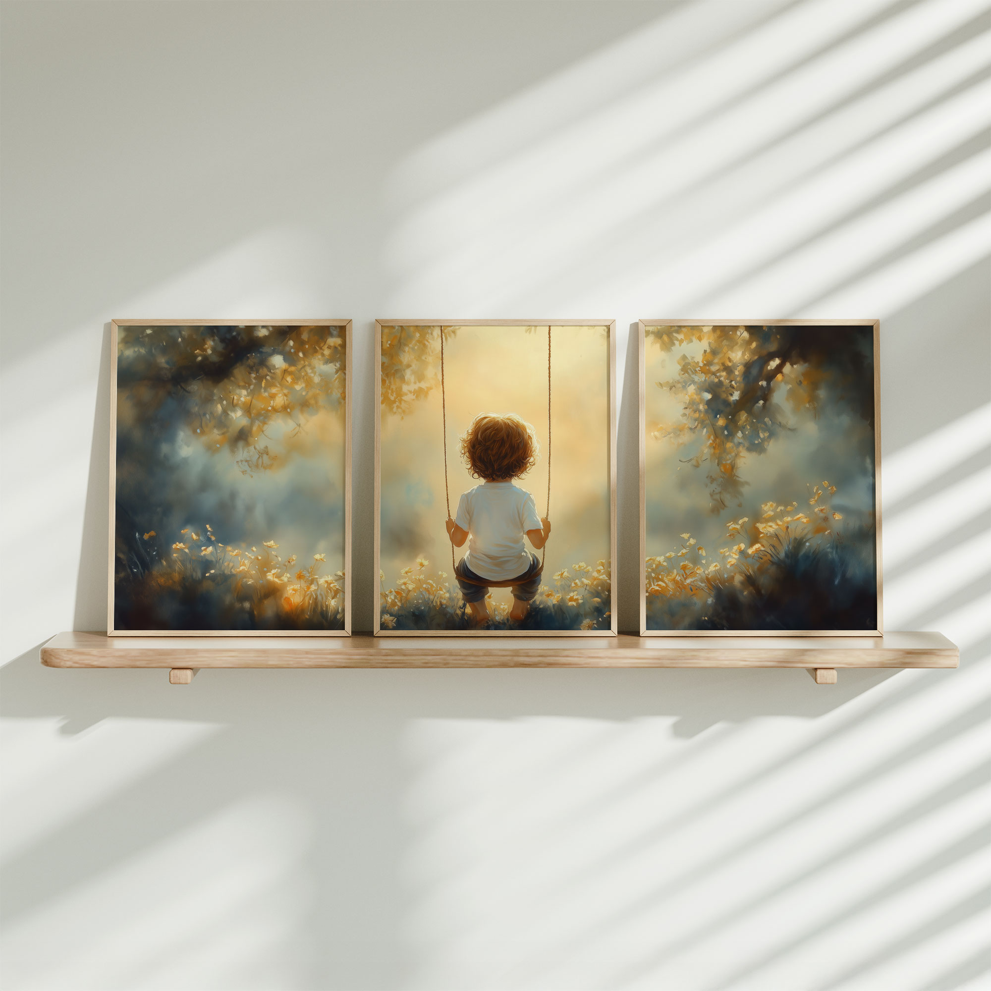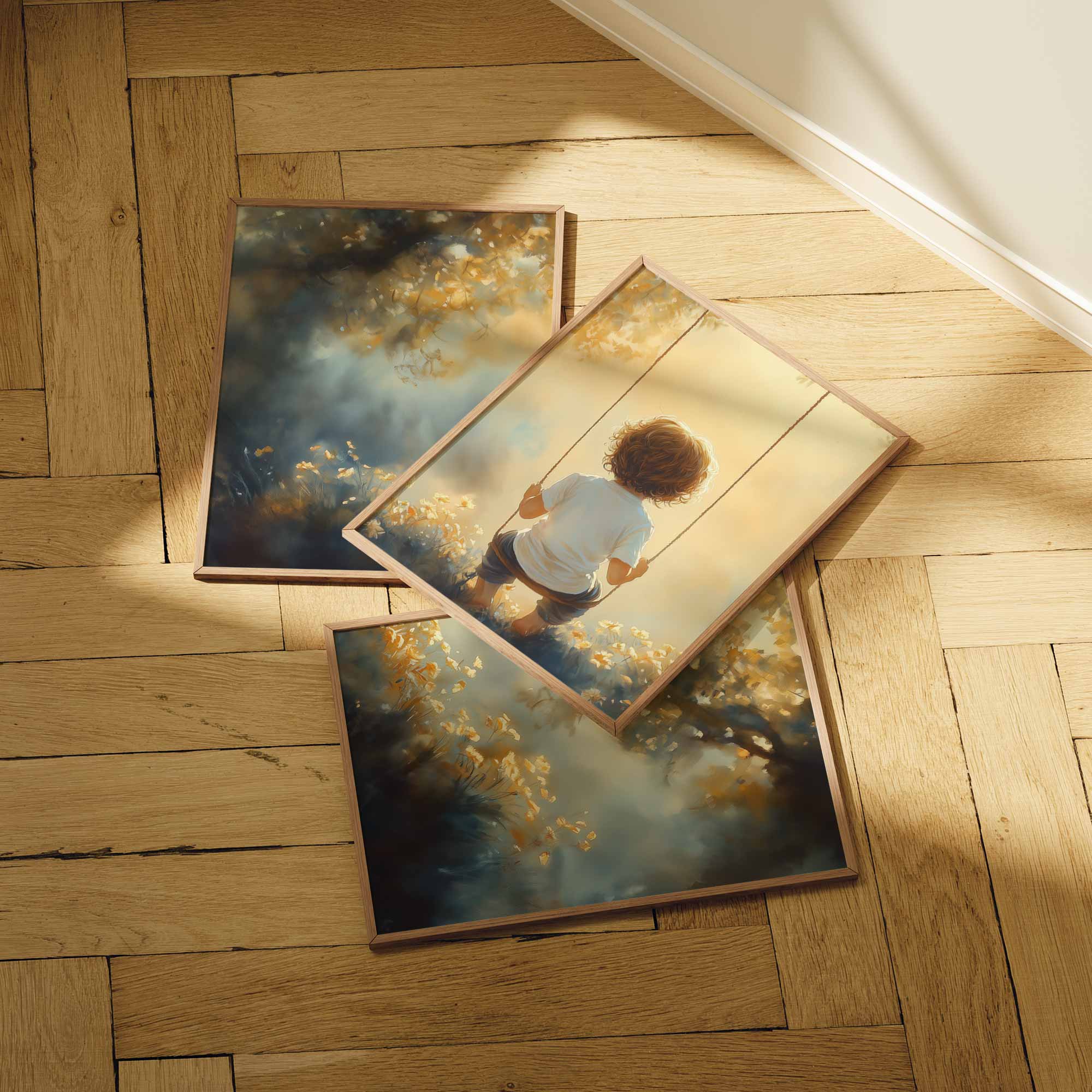 Terug naar collectie / Kinderkamer posters / Bloemen posters / Zonnige schommel in een bloemenveld