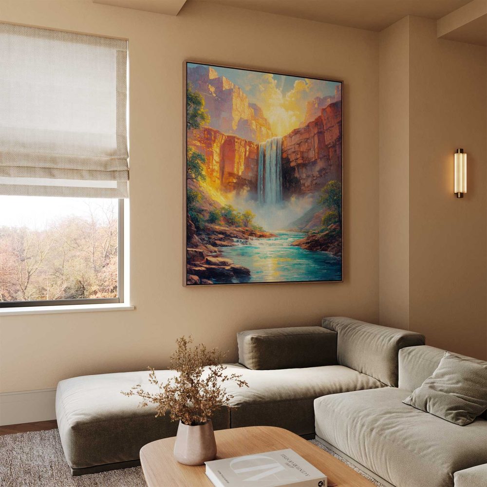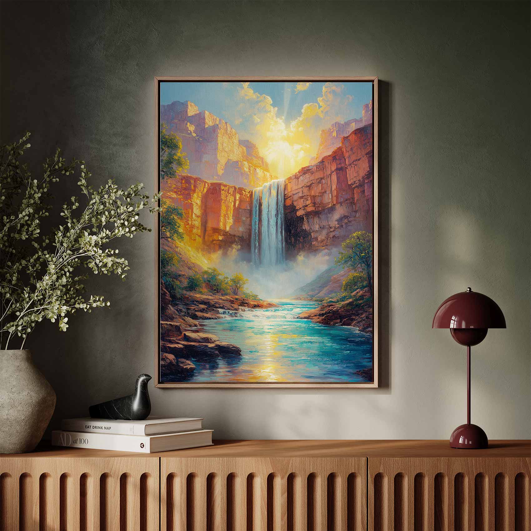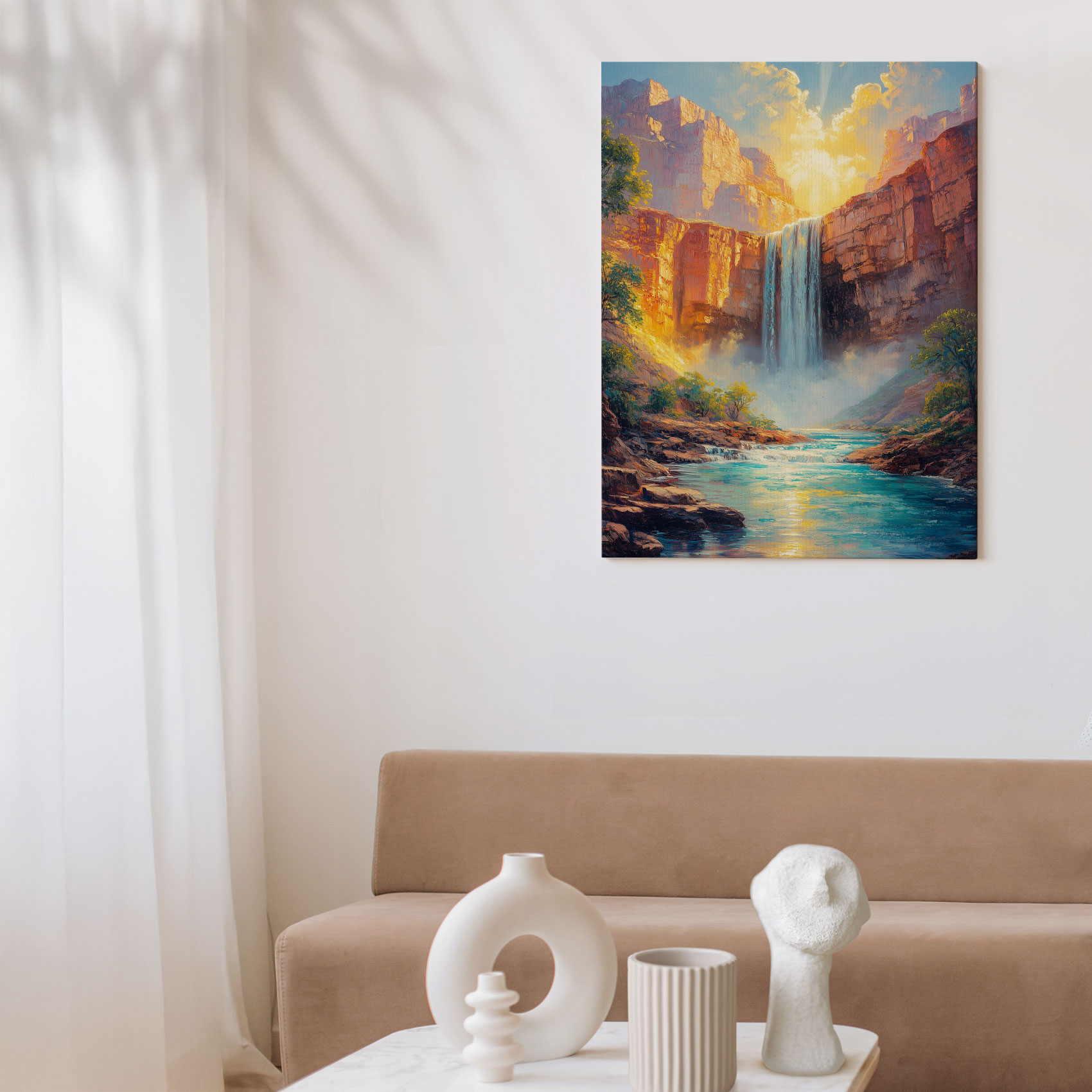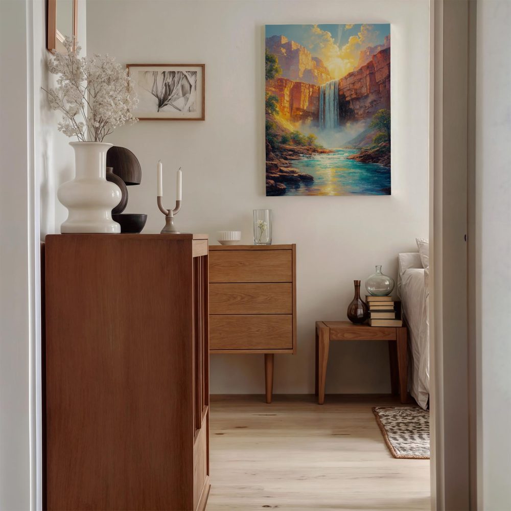 Terug naar collectie / Schilderijen / Bergen Schilderij / Zonnige waterval in bergen