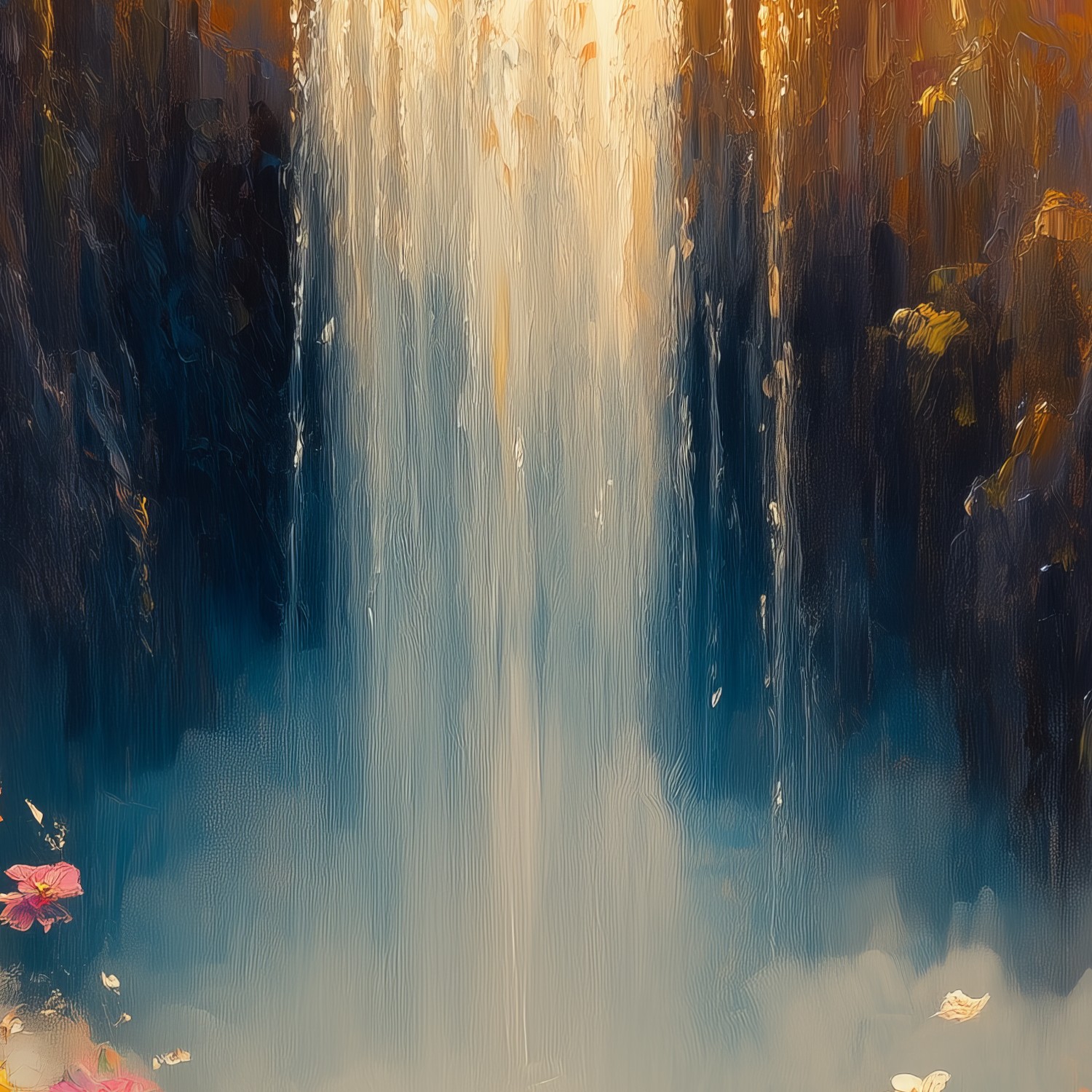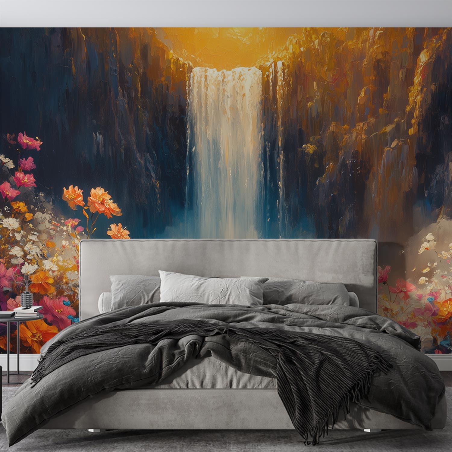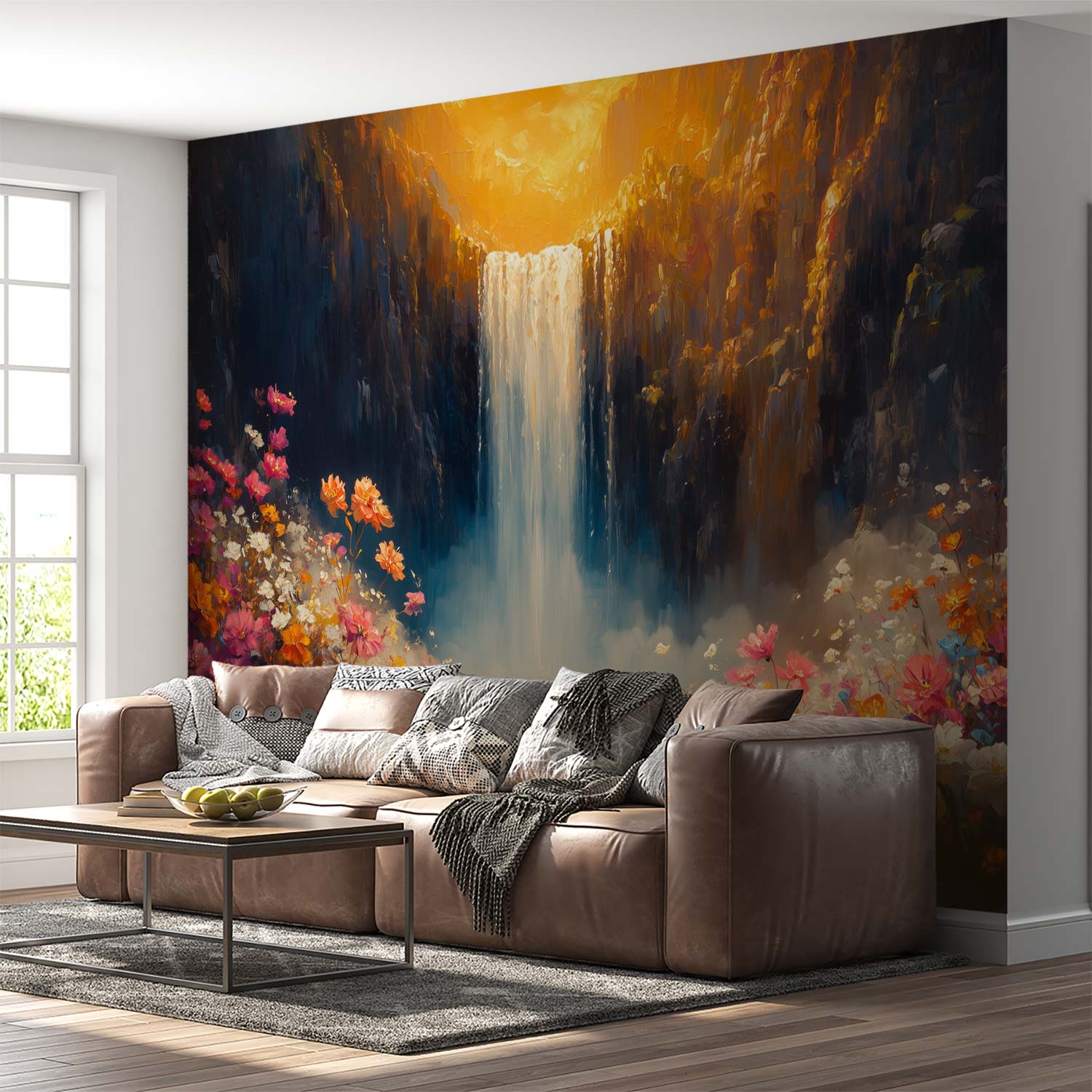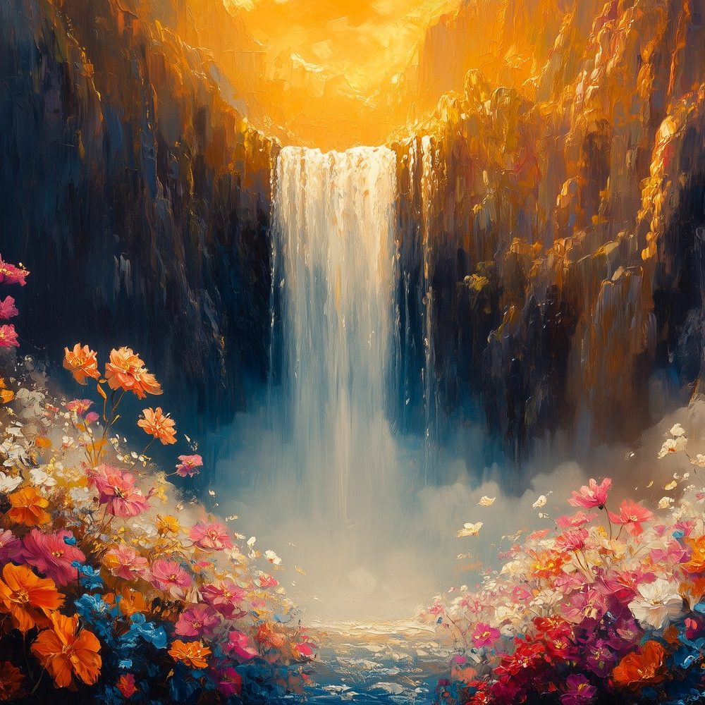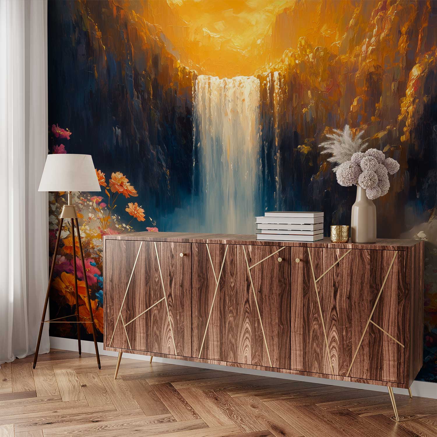 Terug naar collectie / Behang / Abstract behang / Zonnige watervalbloesemvallei behang