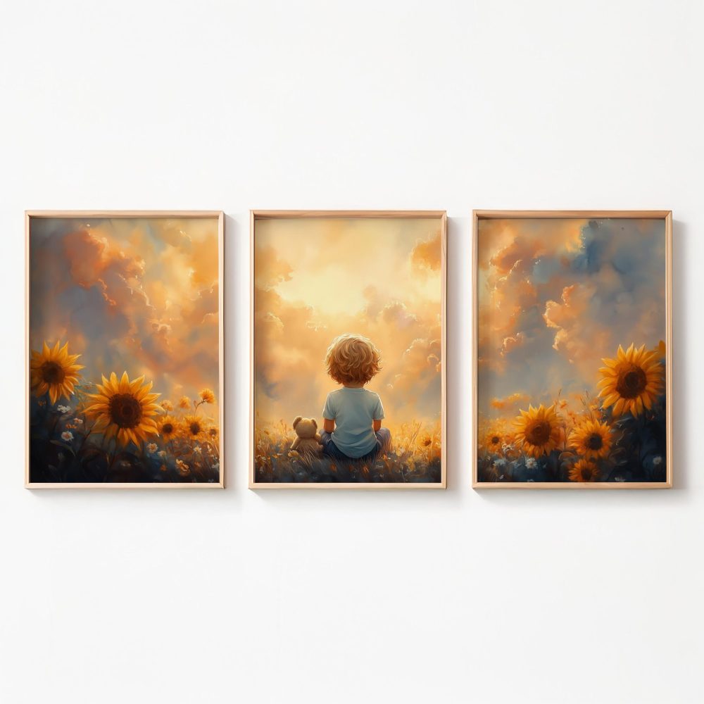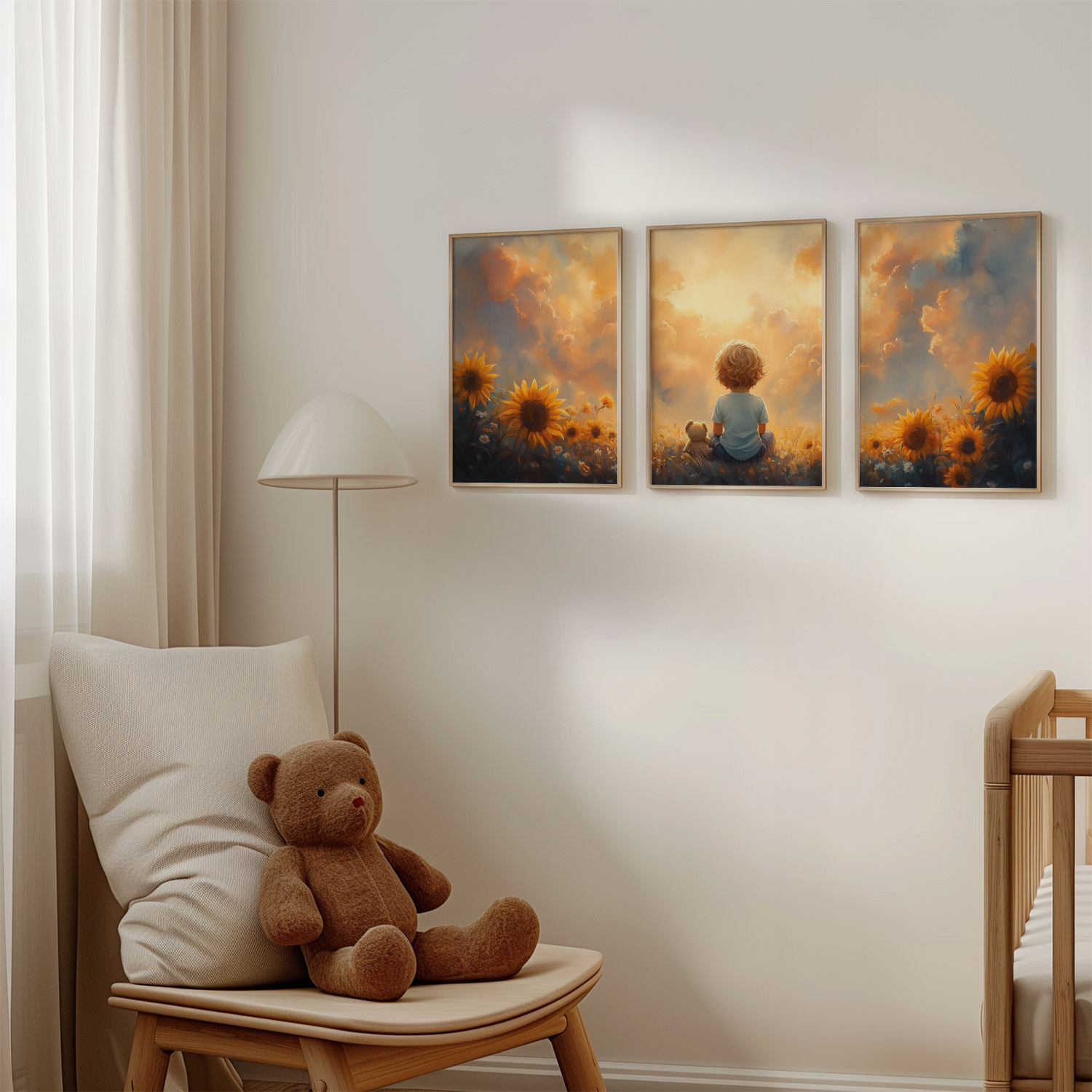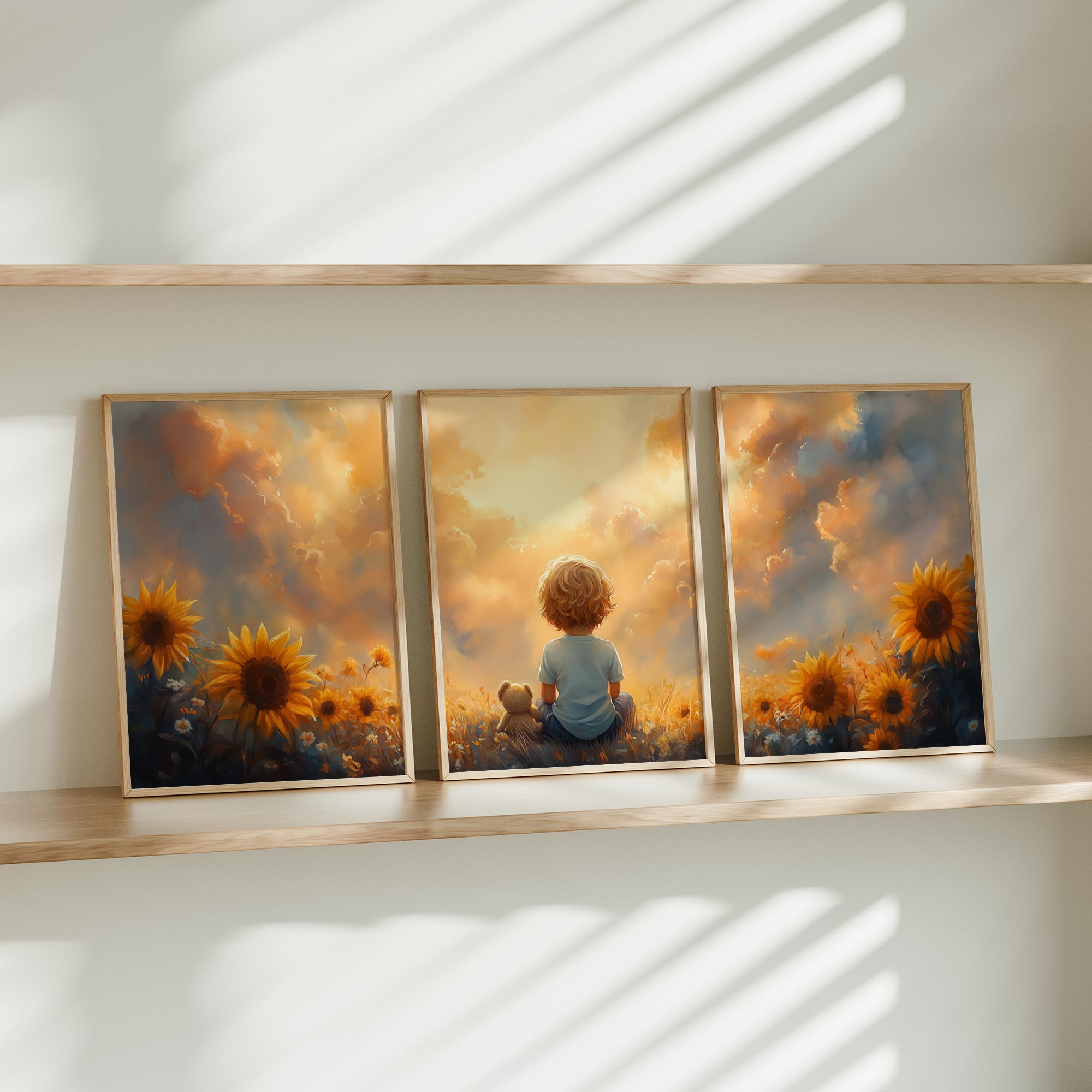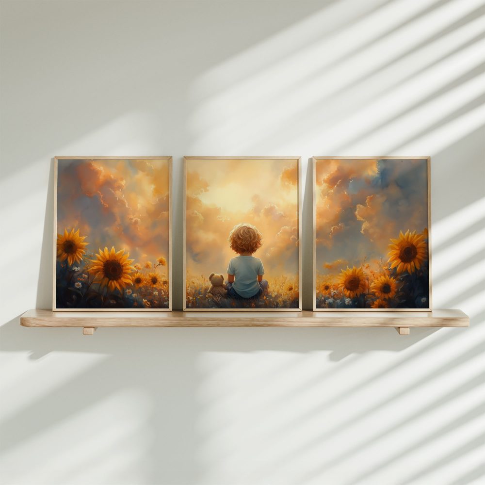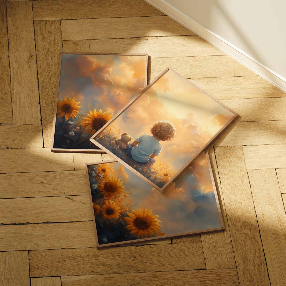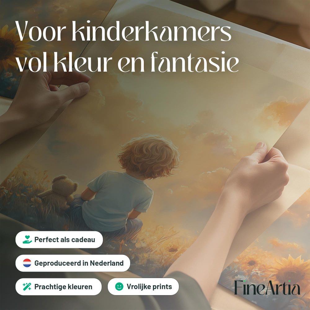 Terug naar collectie / Kinderkamer posters / Bloemen posters / Zonnige Zonnebloemen en een Dromerige Jongen