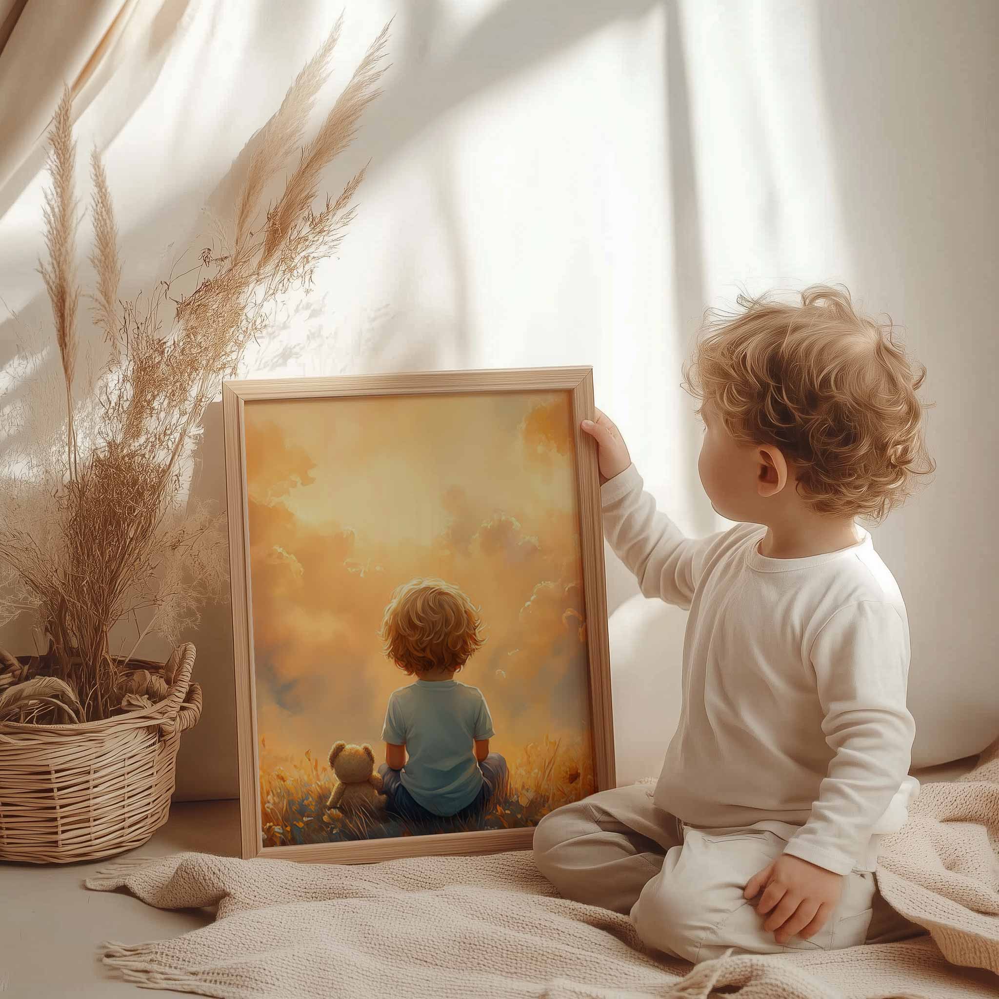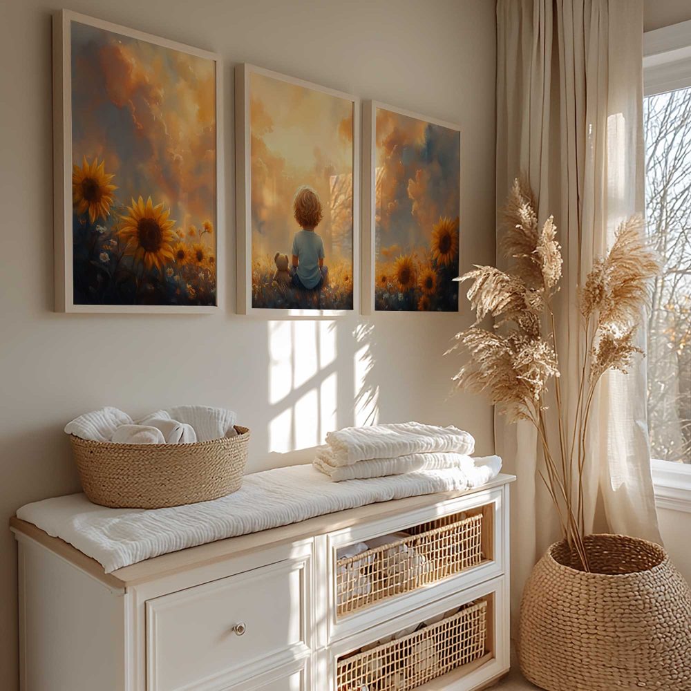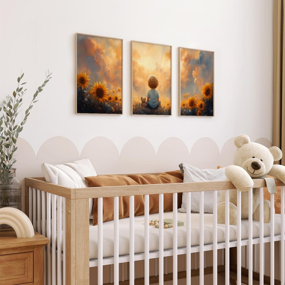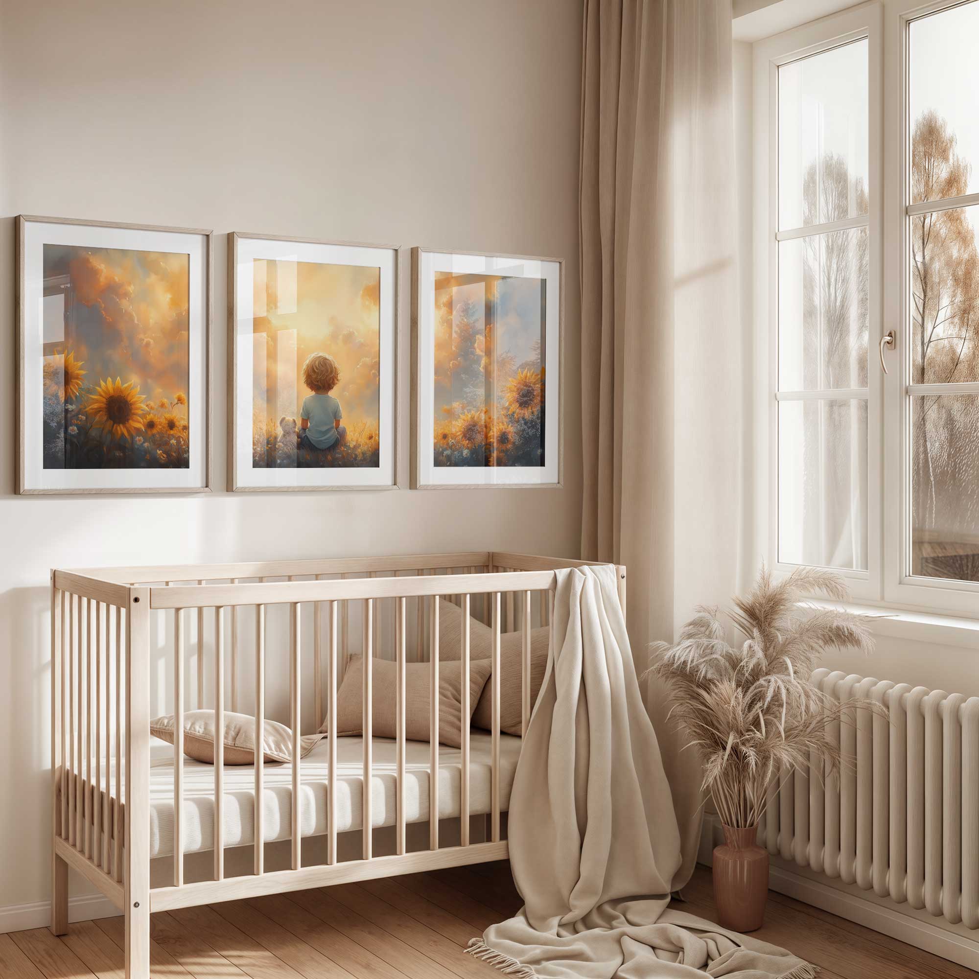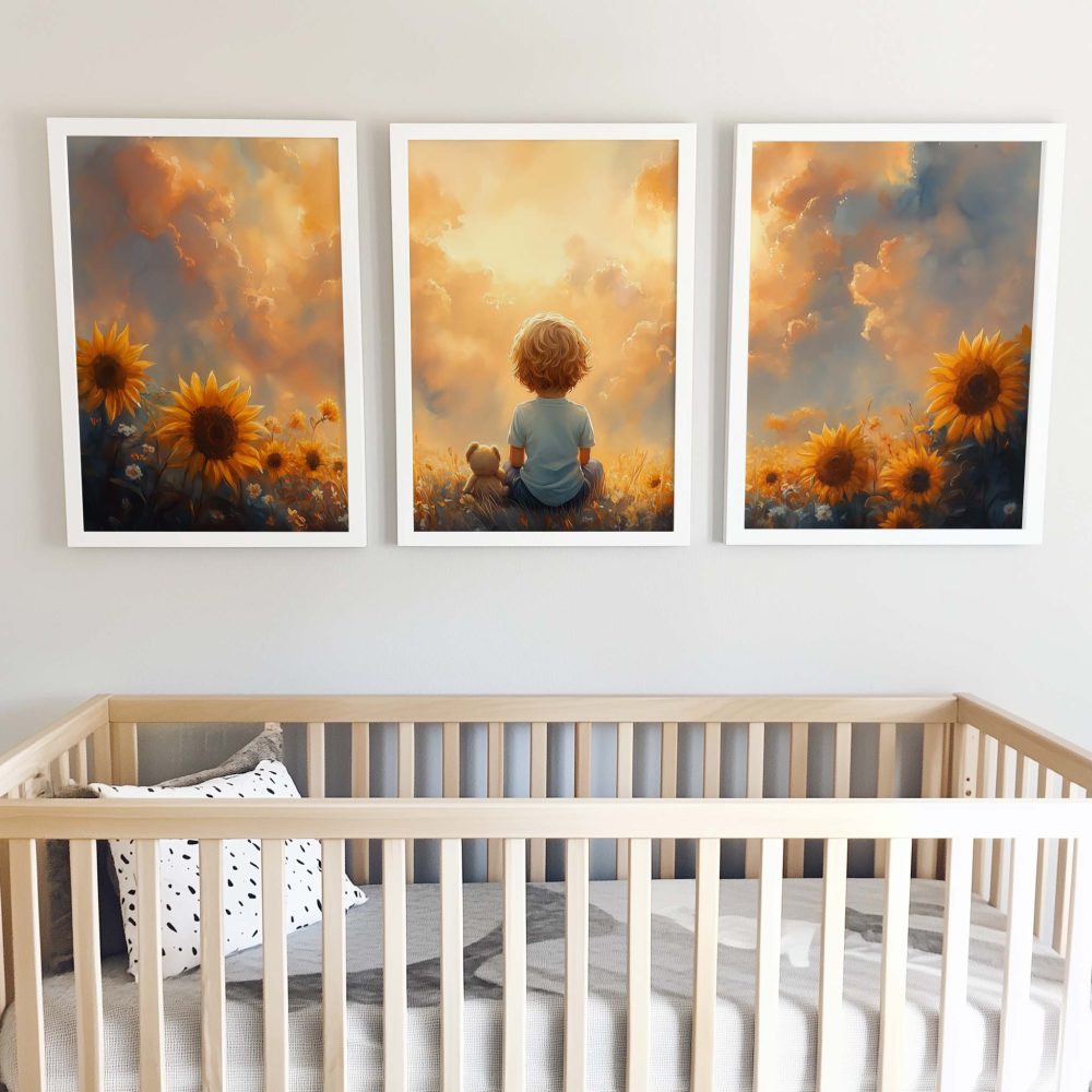 Terug naar collectie / Kinderkamer posters / Bloemen posters / Zonnige Zonnebloemen en een Dromerige Jongen