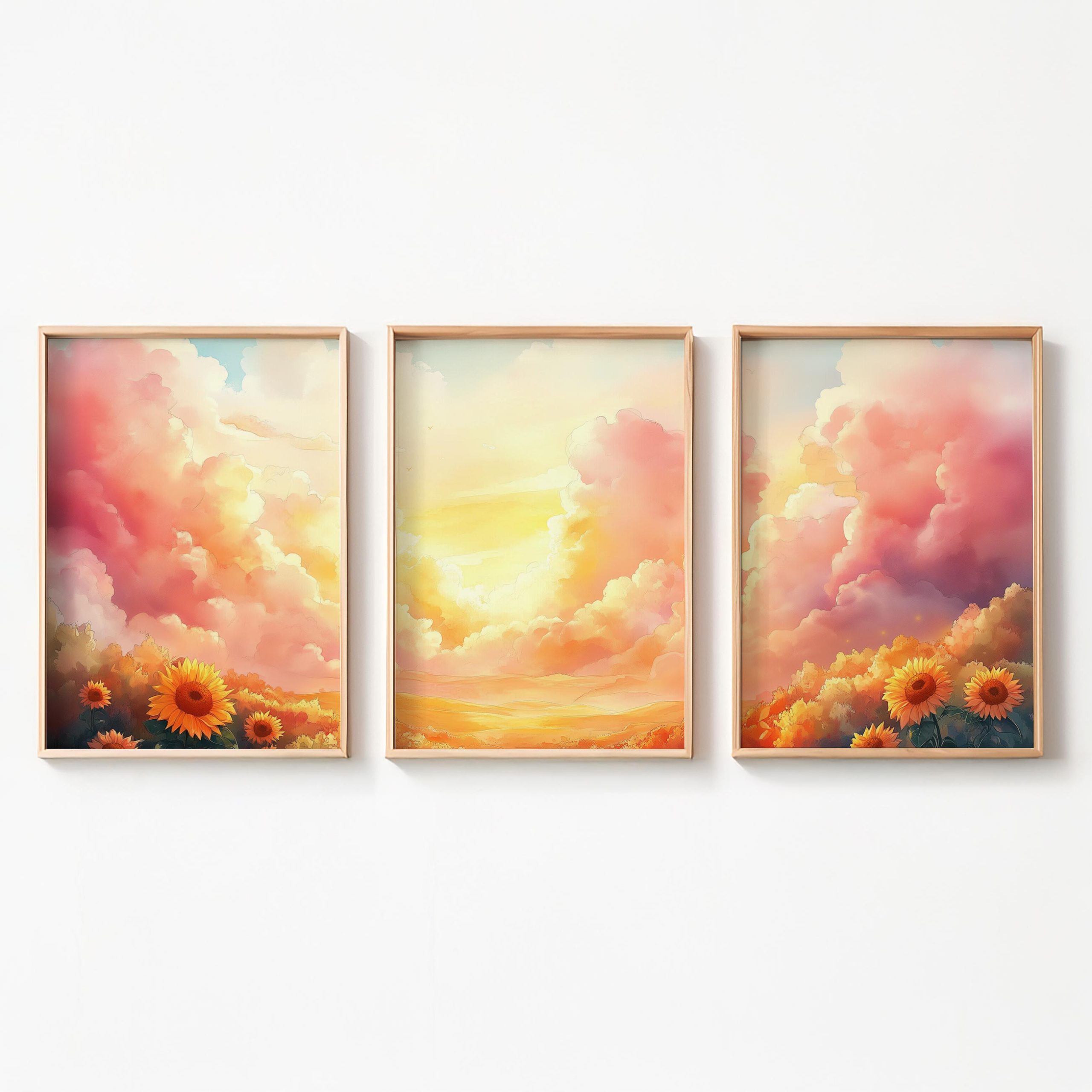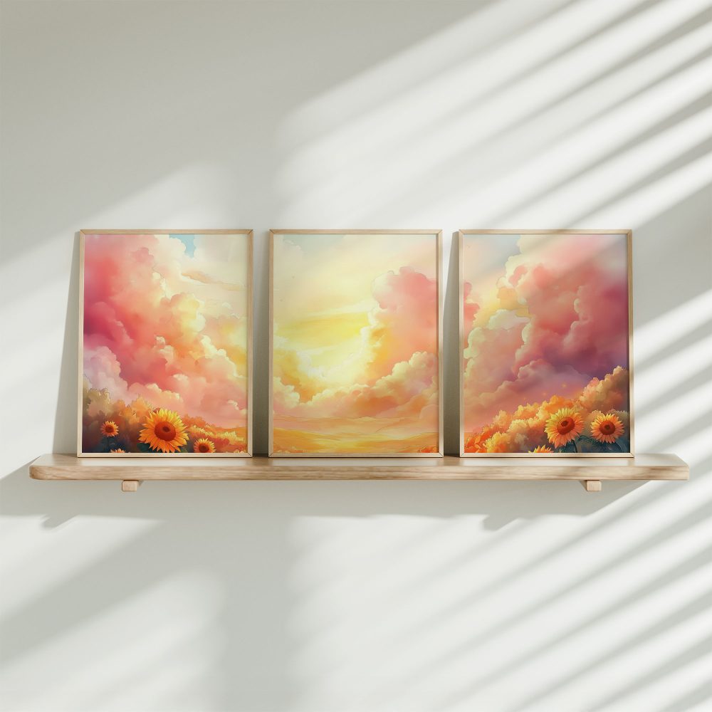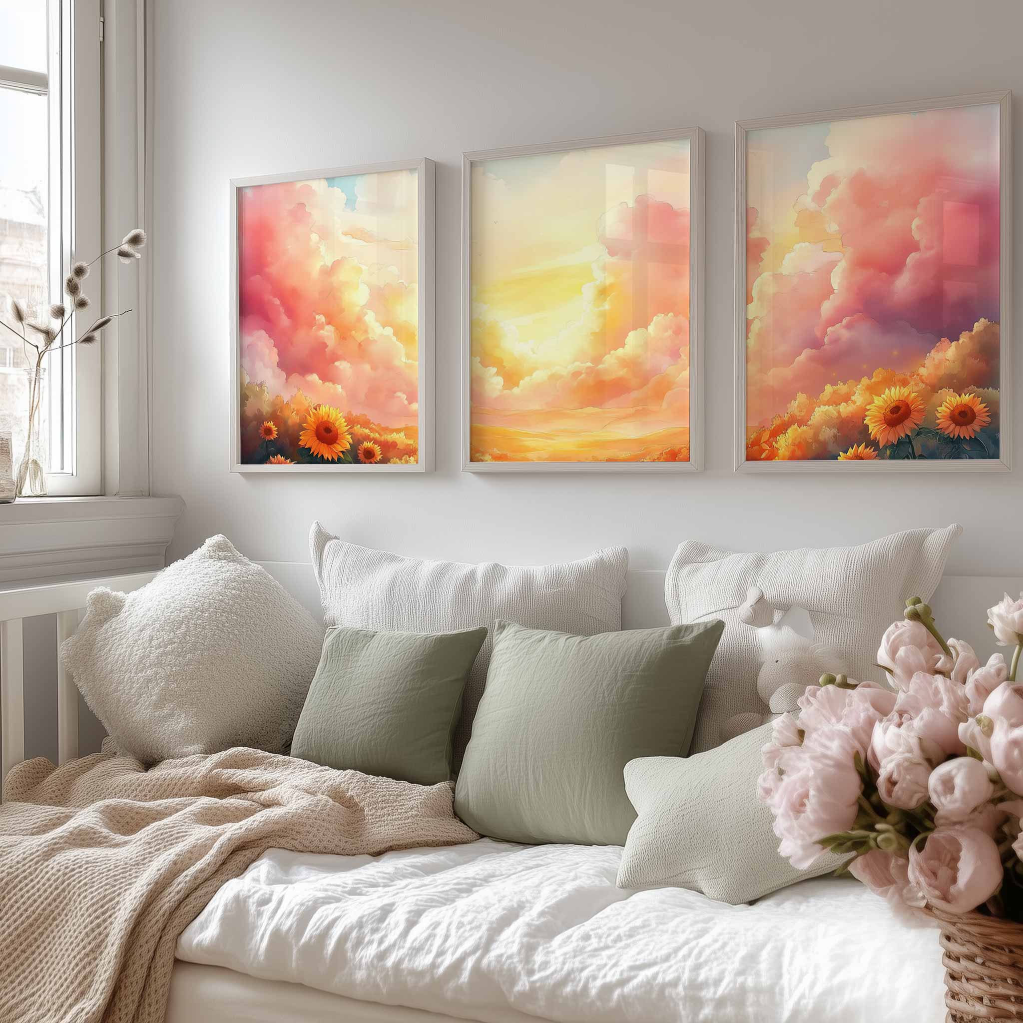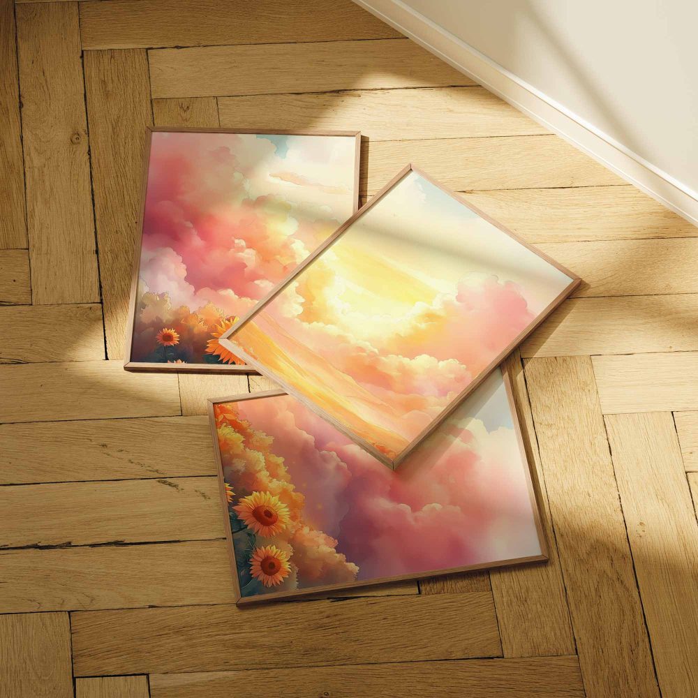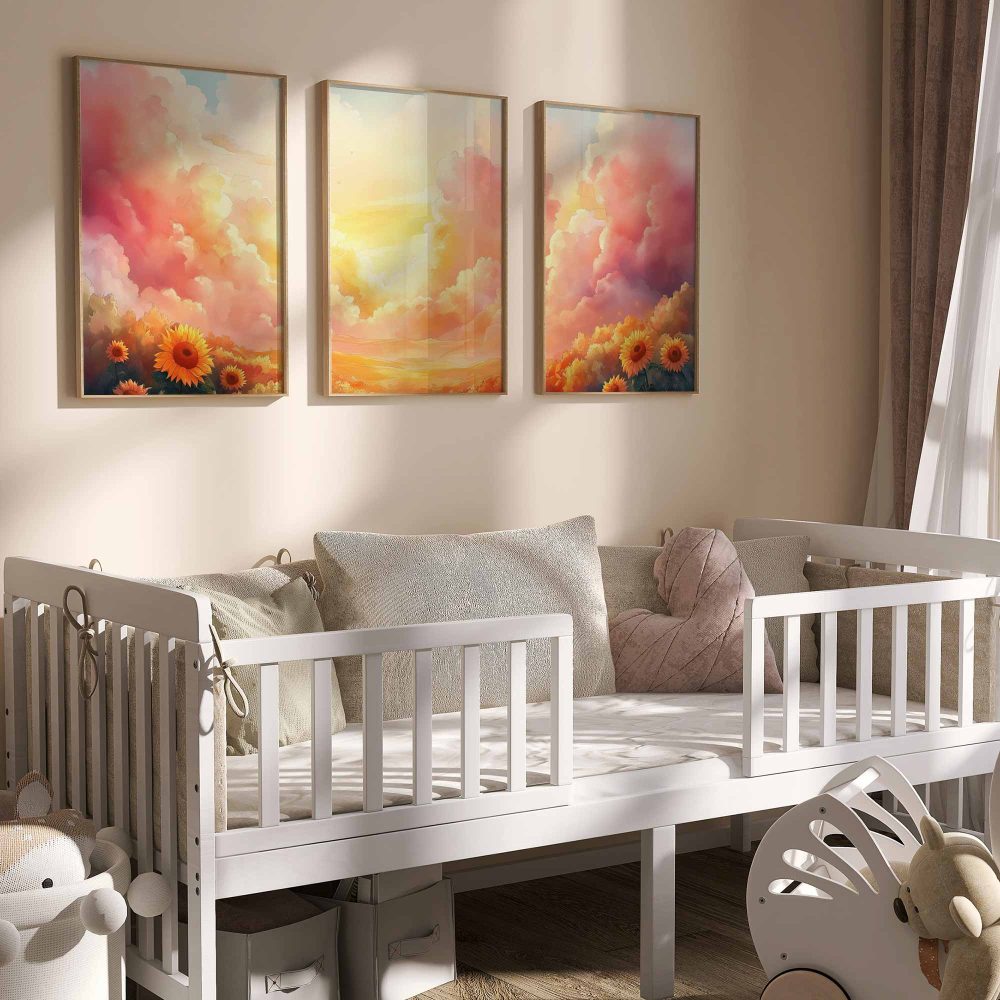 Terug naar collectie / Kinderkamer posters / Bloemen posters / Zonnige Zonnebloemen in Dromerig Pastel Landschap