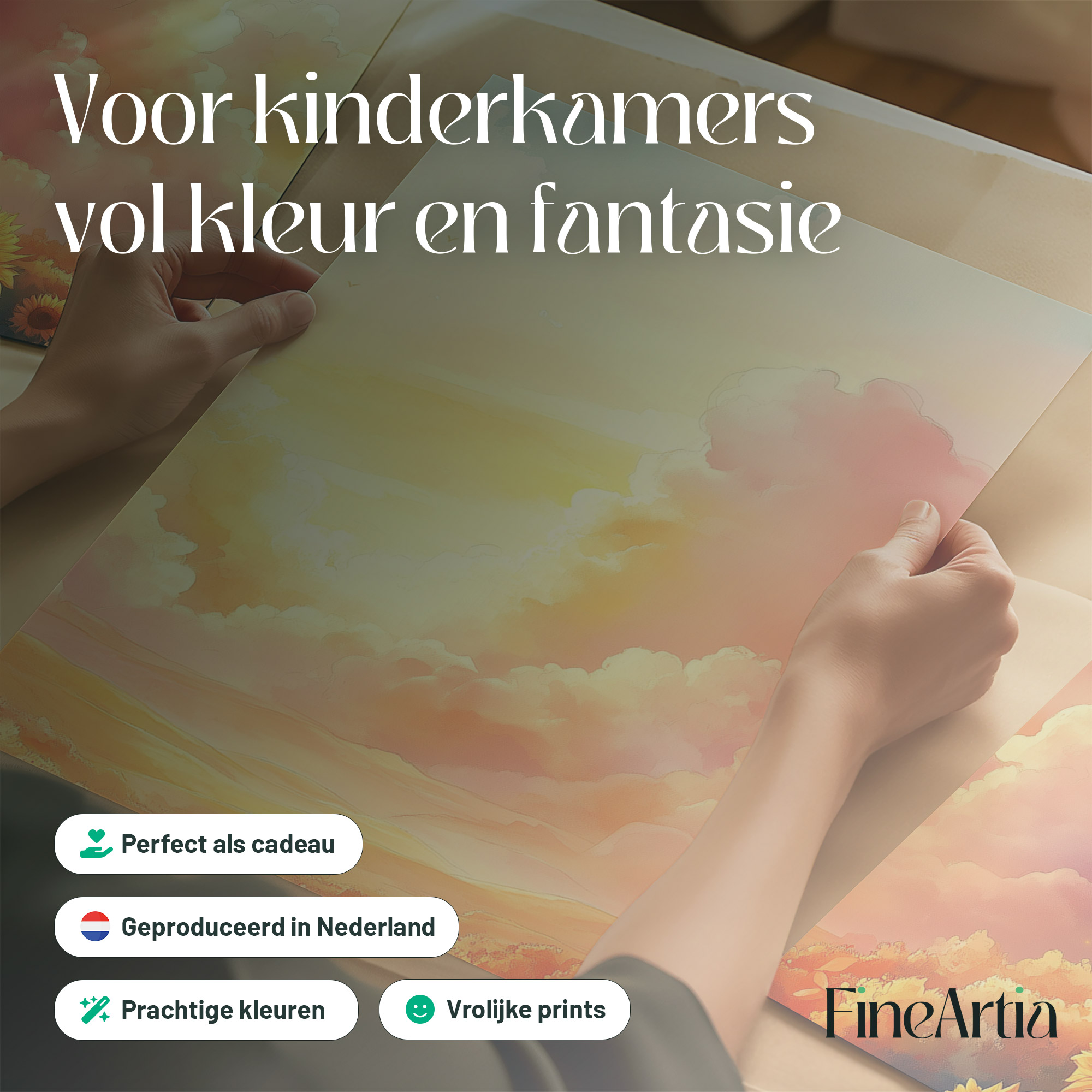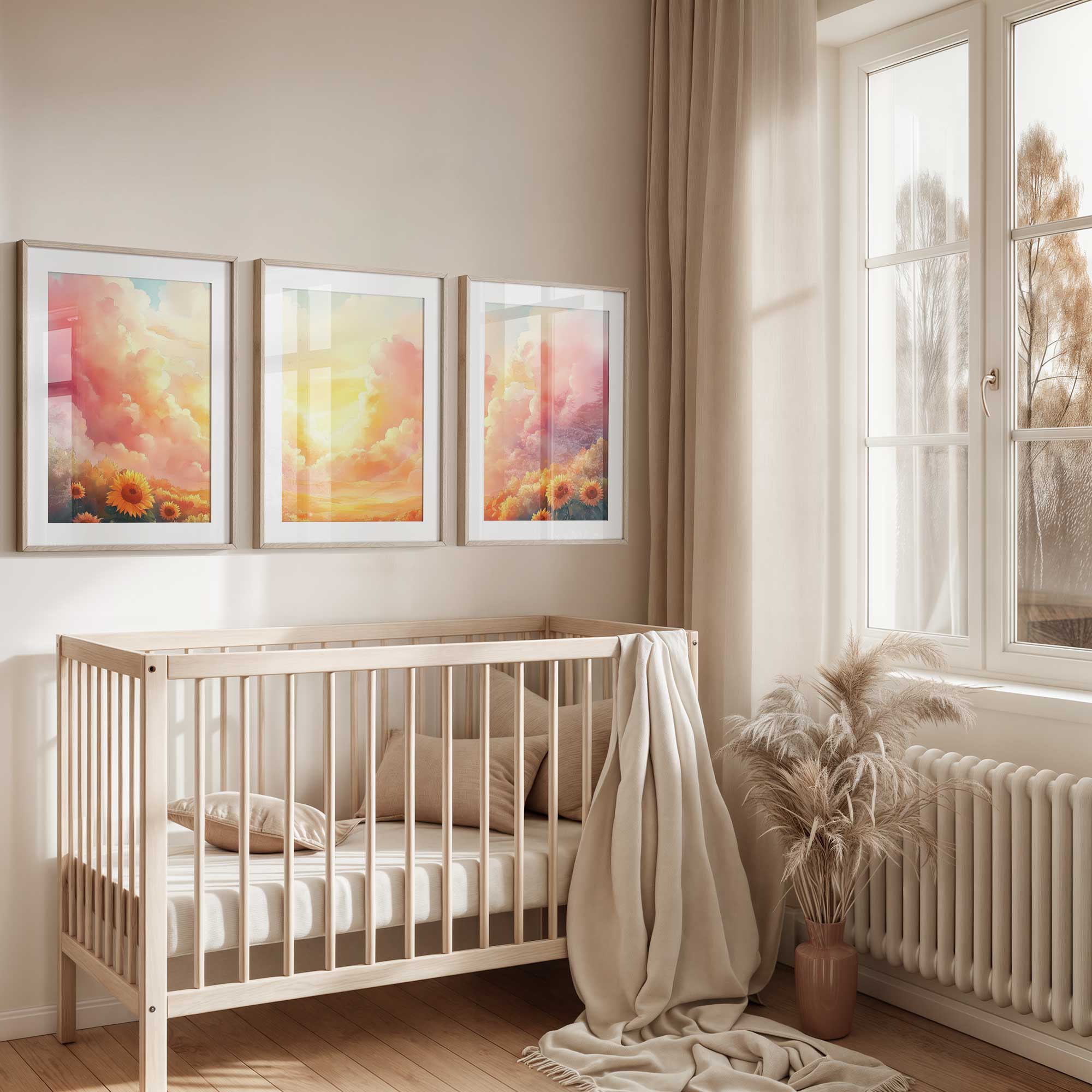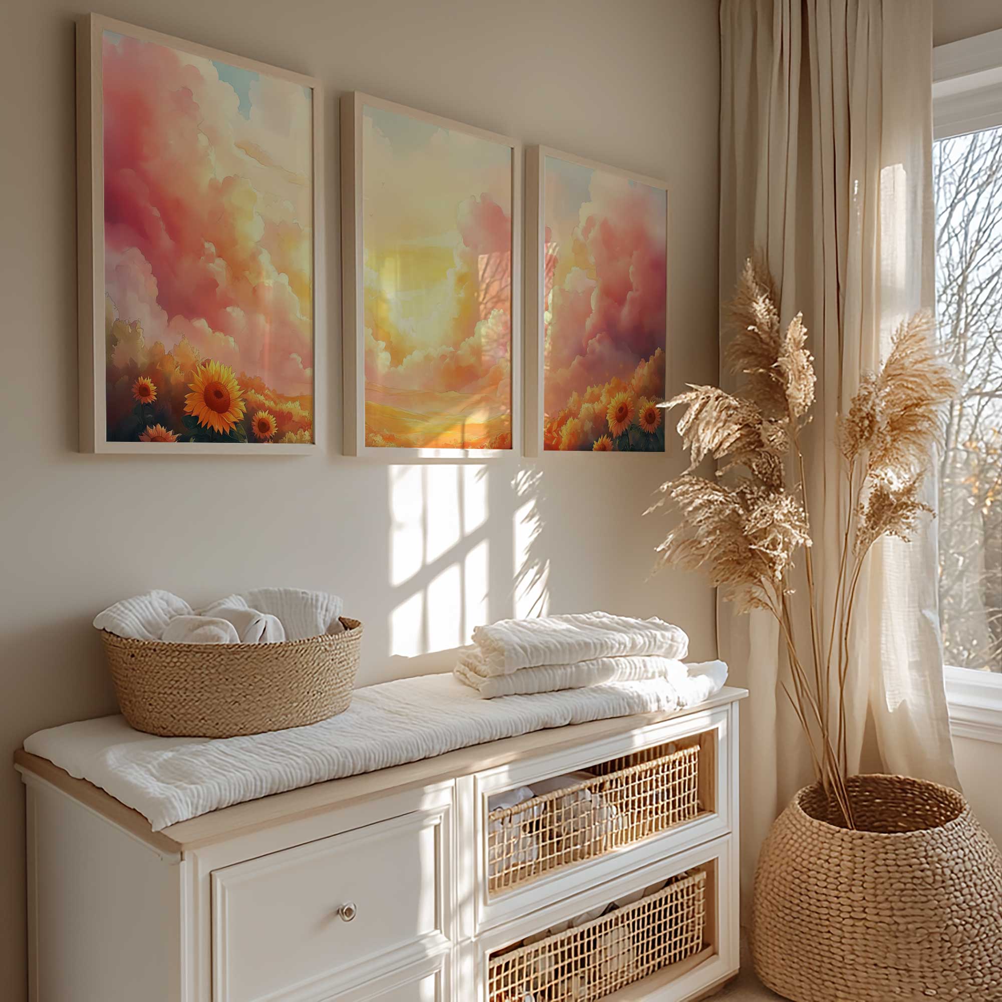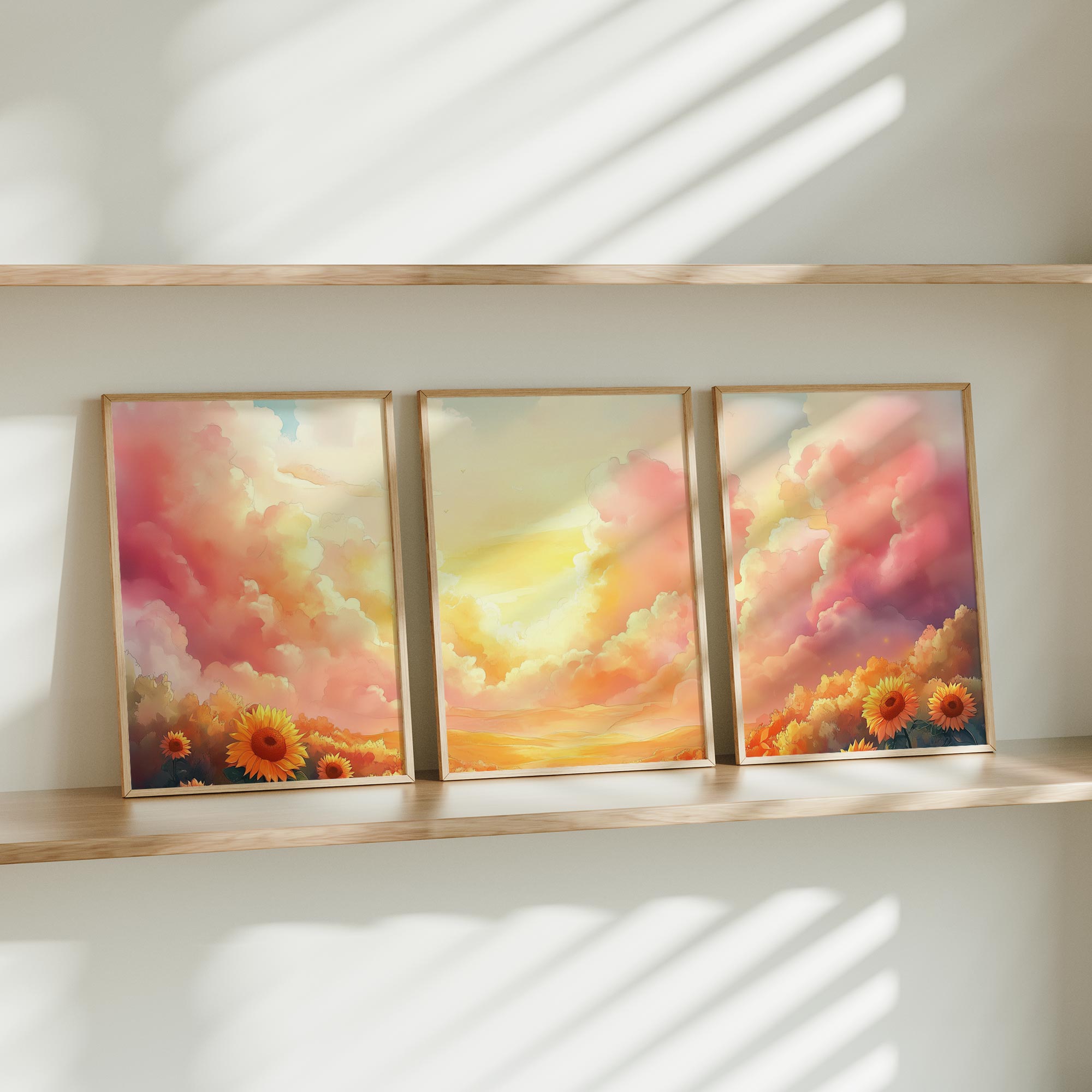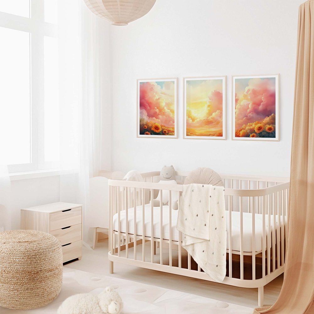 Terug naar collectie / Kinderkamer posters / Bloemen posters / Zonnige Zonnebloemen in Dromerig Pastel Landschap