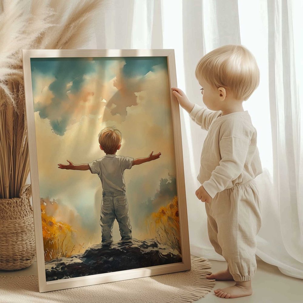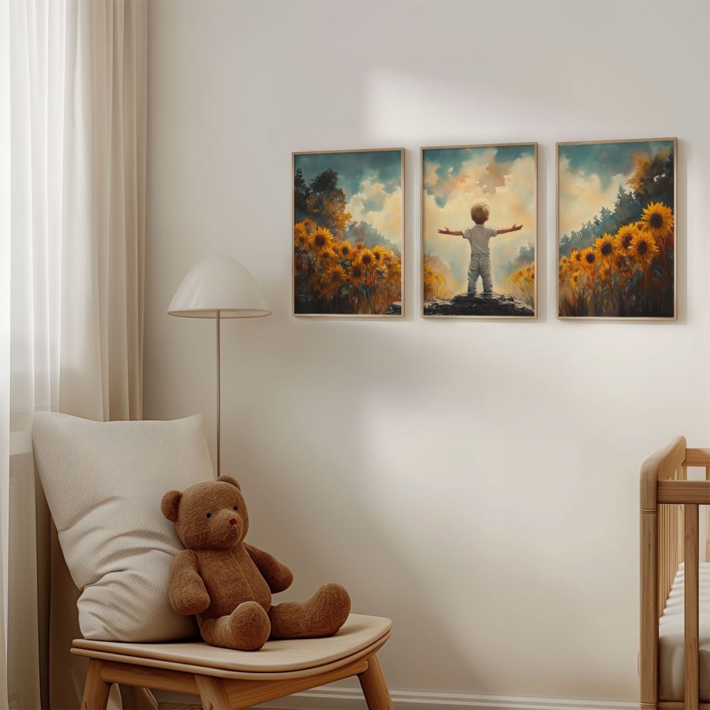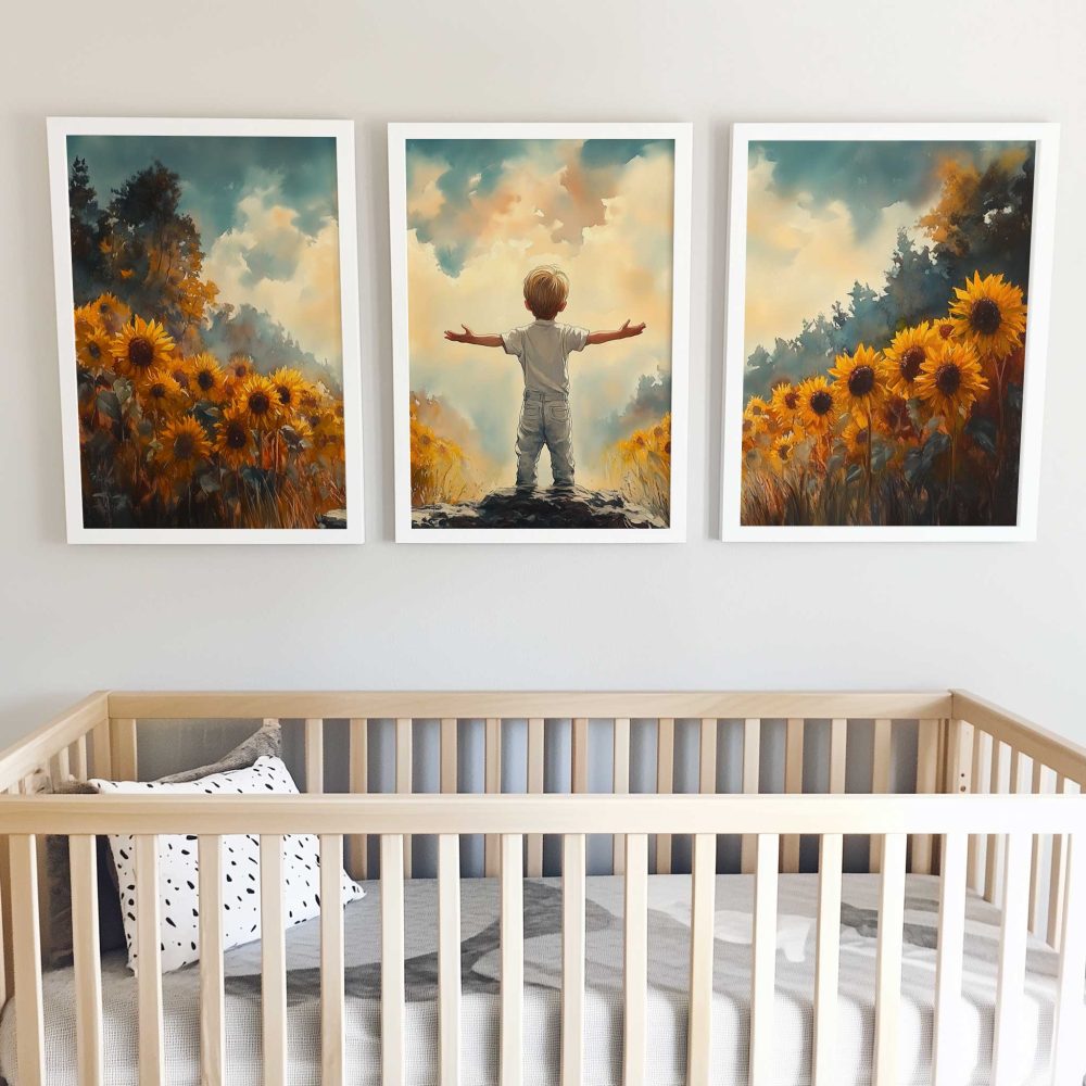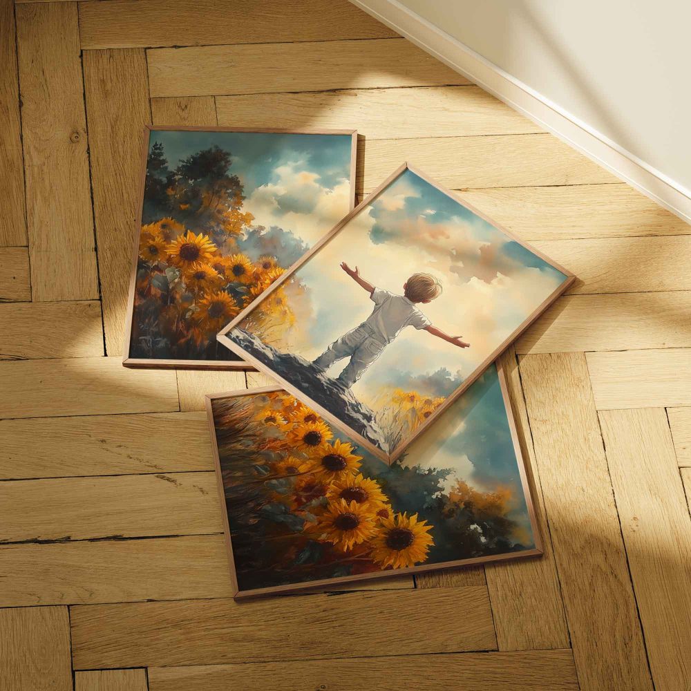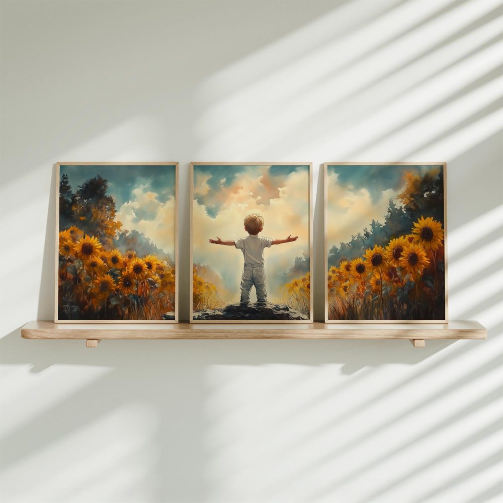 Terug naar collectie / Kinderkamer posters / Bloemen posters / Zonnige Zonnebloemveld Droom – Jongen in Geel