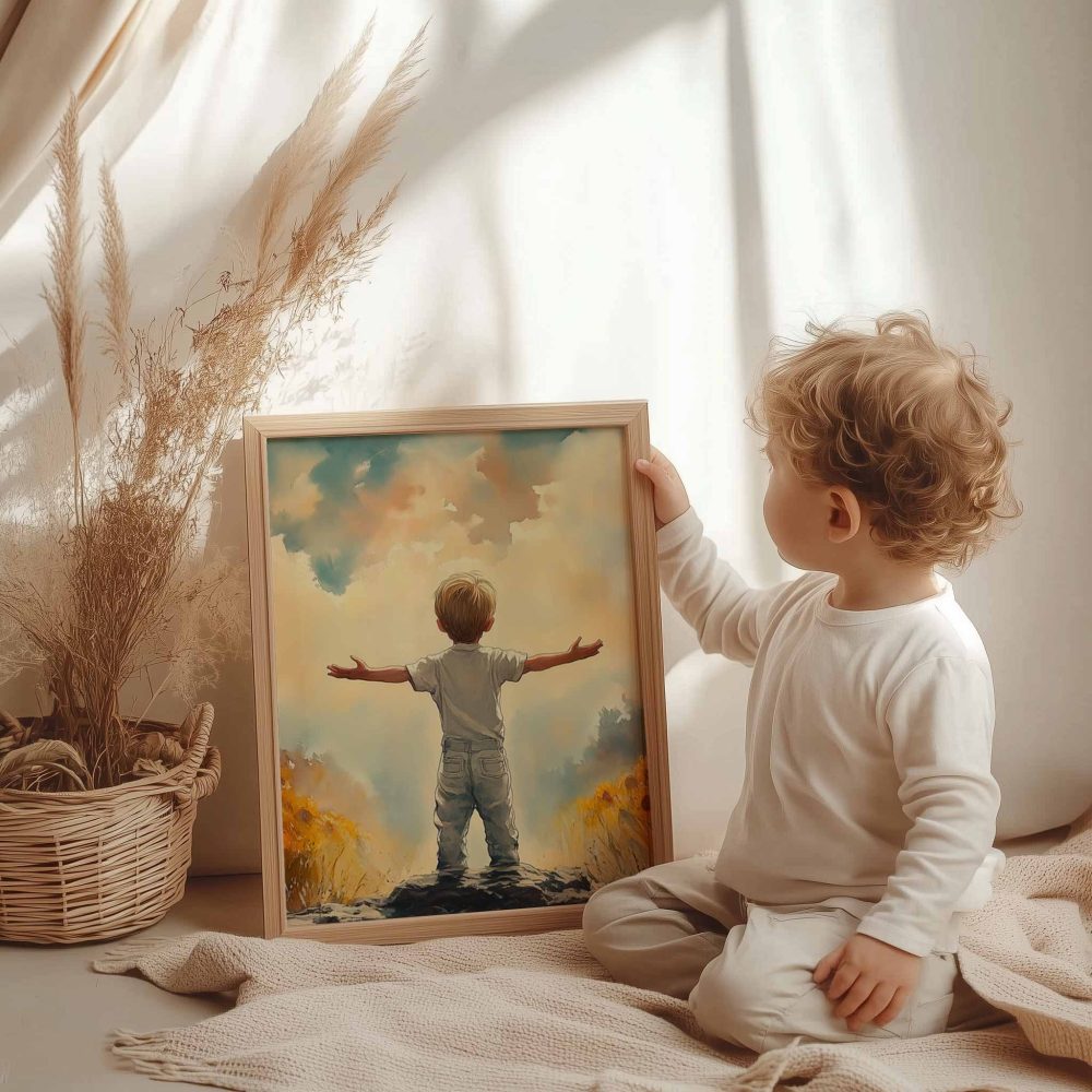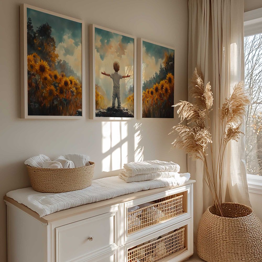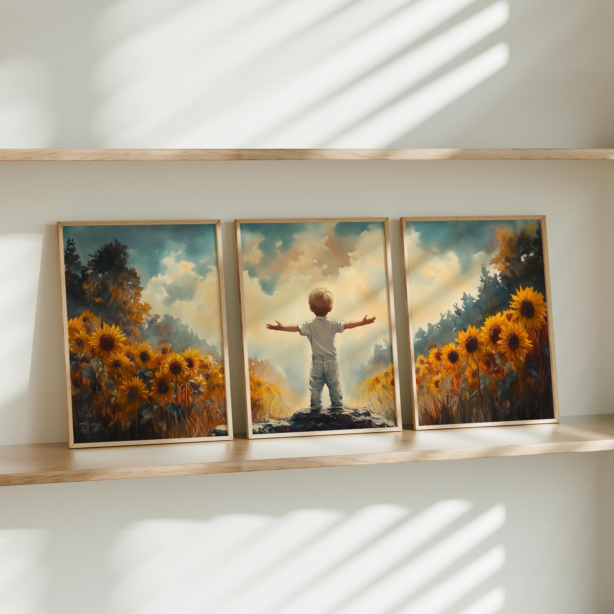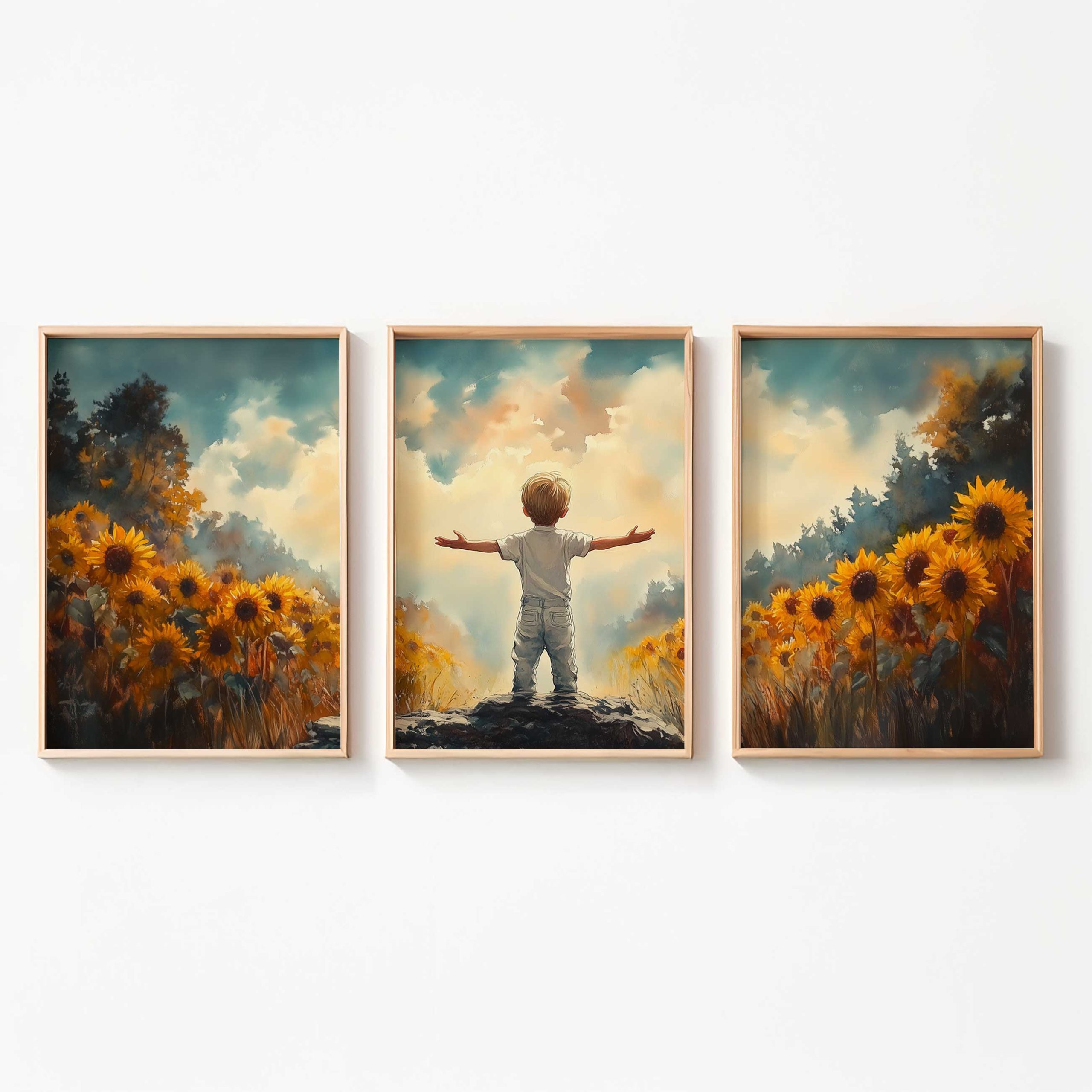 Terug naar collectie / Kinderkamer posters / Bloemen posters / Zonnige Zonnebloemveld Droom – Jongen in Geel