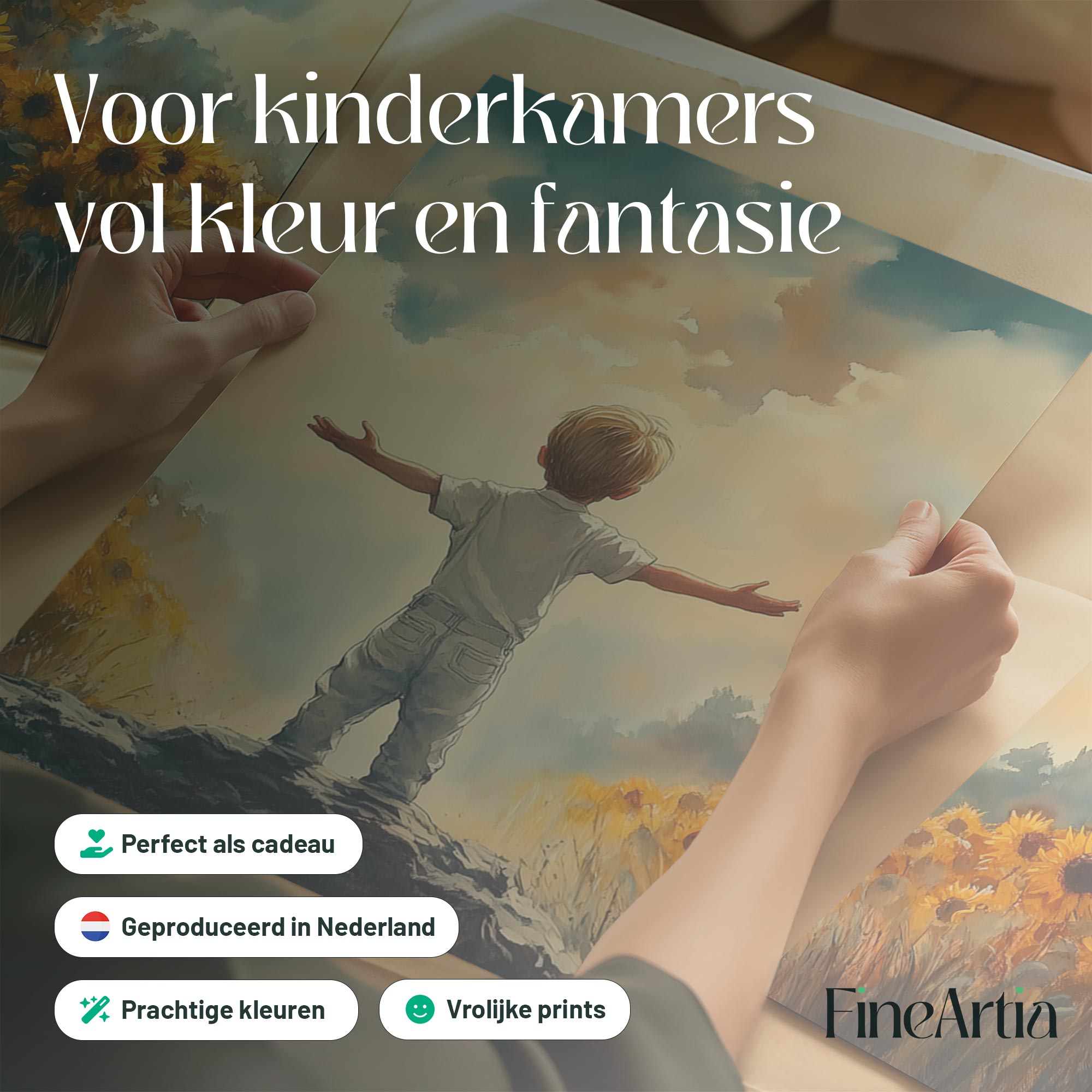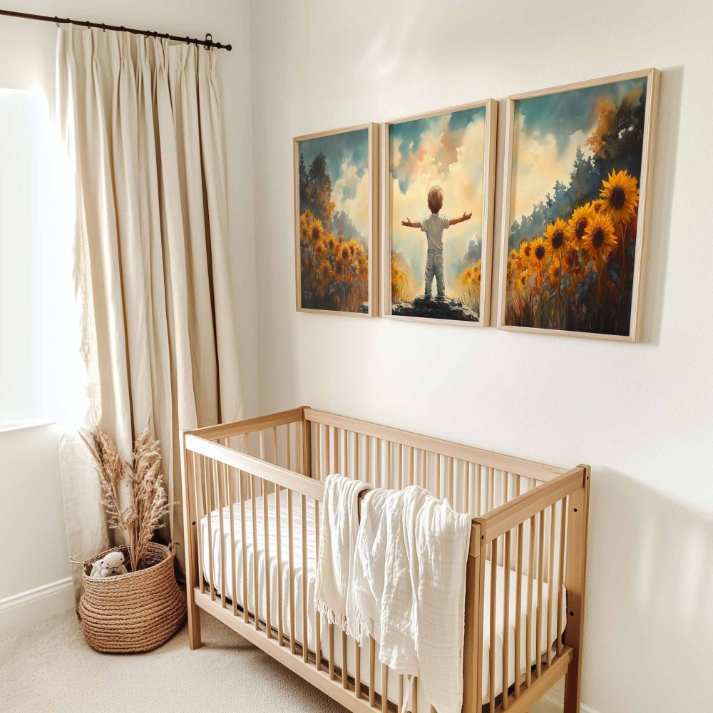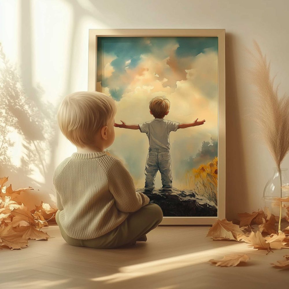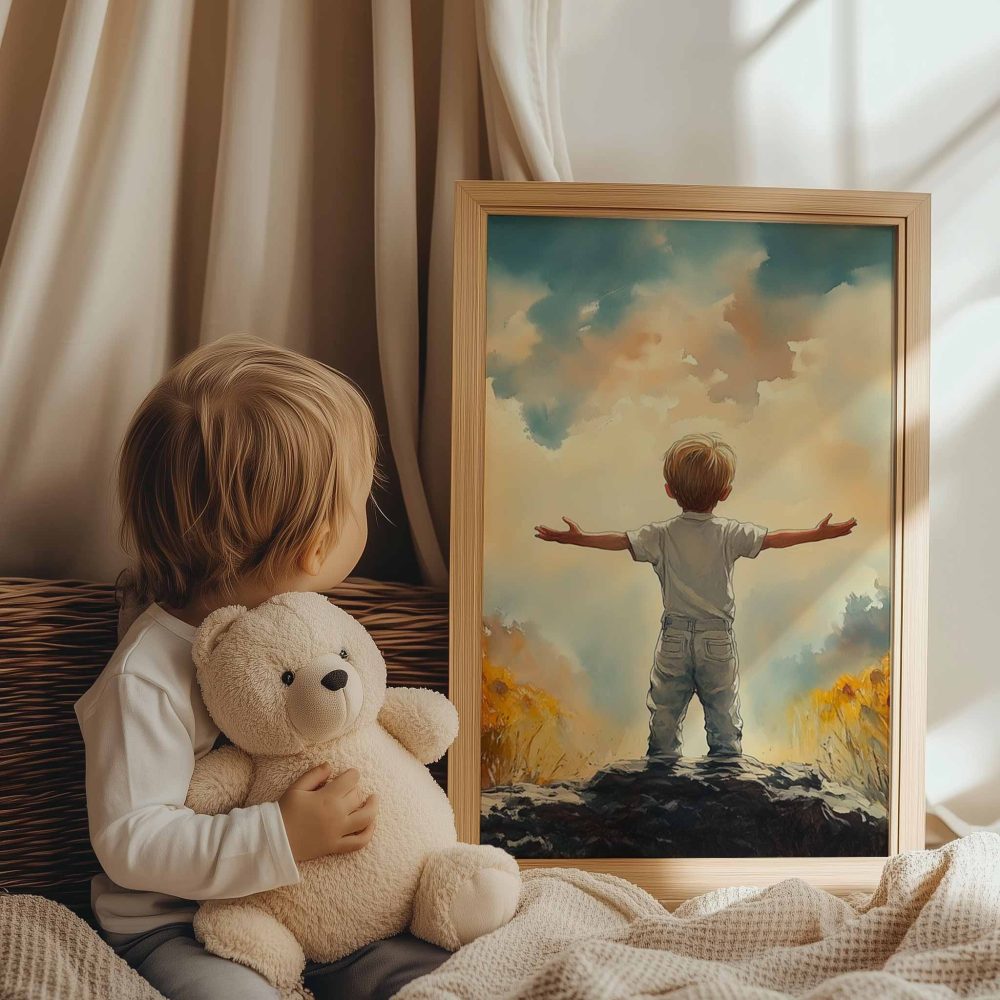 Terug naar collectie / Kinderkamer posters / Bloemen posters / Zonnige Zonnebloemveld Droom – Jongen in Geel