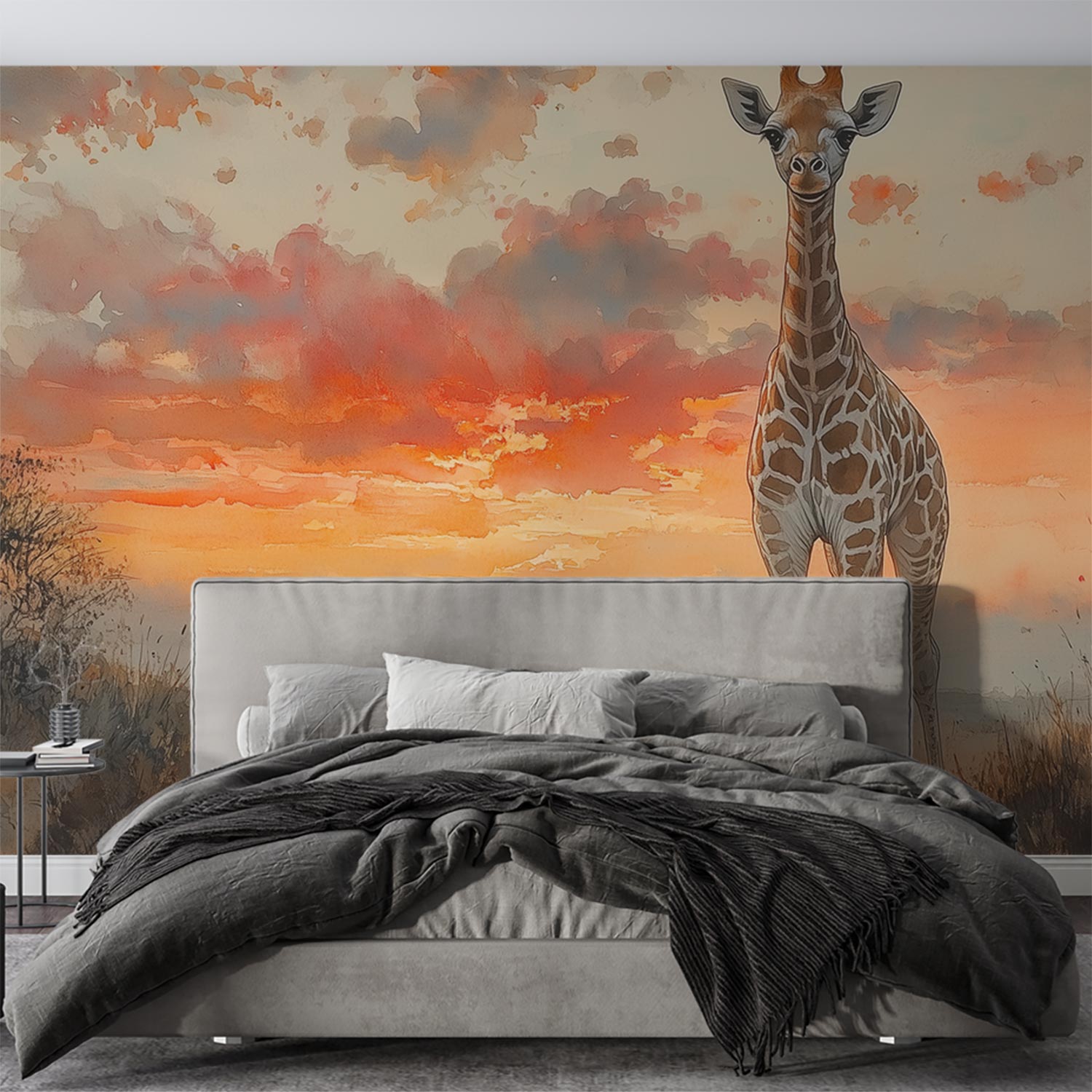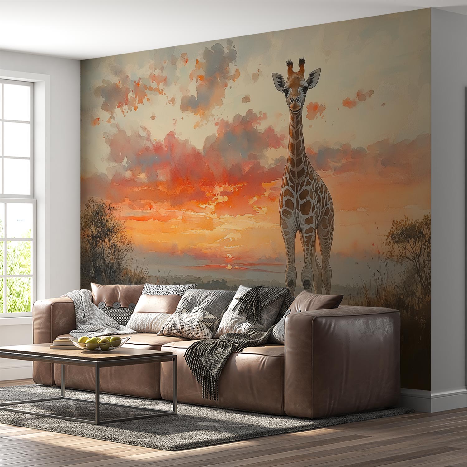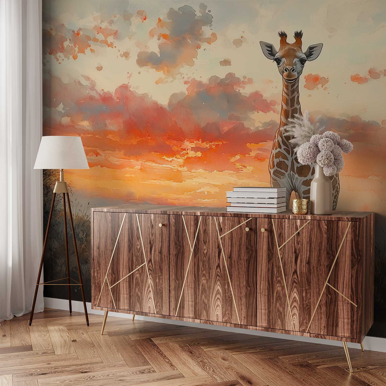 Terug naar collectie / Behang / Zonsondergang met majestueuze giraffe behang