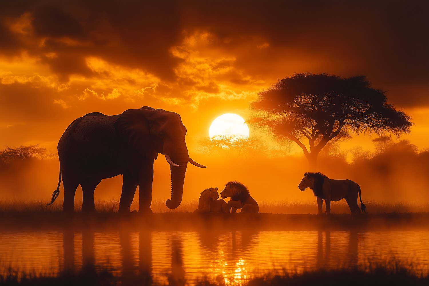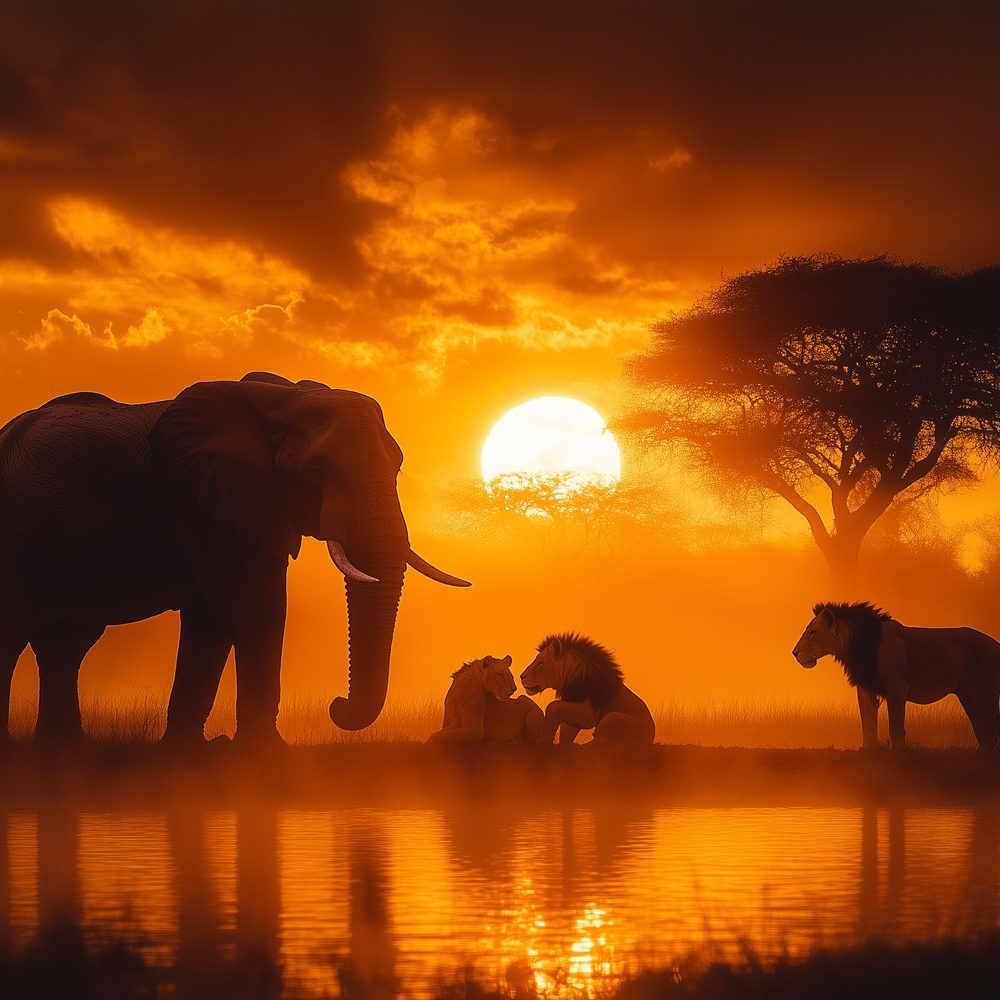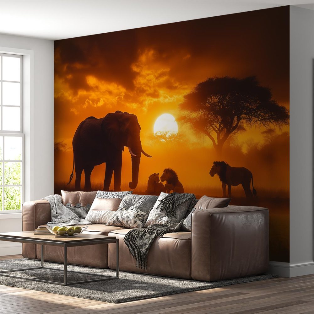 Terug naar collectie / Behang / Zonsondergang met olifanten en leeuwen behang