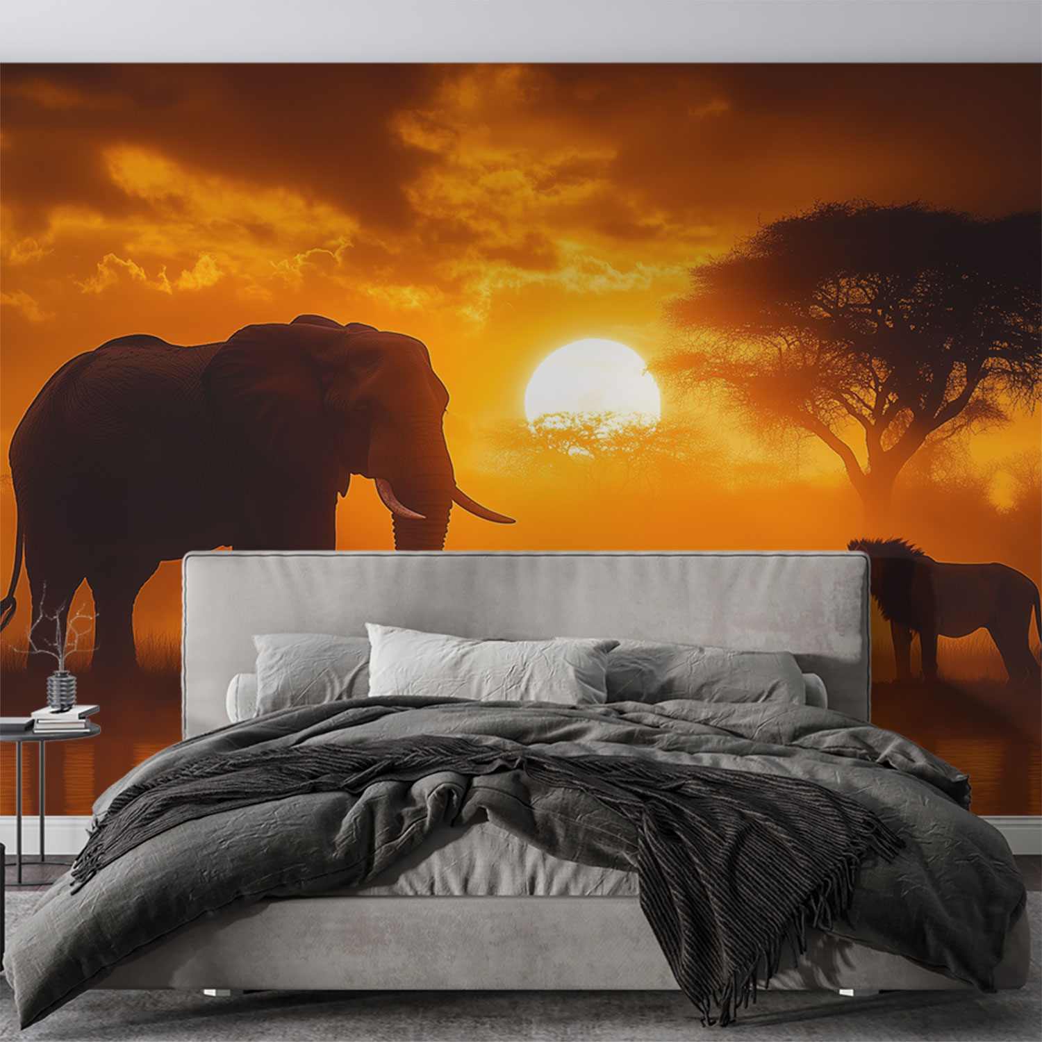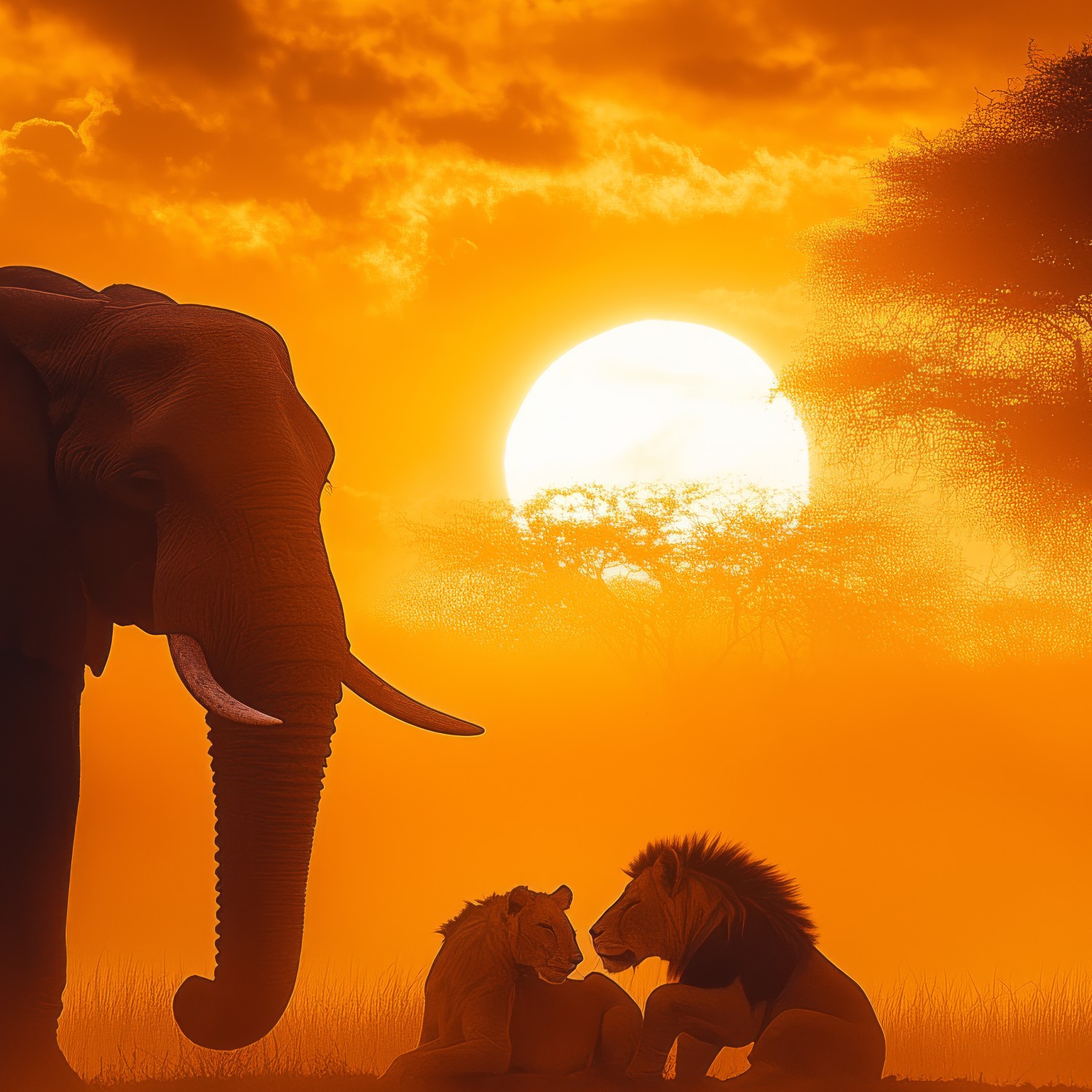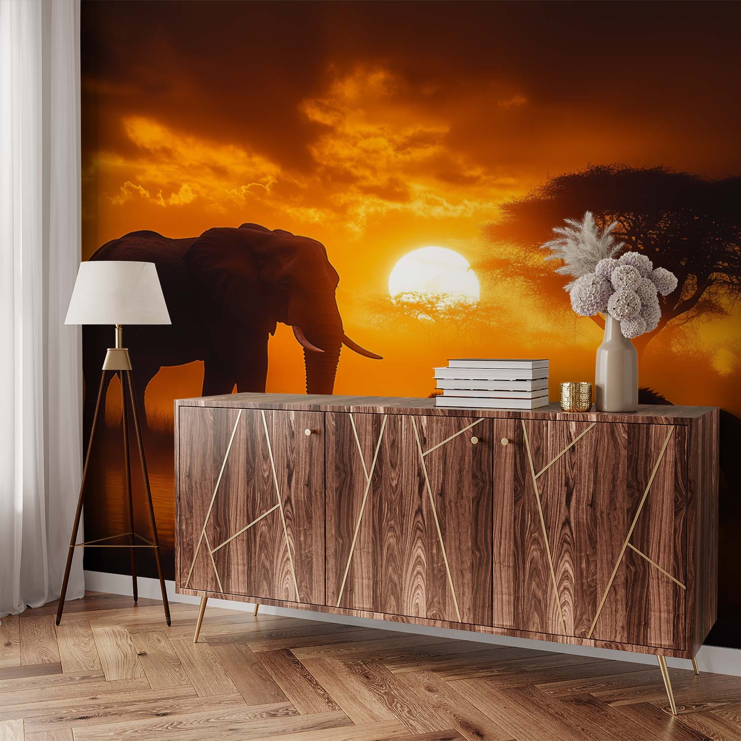 Zonsondergang met olifanten en leeuwen behang