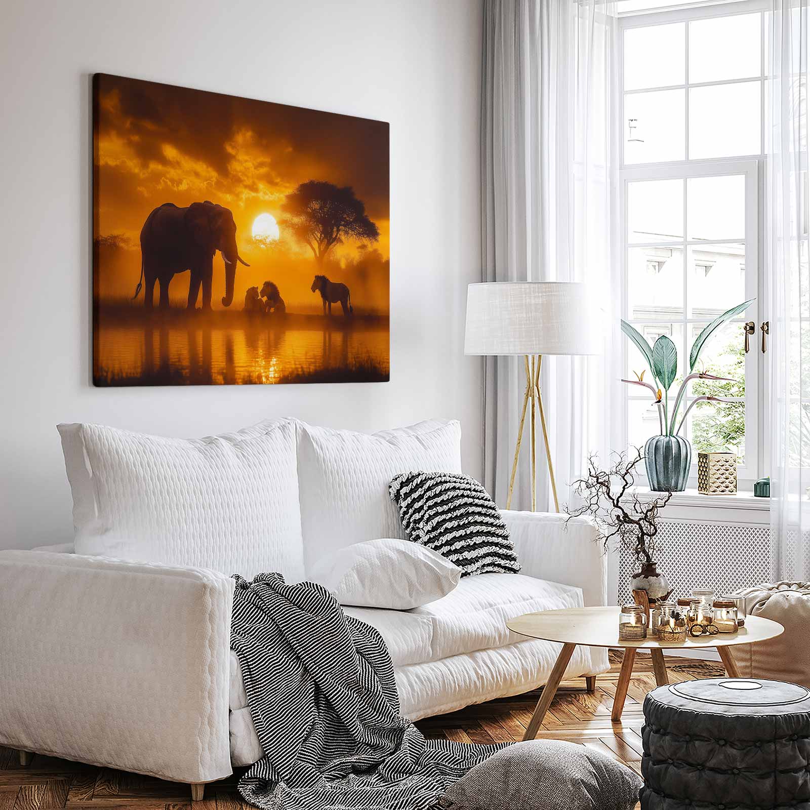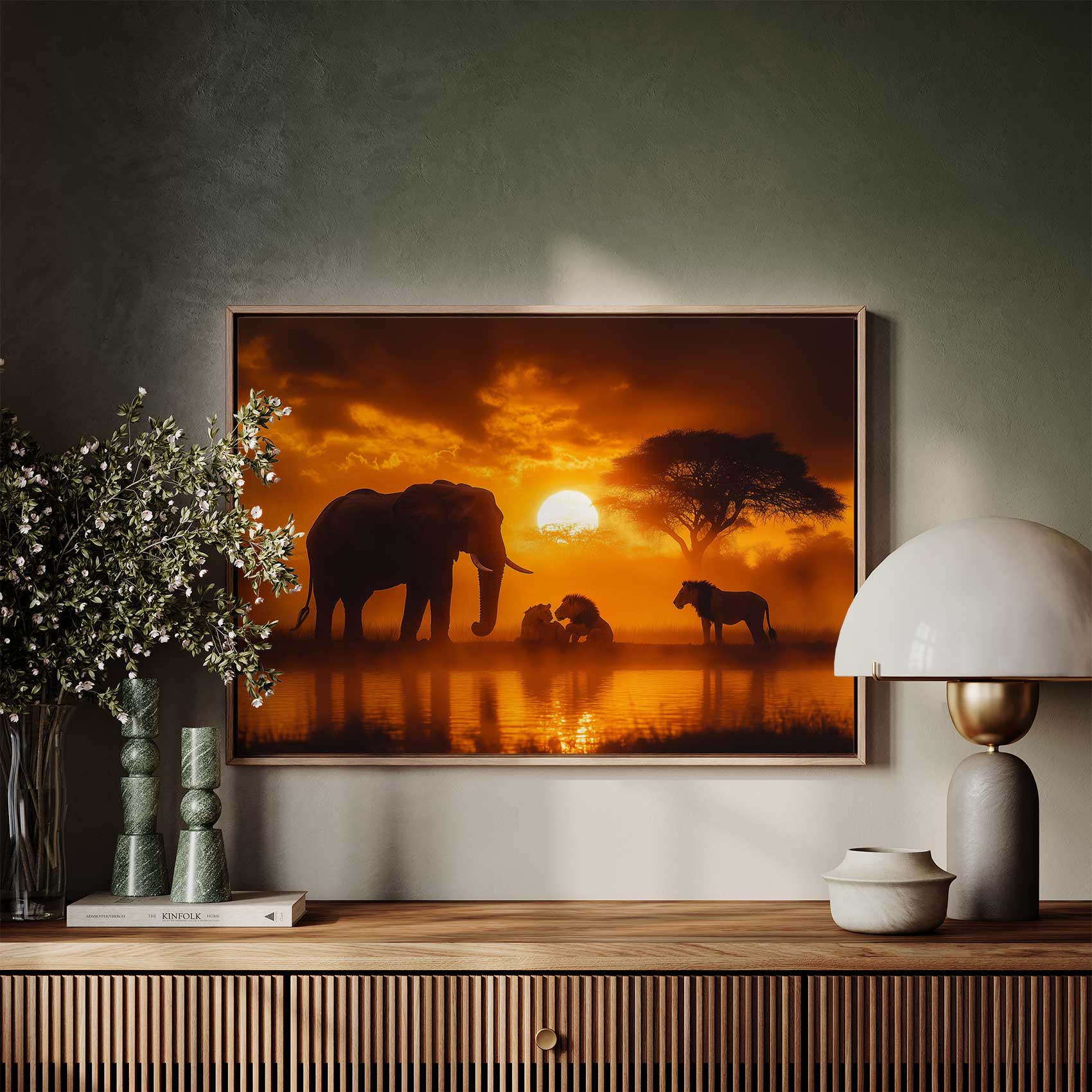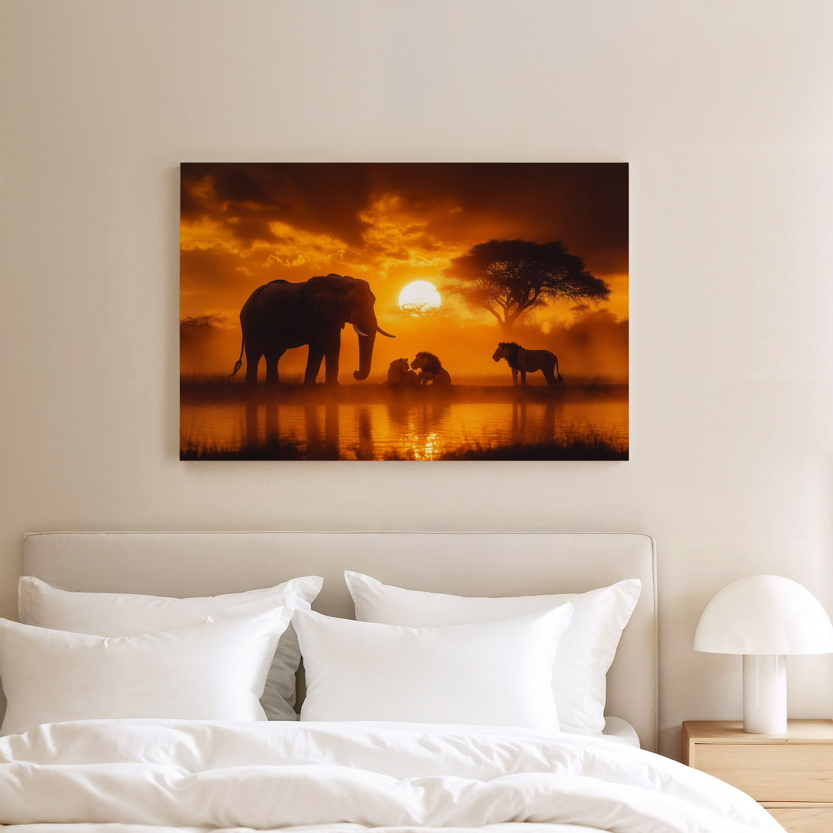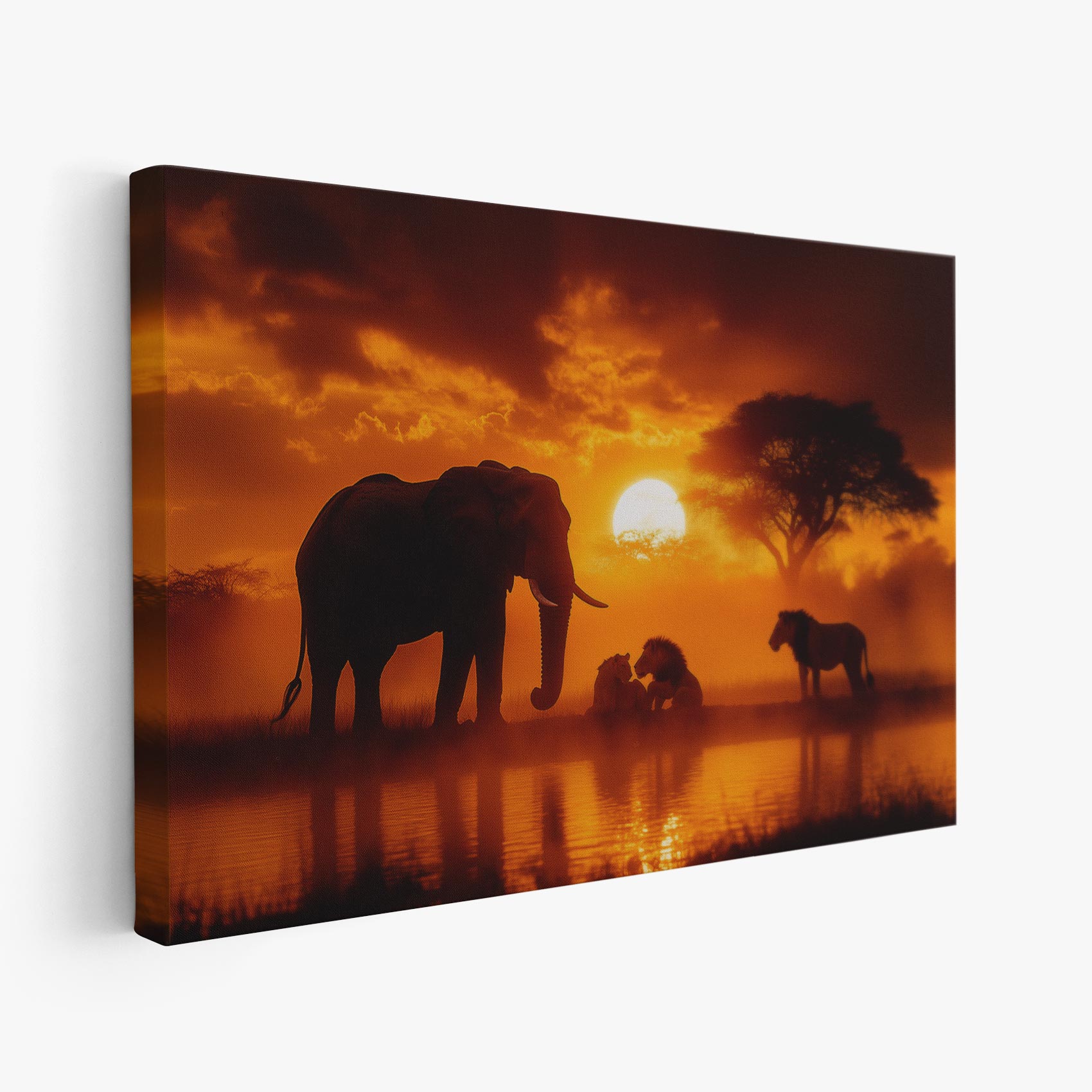 Terug naar collectie / Schilderijen / Dieren Schilderij / Zonsondergang met olifanten en leeuwen