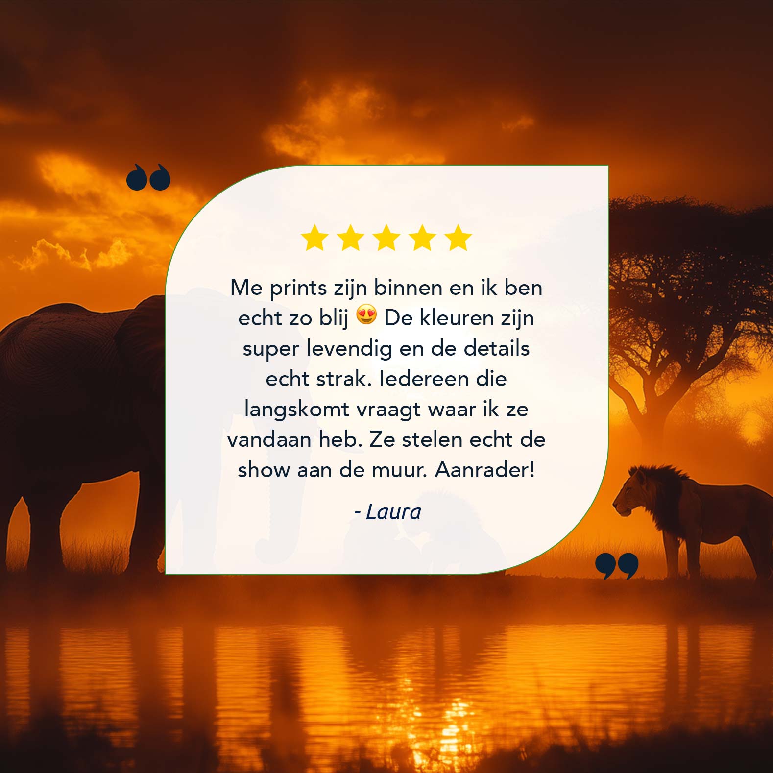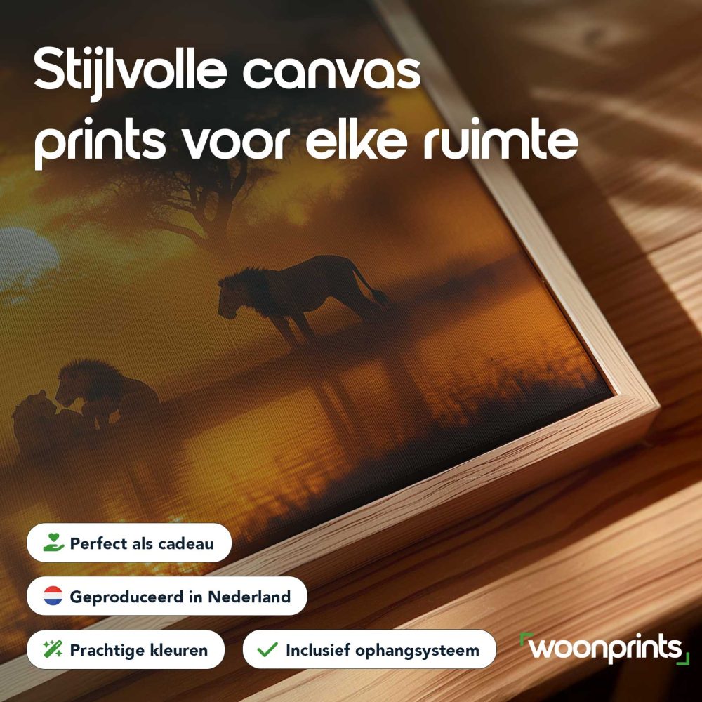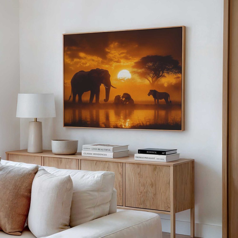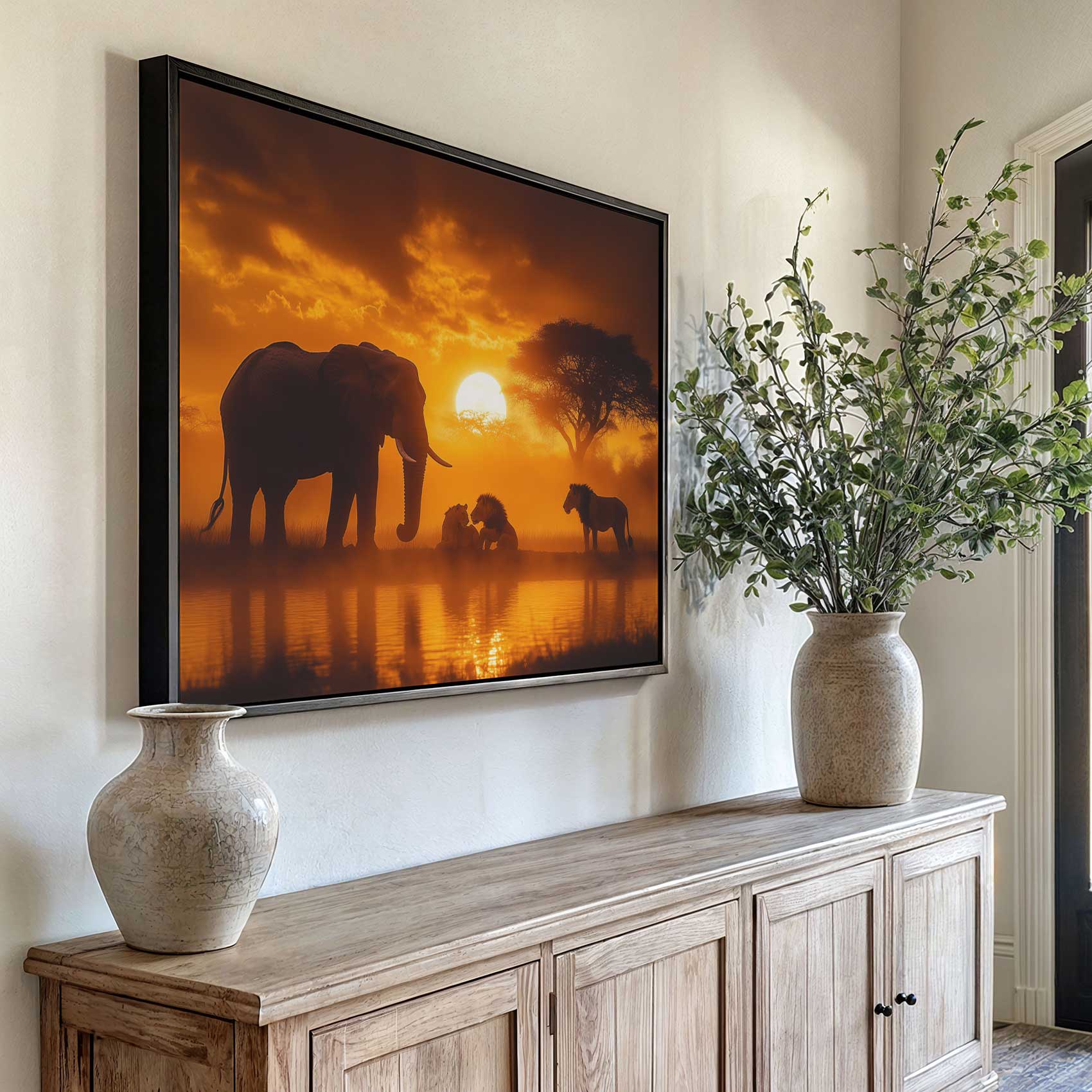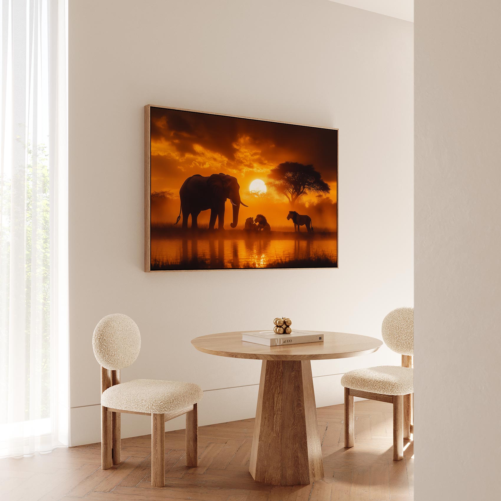 Terug naar collectie / Schilderijen / Dieren Schilderij / Zonsondergang met olifanten en leeuwen
