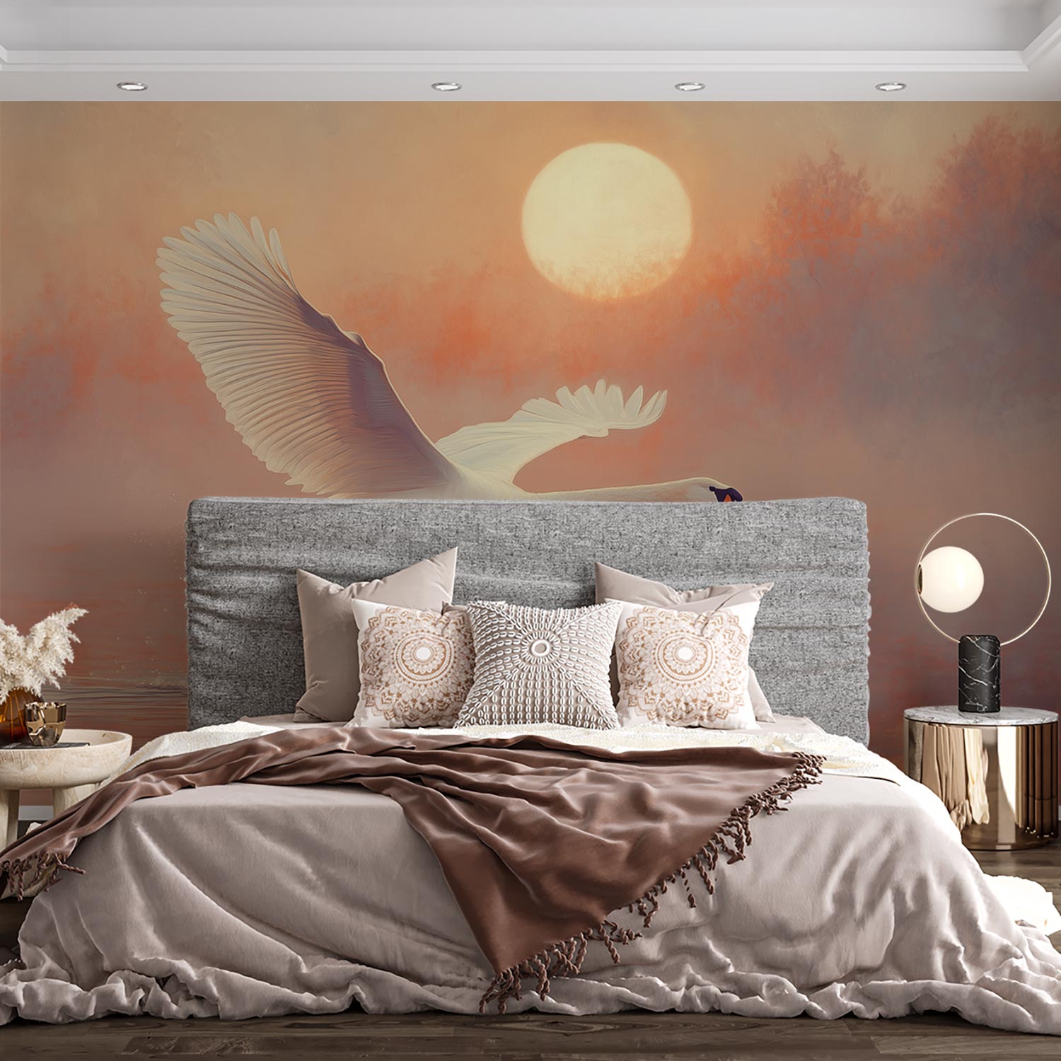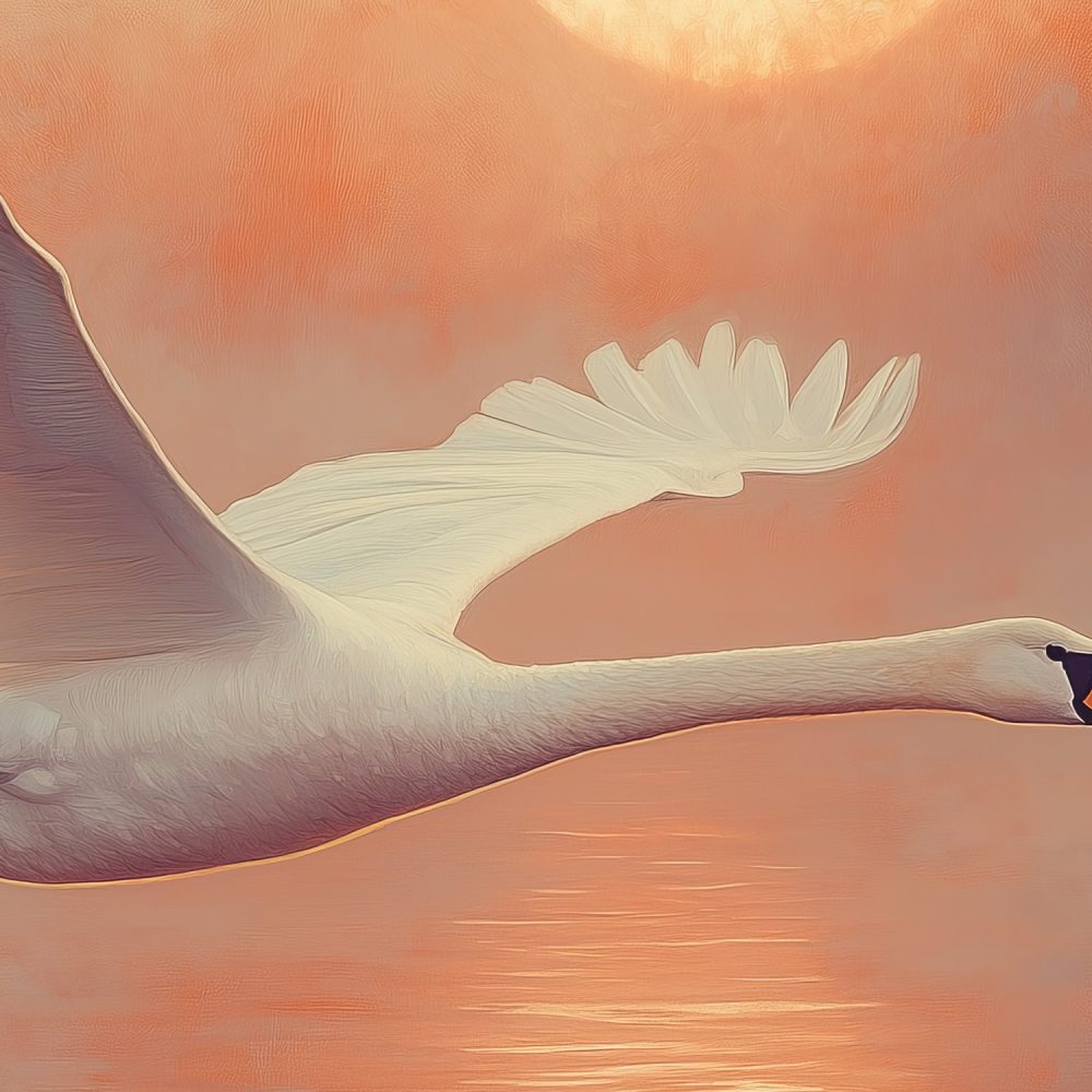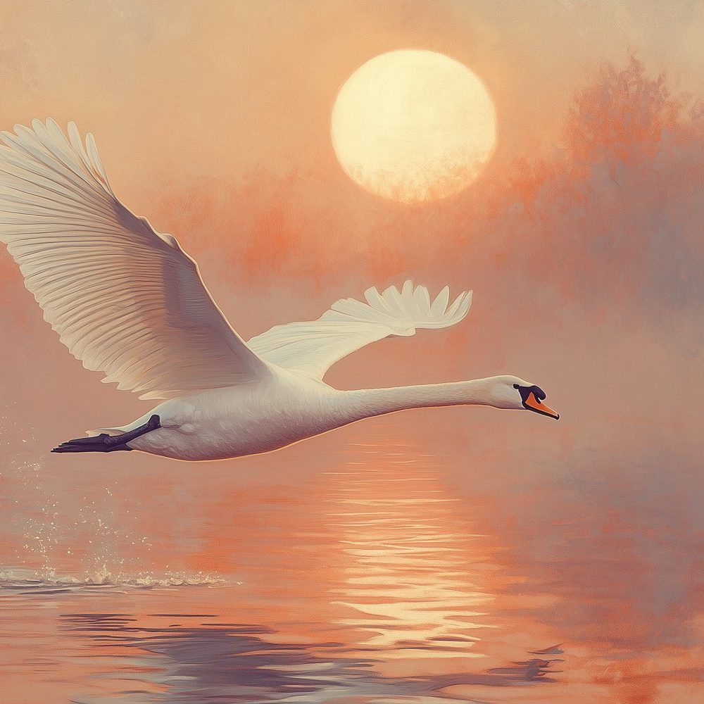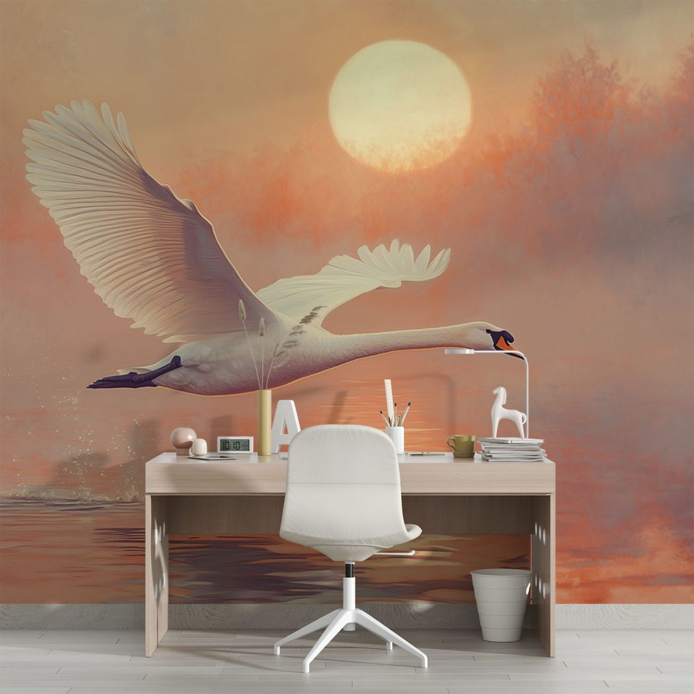 Zonsondergang met vliegende zwaan behang