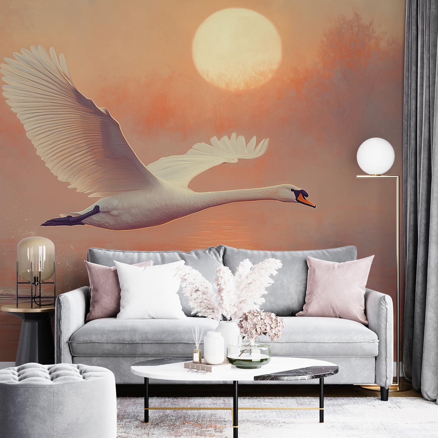 Terug naar collectie / Behang / Zonsondergang met vliegende zwaan behang