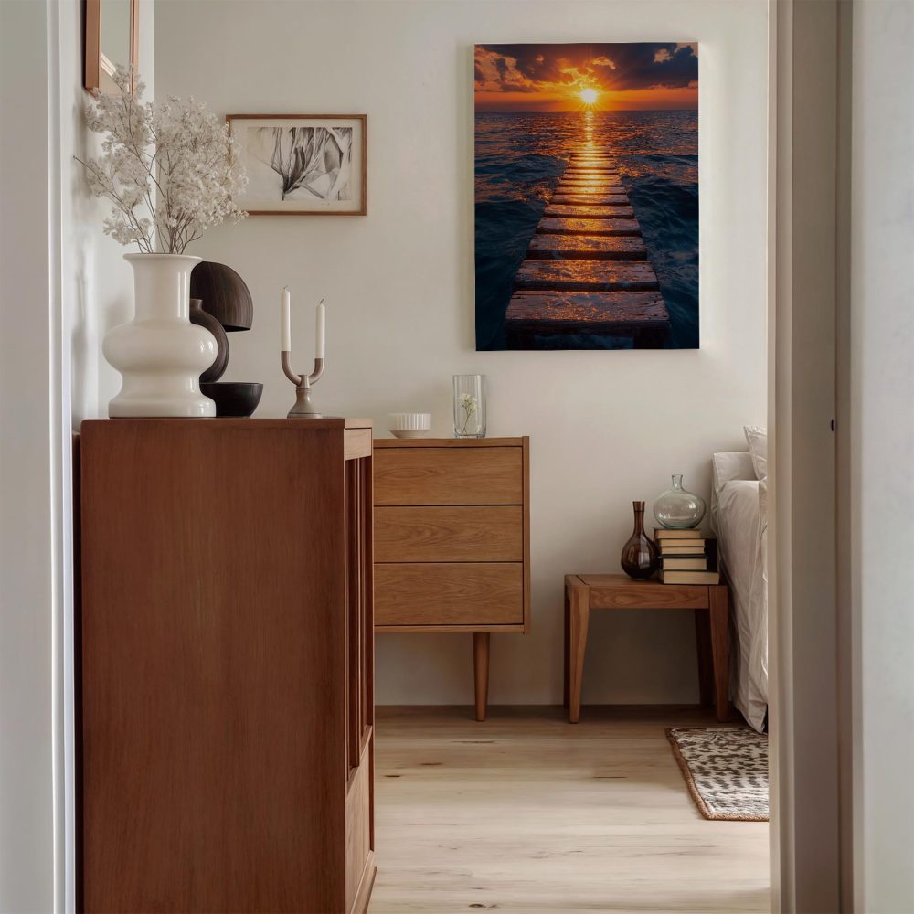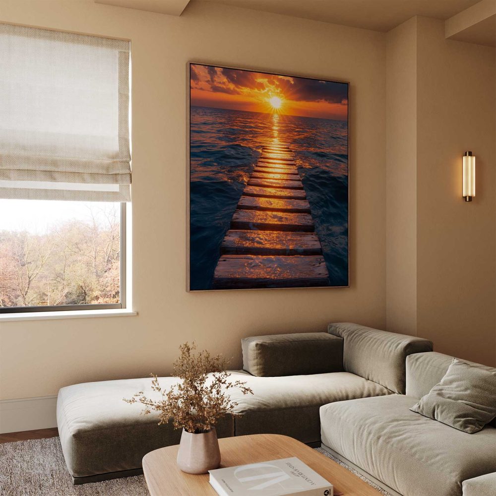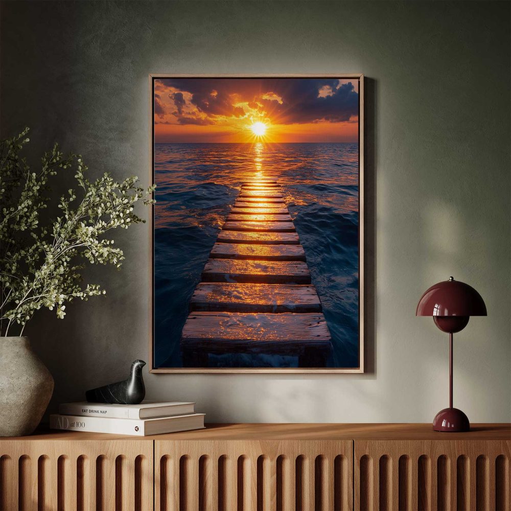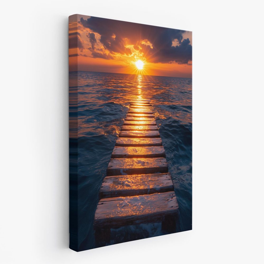 Terug naar collectie / Schilderijen / Fotografie Schilderij / Zonsondergang op houten pier