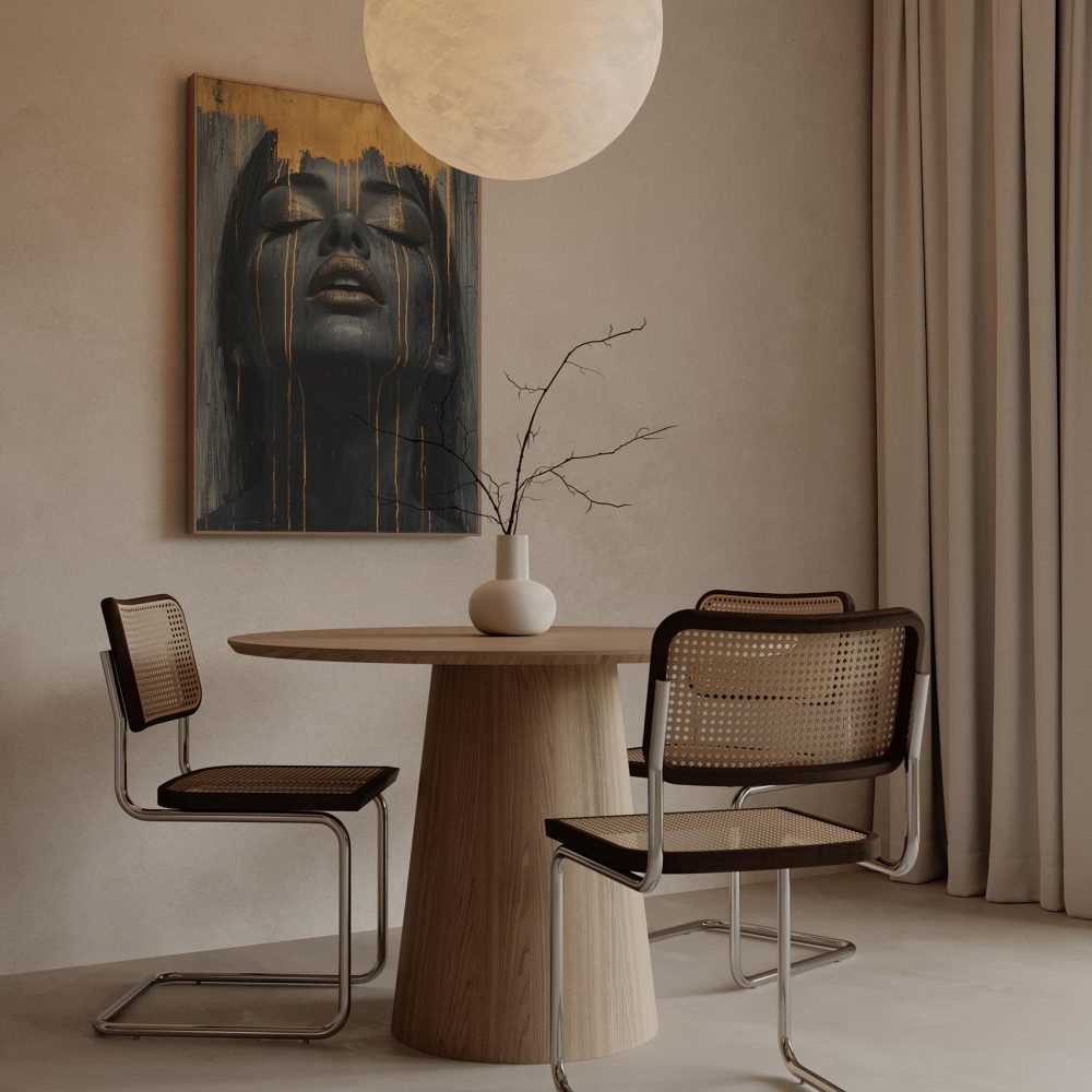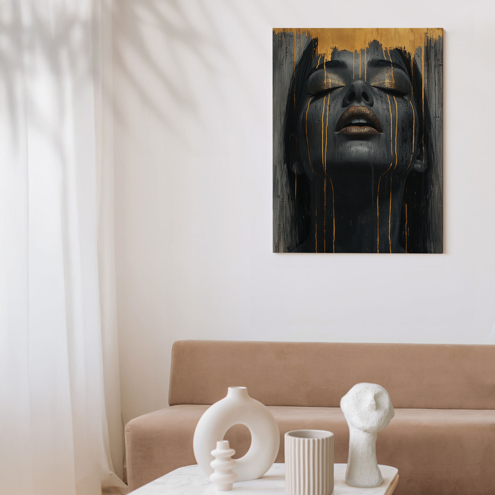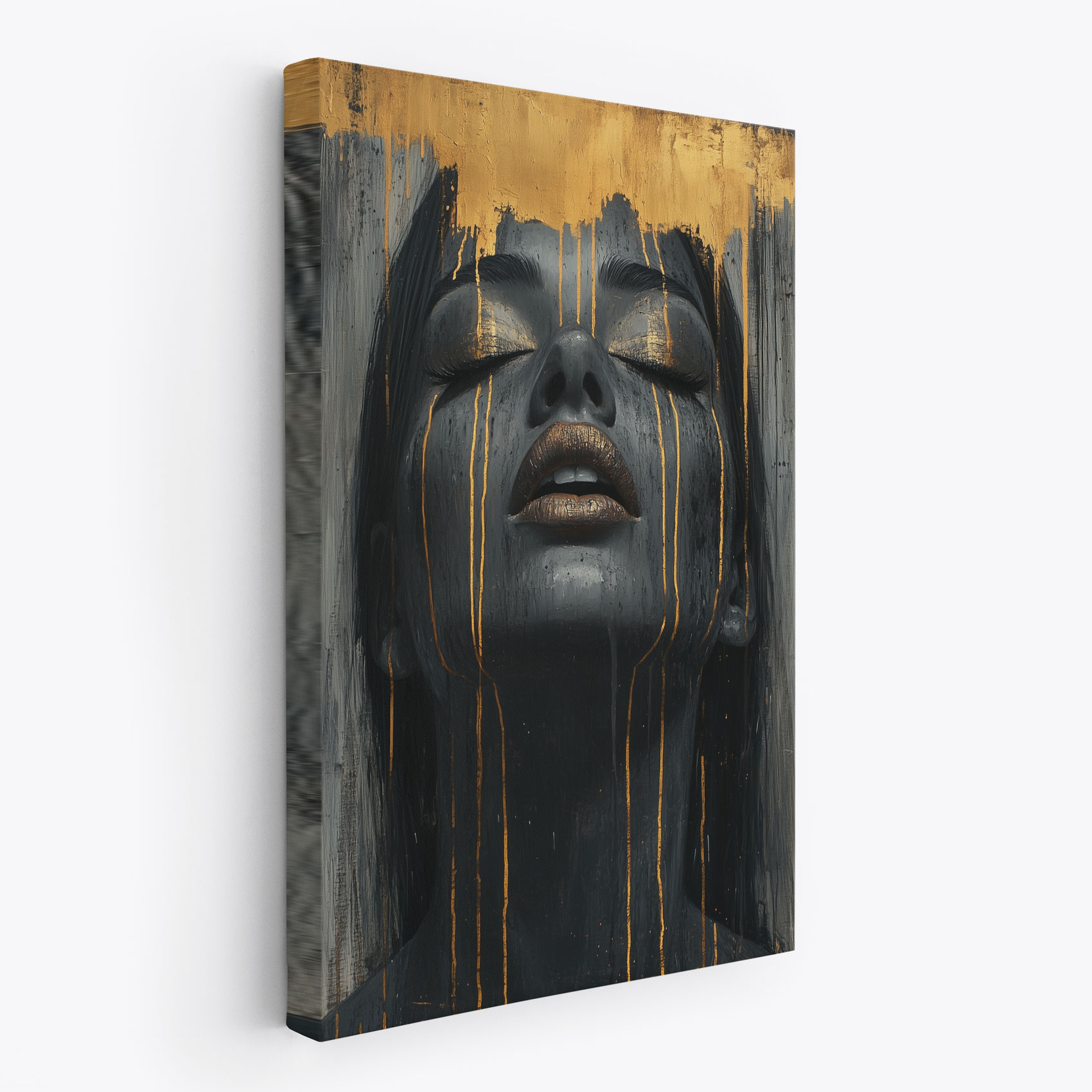 Terug naar collectie / Schilderijen / Abstract Schilderij / Zwart-gouden serene vrouwenportret
