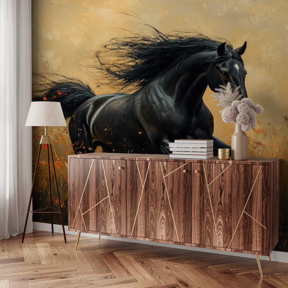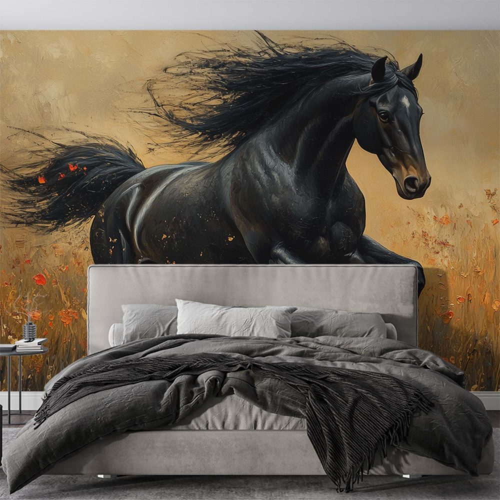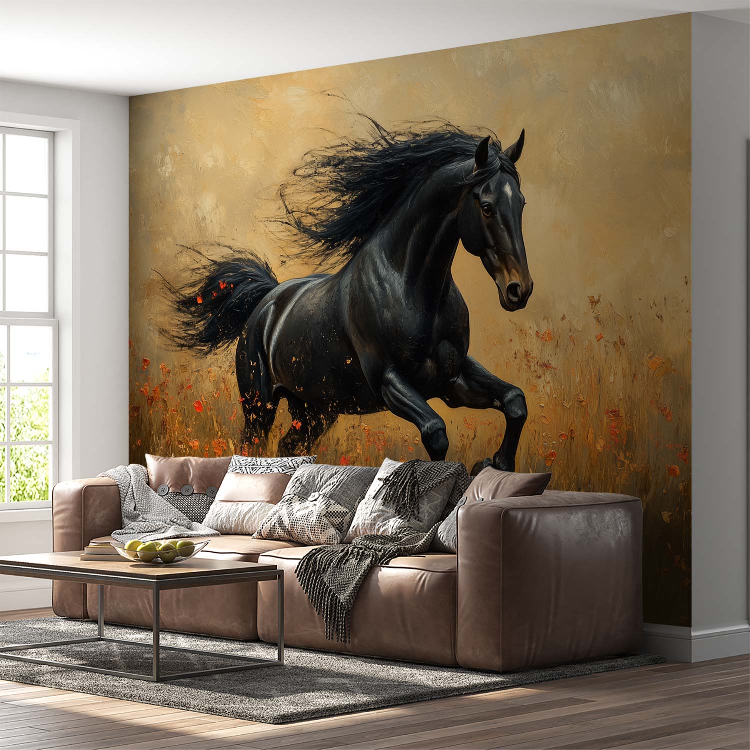 Terug naar collectie / Behang / Zwart paard in bloeiend veld behang