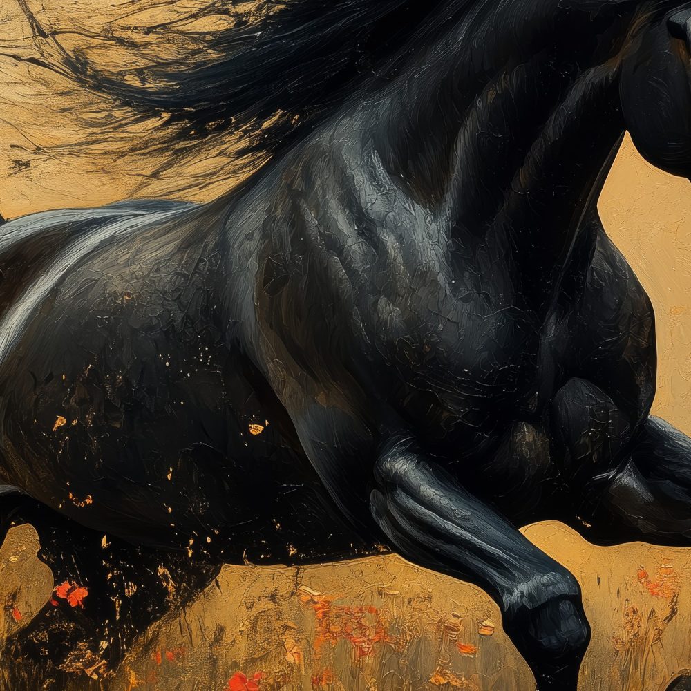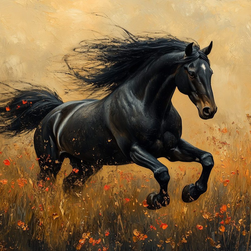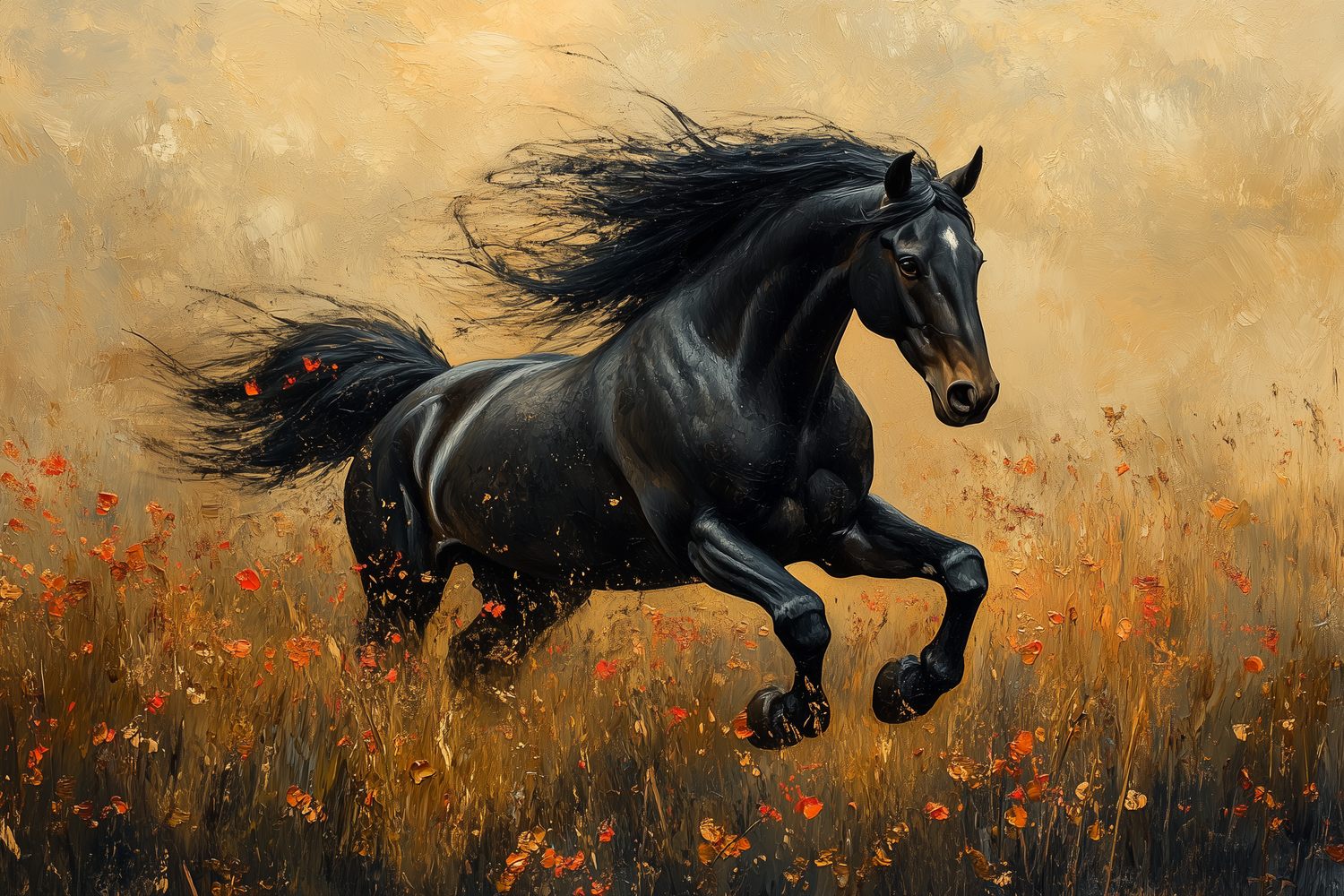 Terug naar collectie / Behang / Zwart paard in bloeiend veld behang