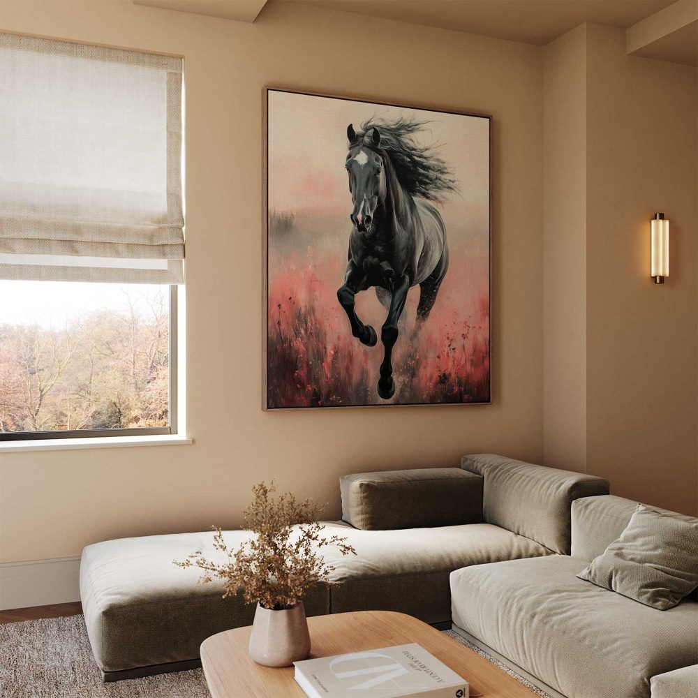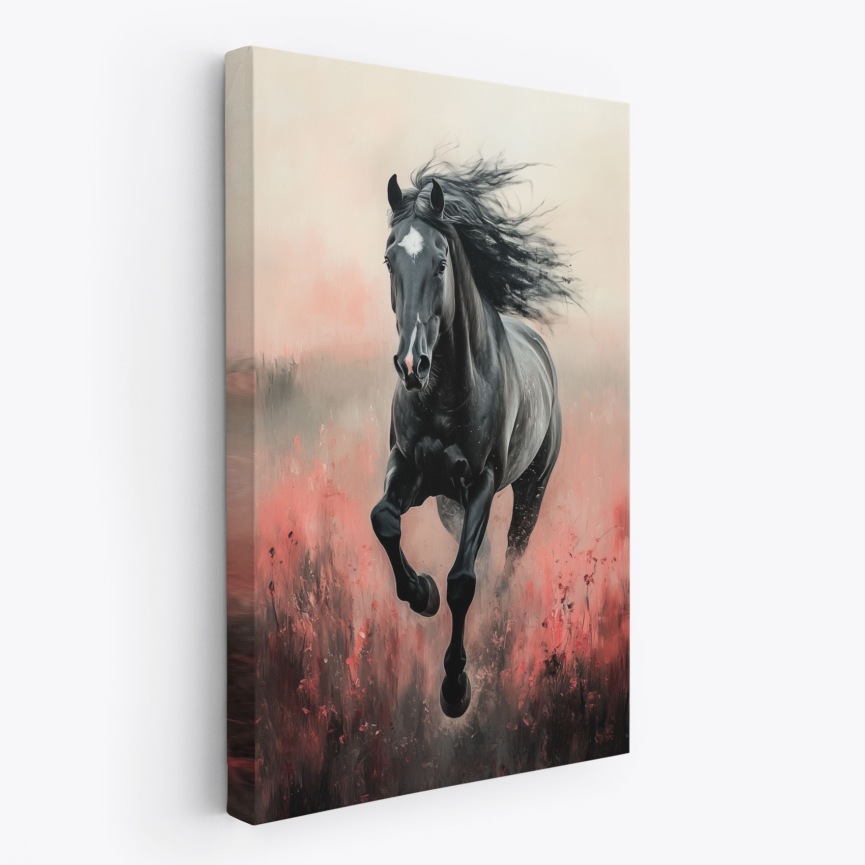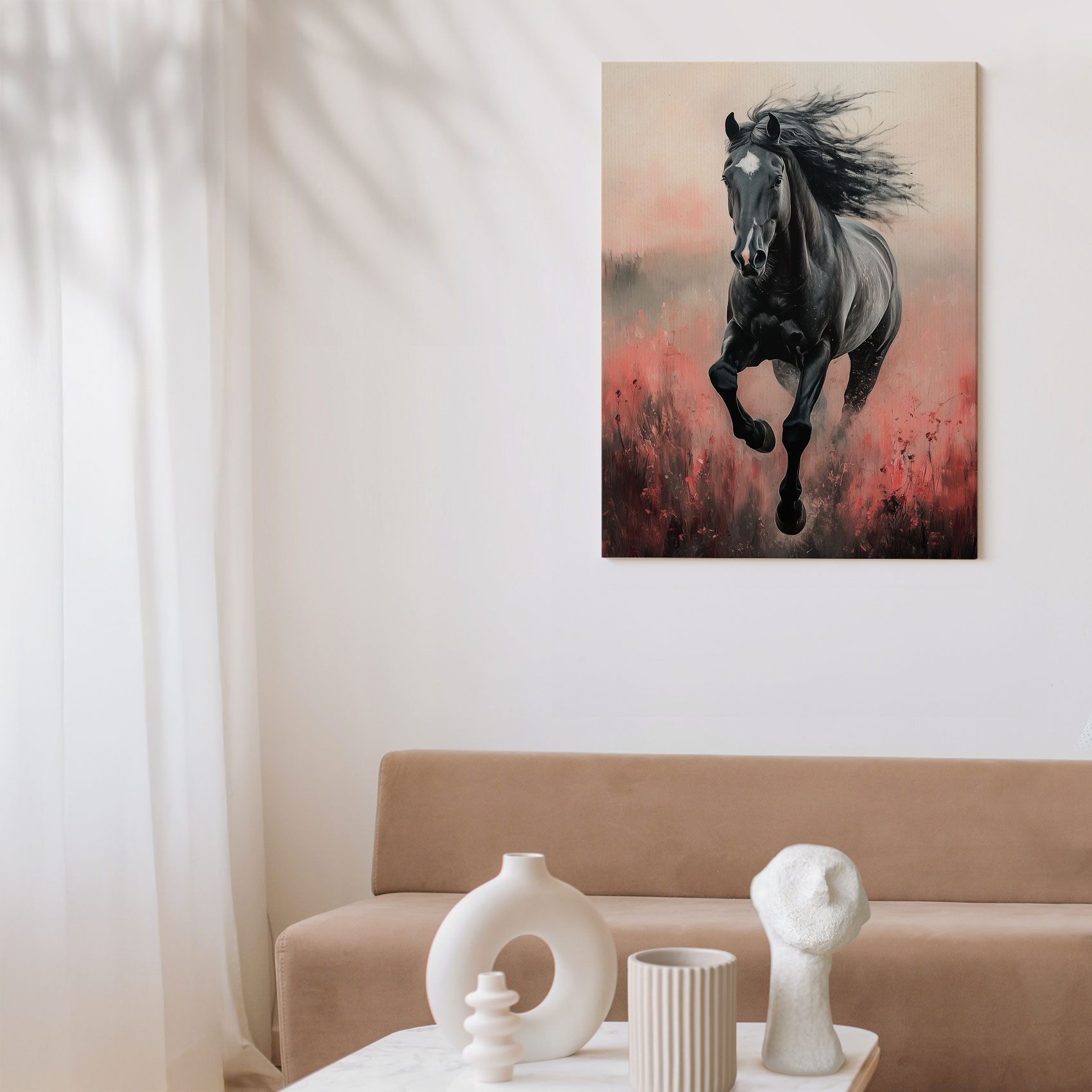 Terug naar collectie / Schilderijen / Bloemen Schilderij / Zwart paard in bloemenzee