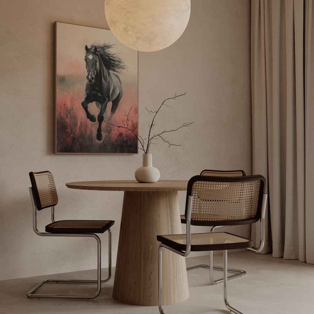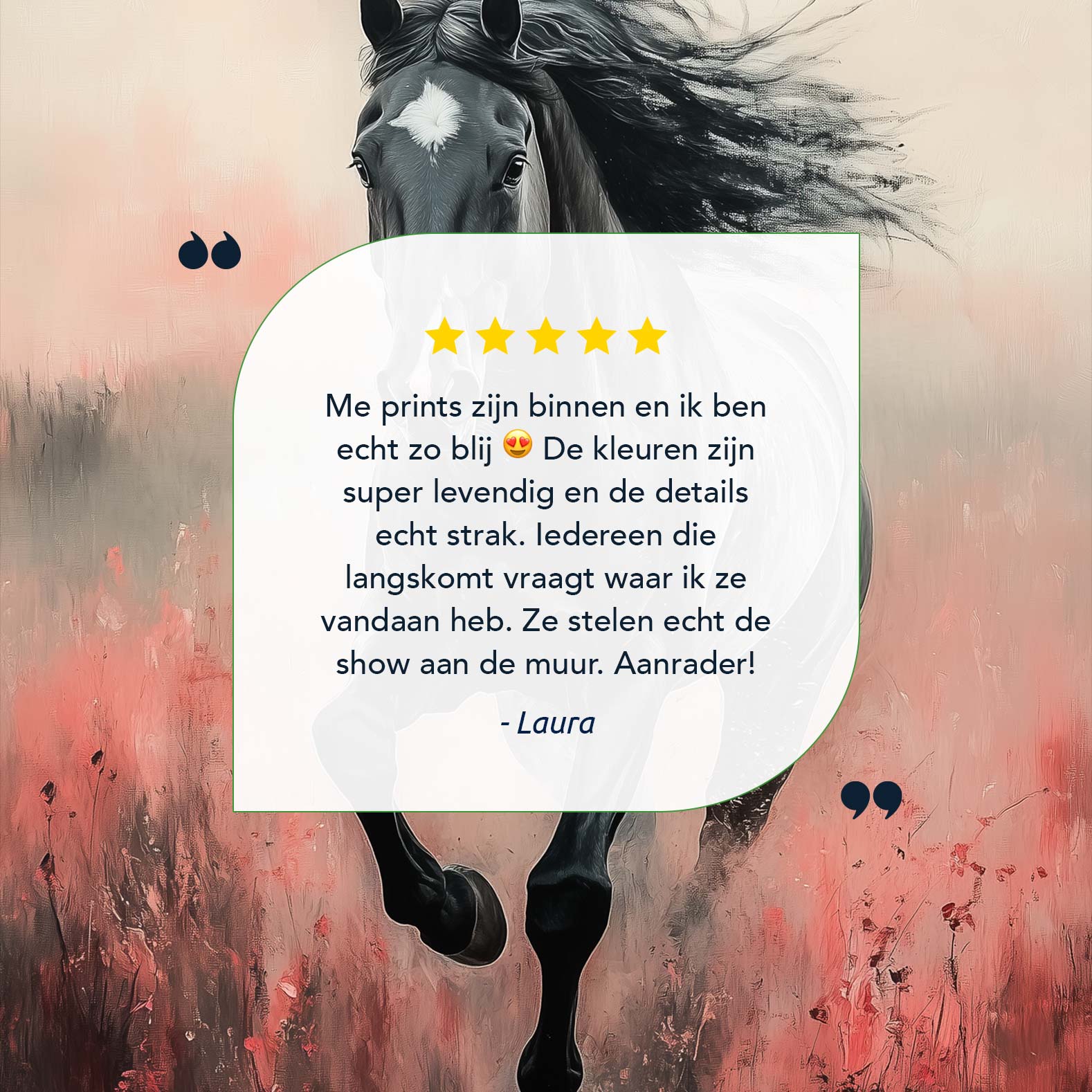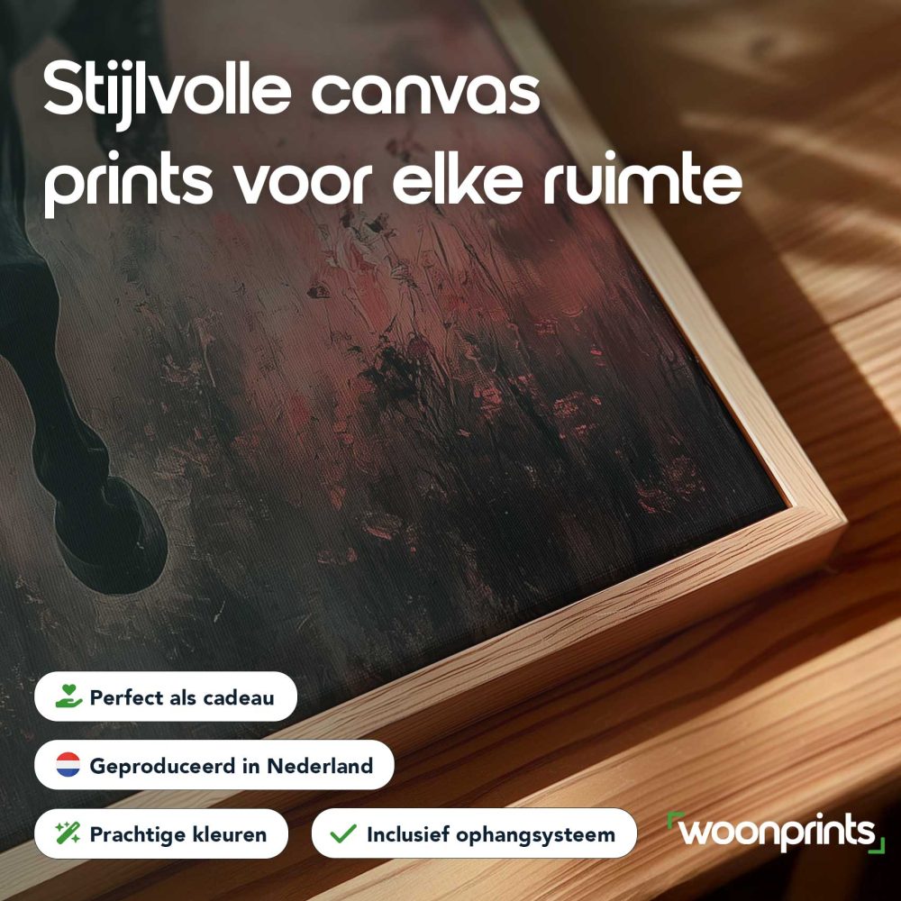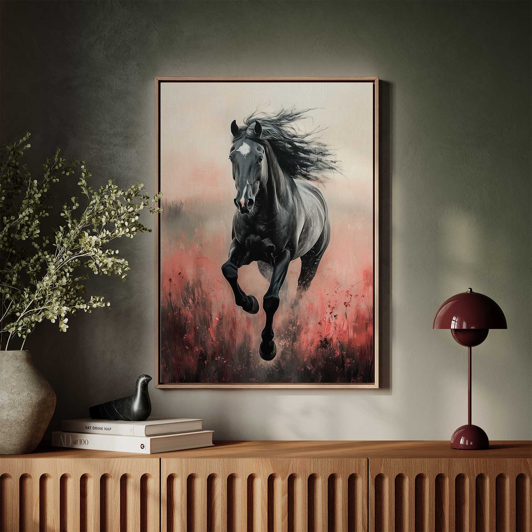 Terug naar collectie / Schilderijen / Bloemen Schilderij / Zwart paard in bloemenzee