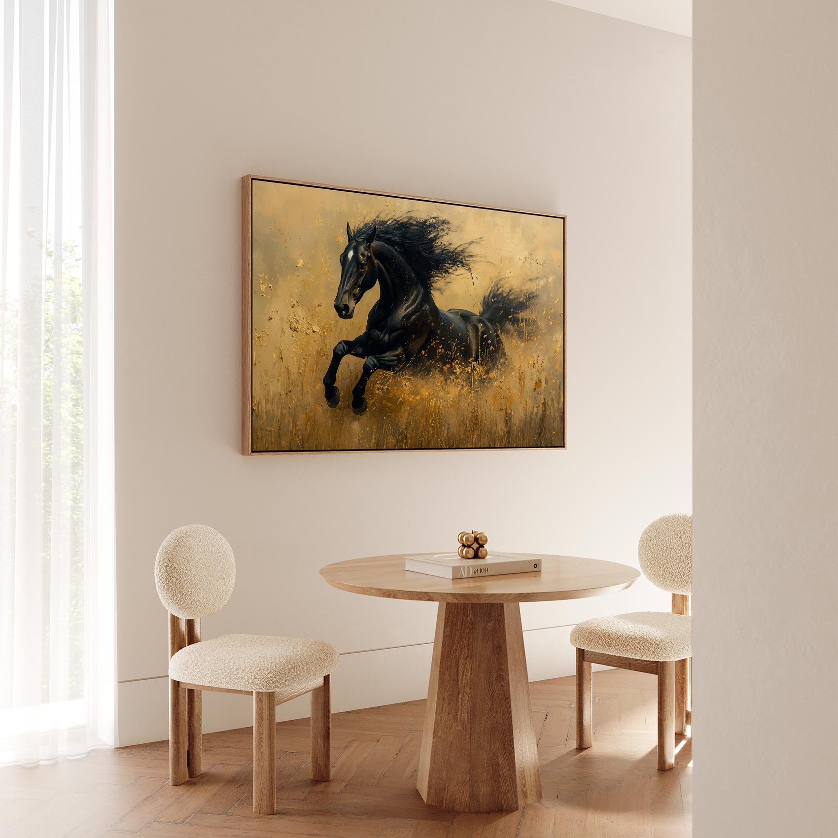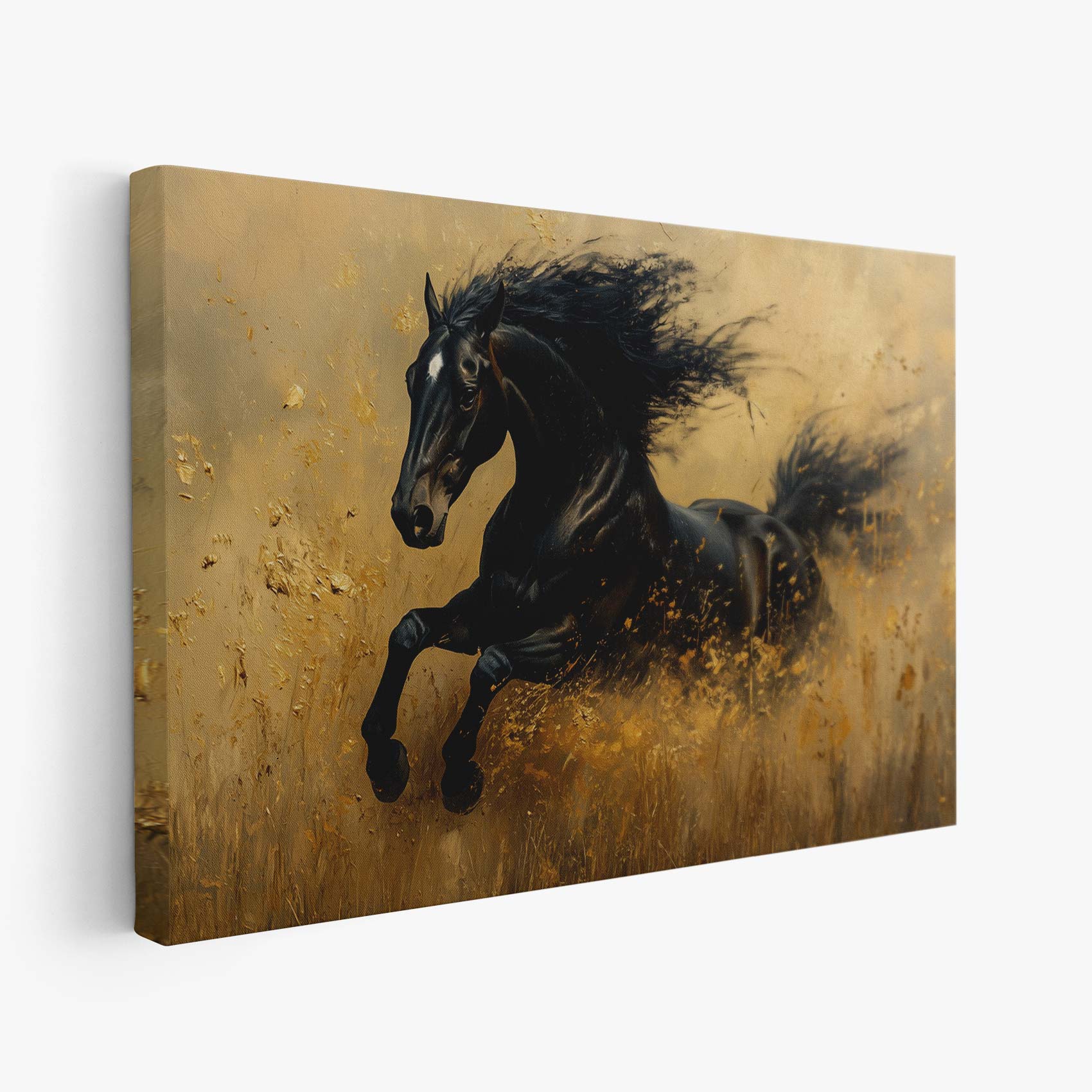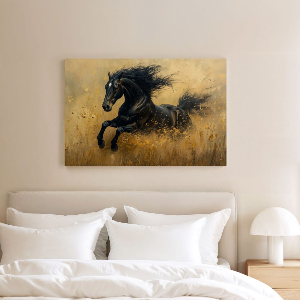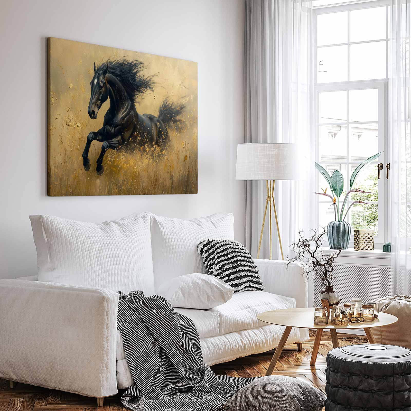 Terug naar collectie / Schilderijen / Dieren Schilderij / Zwart paard in gouden veld