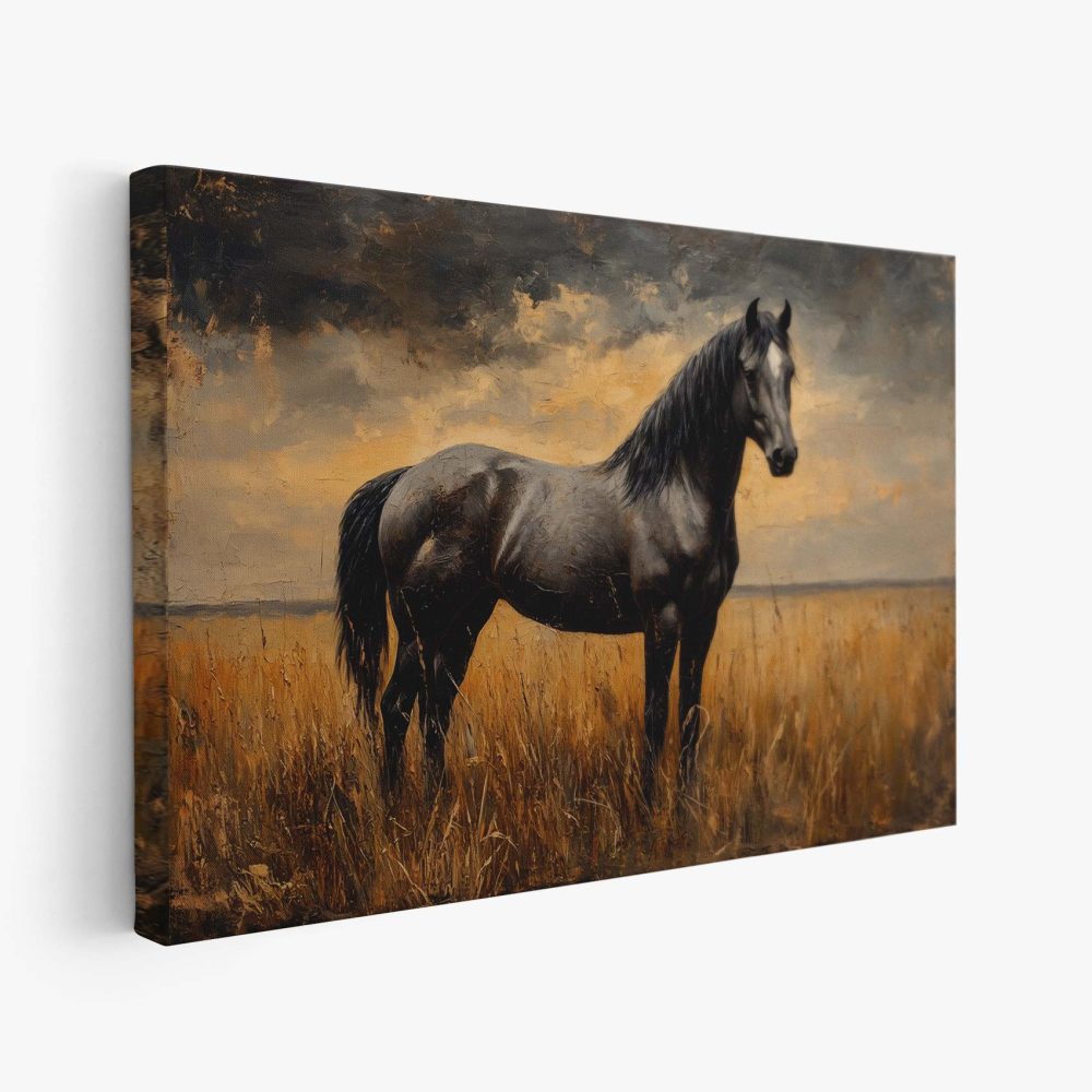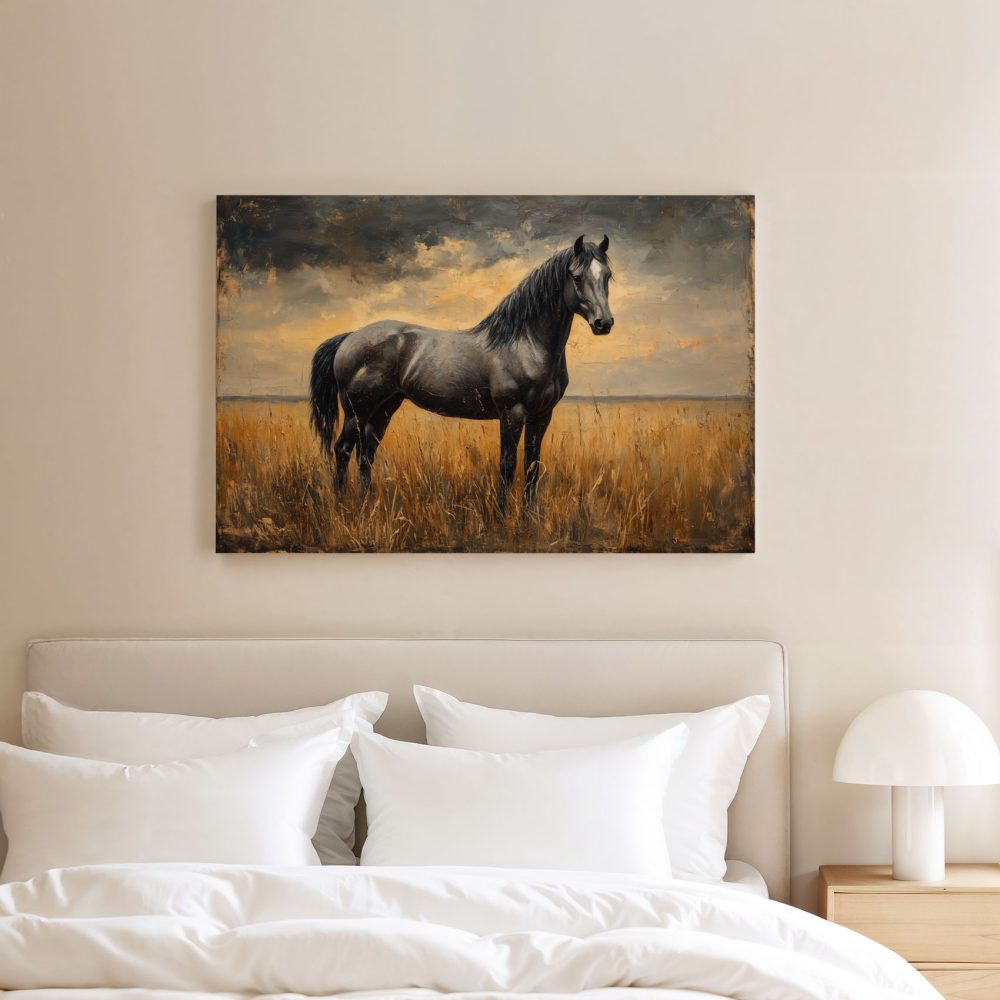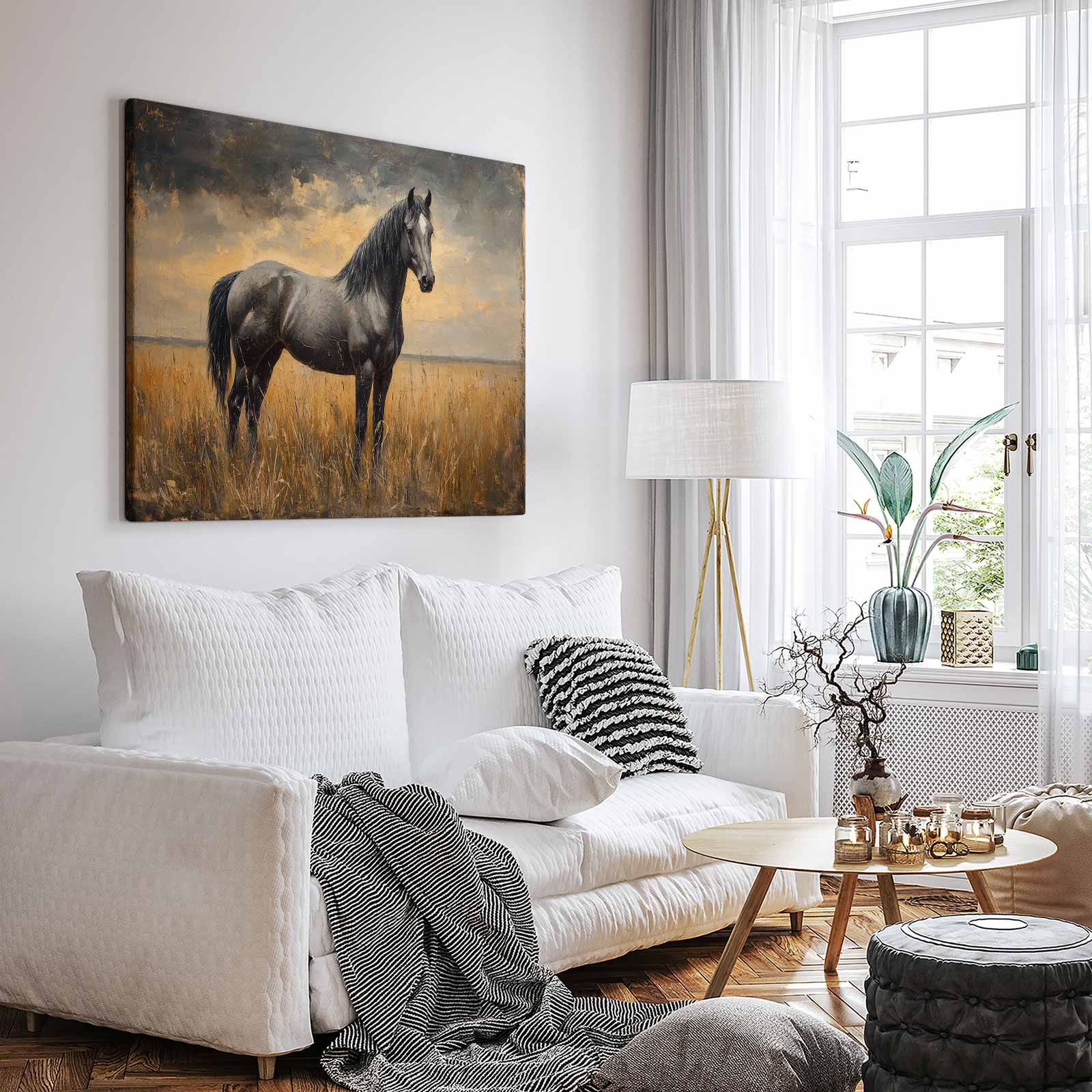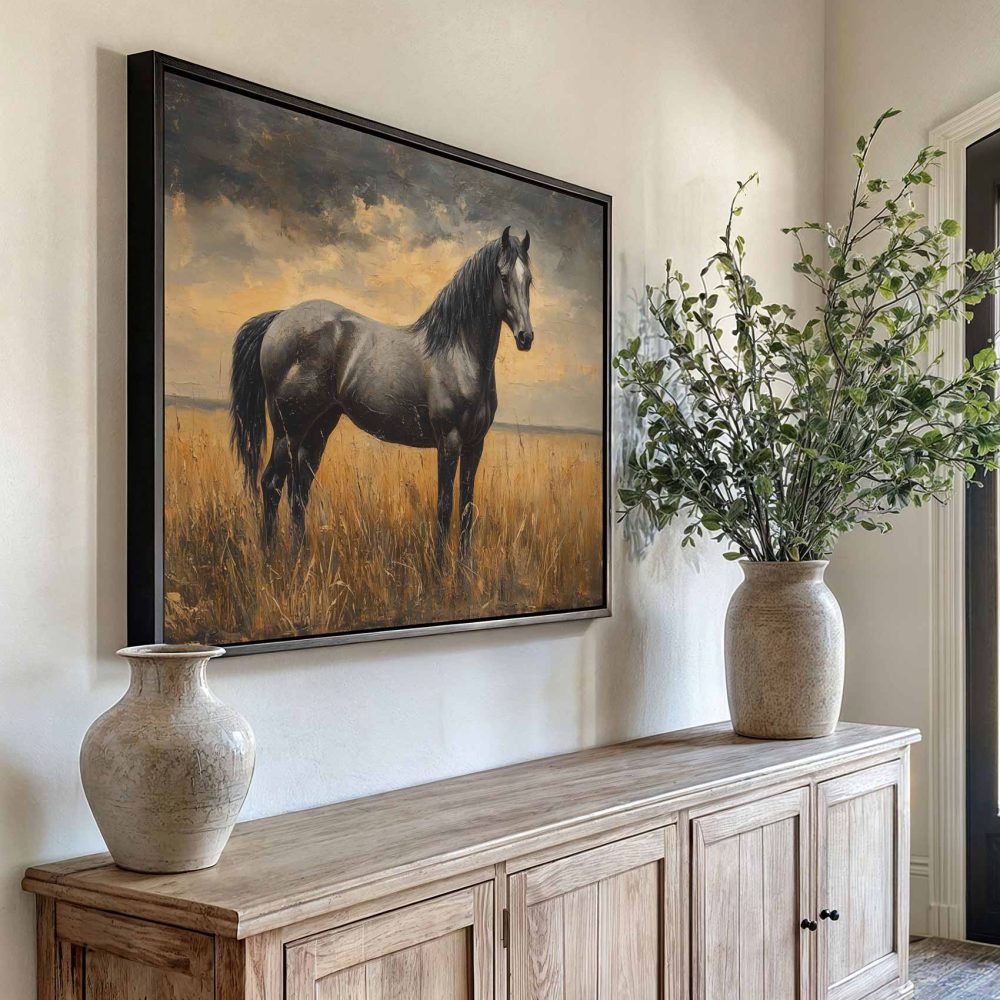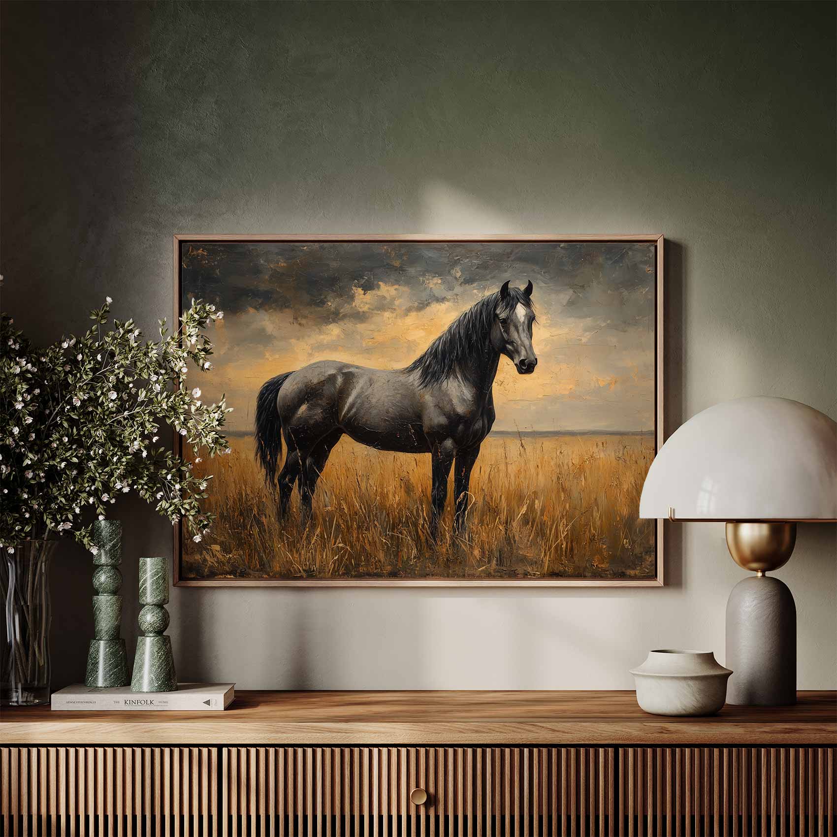 Terug naar collectie / Schilderijen / Dieren Schilderij / Zwart Paard in Serene Grasvlakte