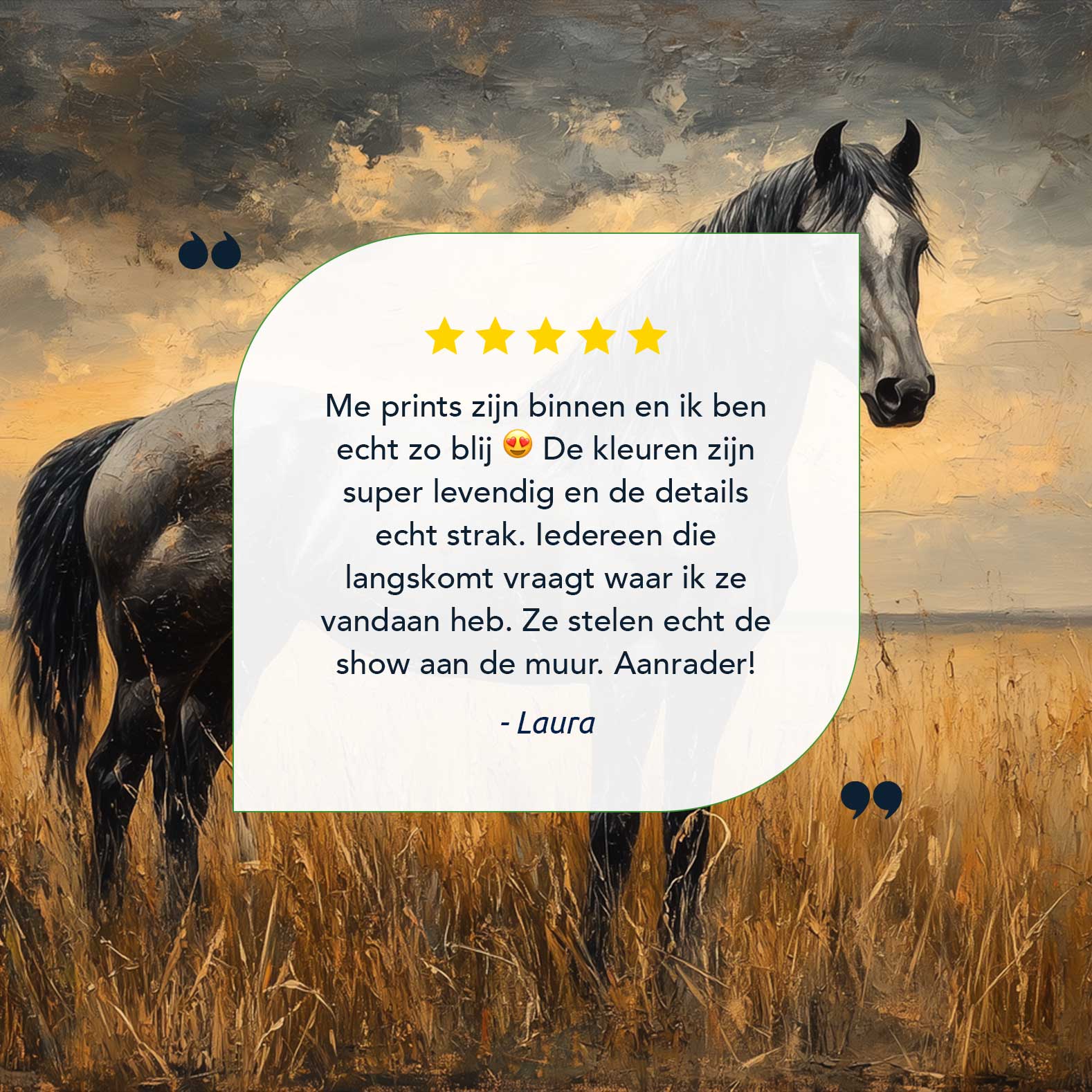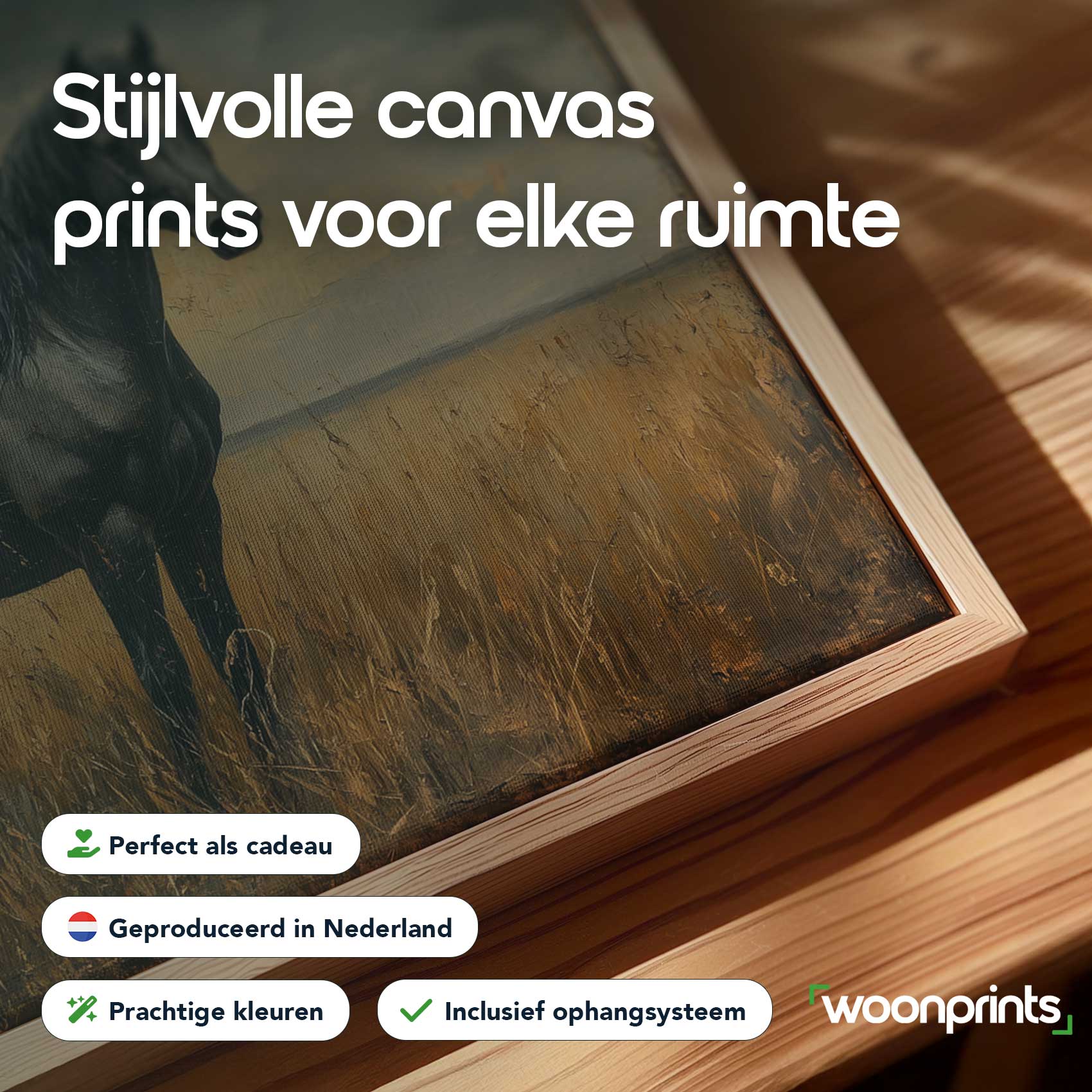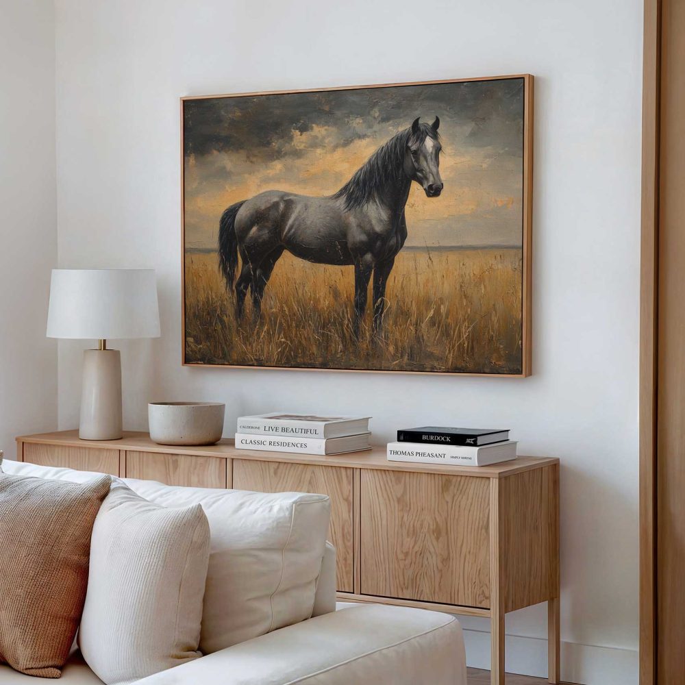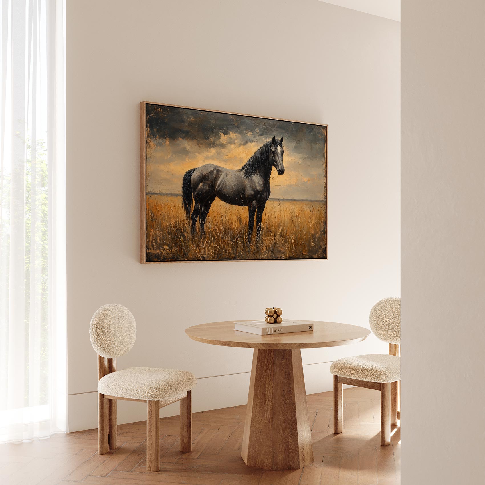 Terug naar collectie / Schilderijen / Dieren Schilderij / Zwart Paard in Serene Grasvlakte