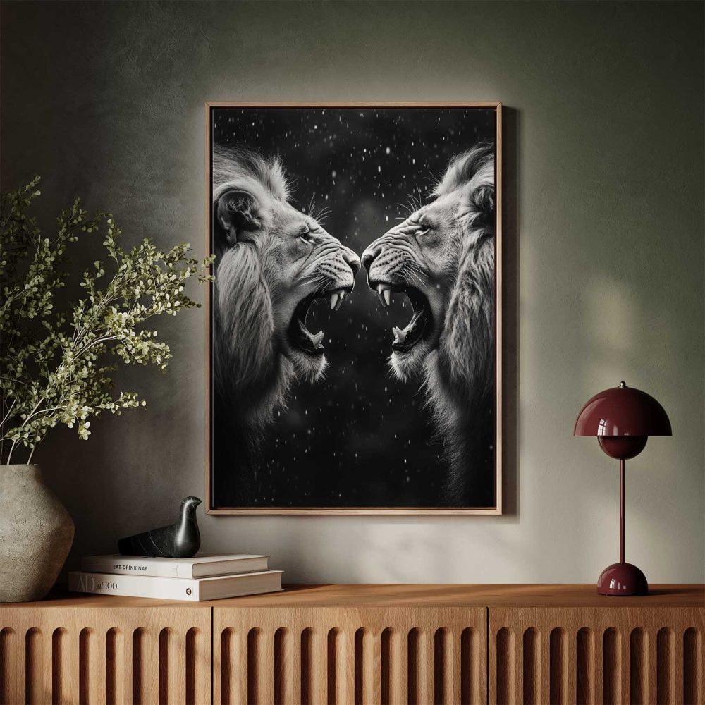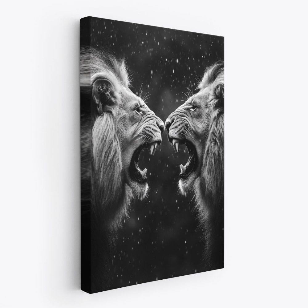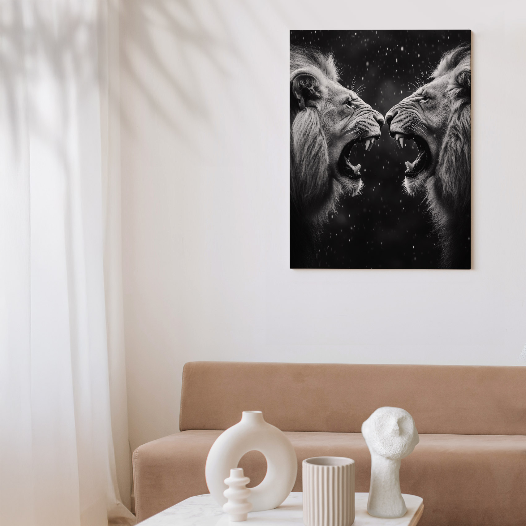 Terug naar collectie / Schilderijen / Dieren Schilderij / Zwart-wit brullende leeuwen