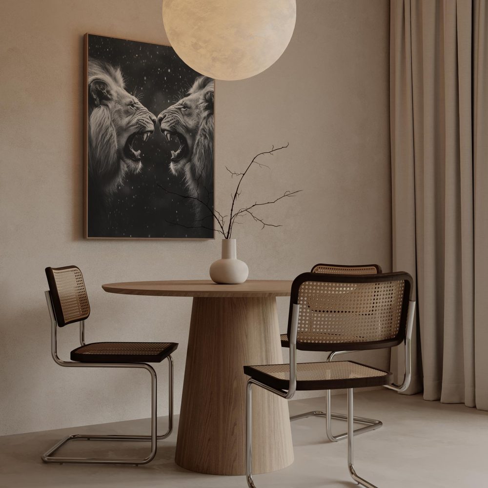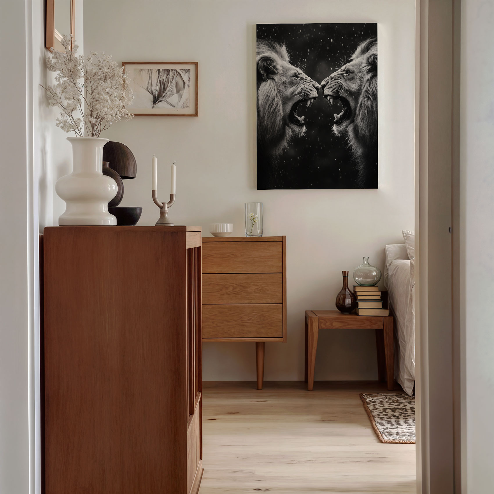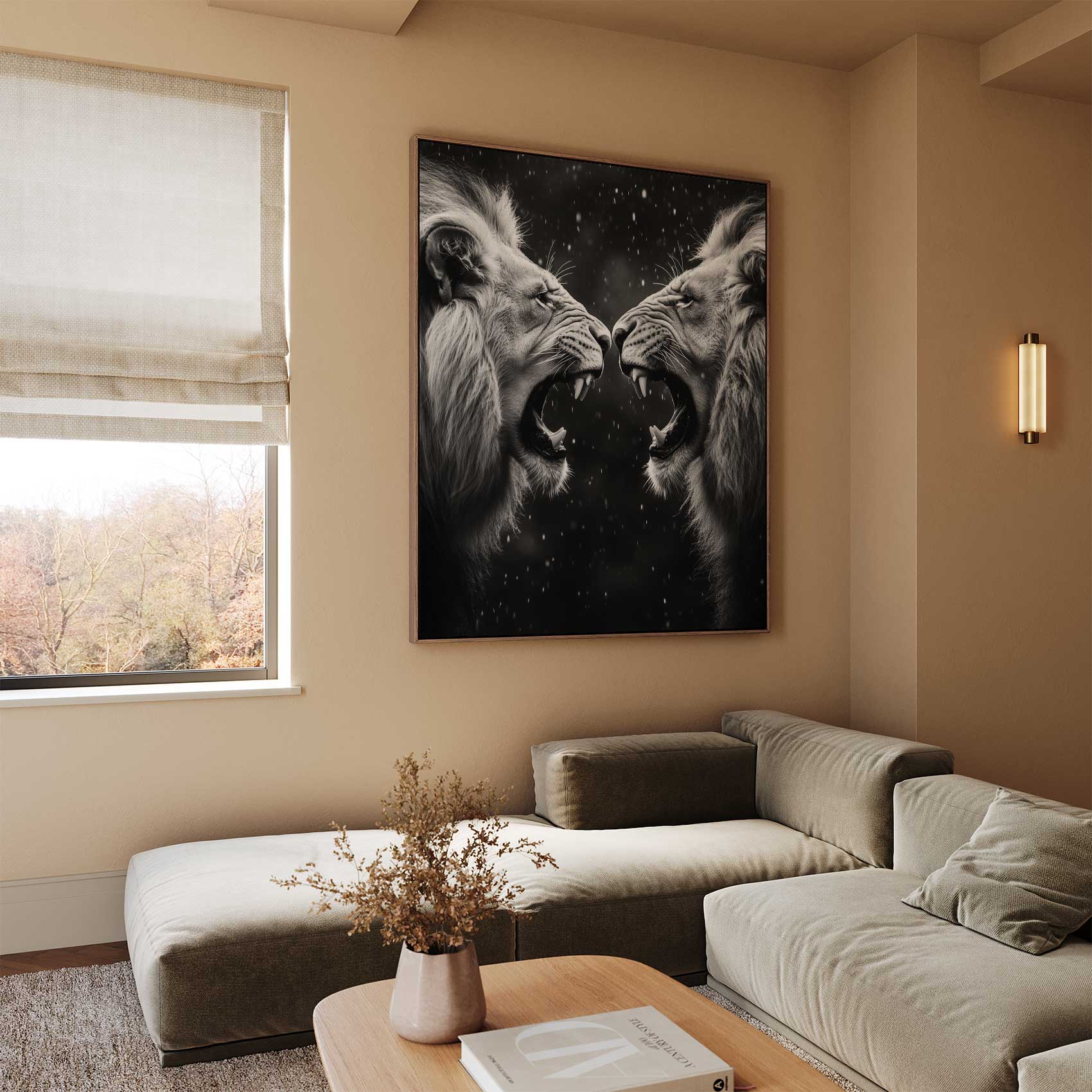 Terug naar collectie / Schilderijen / Dieren Schilderij / Zwart-wit brullende leeuwen