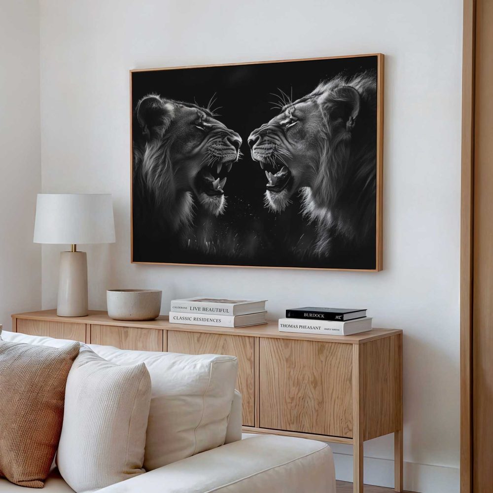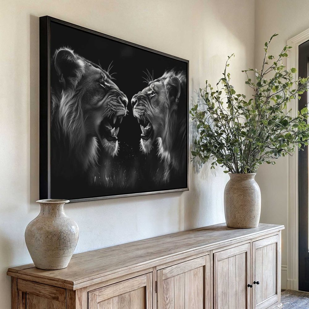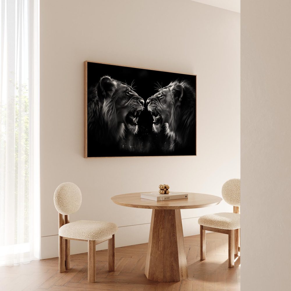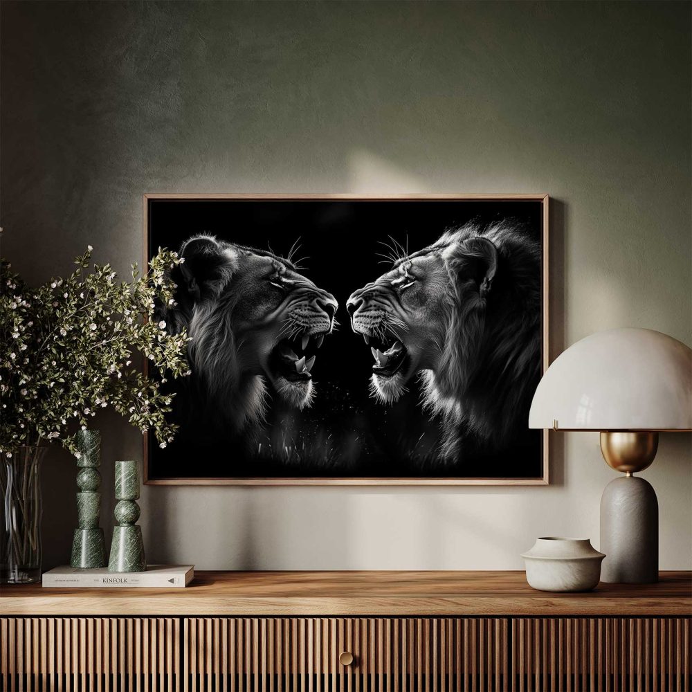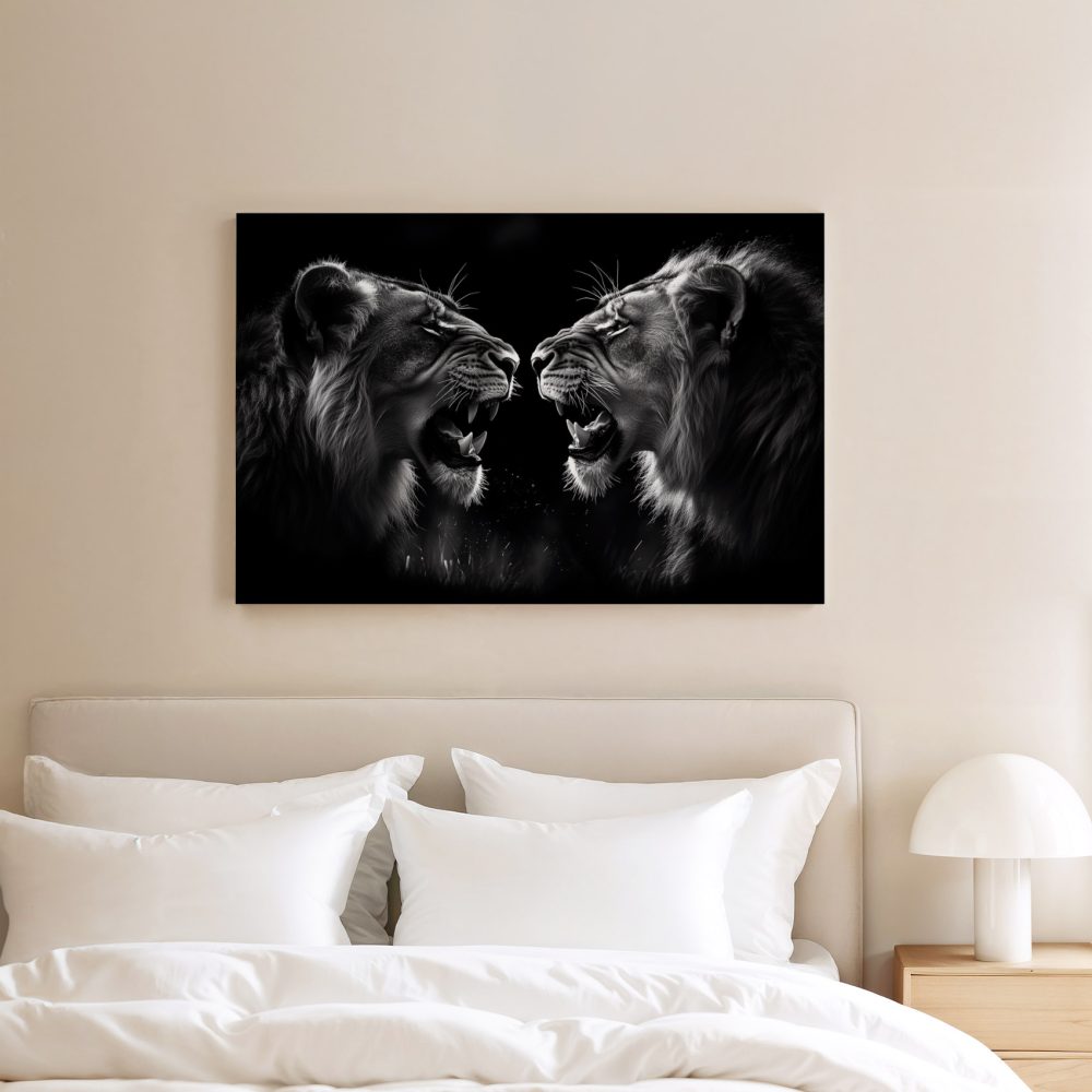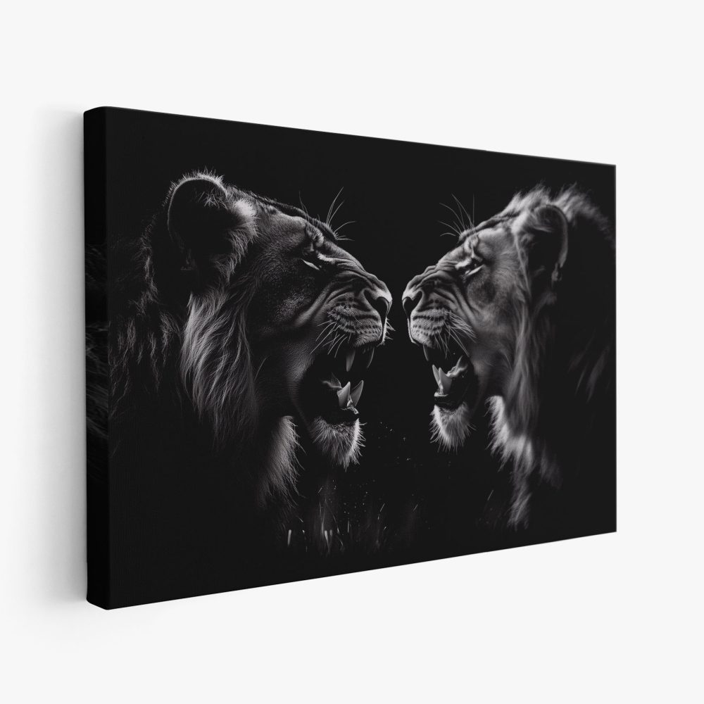 Terug naar collectie / Schilderijen / Dieren Schilderij / Zwart-wit brullende leeuwen