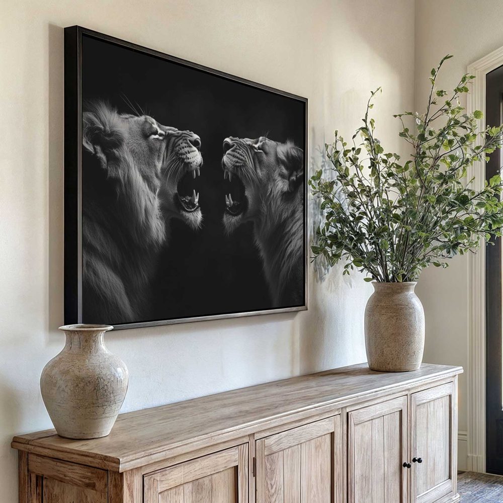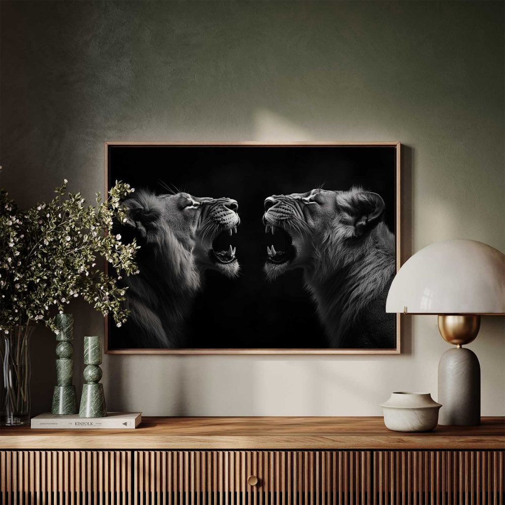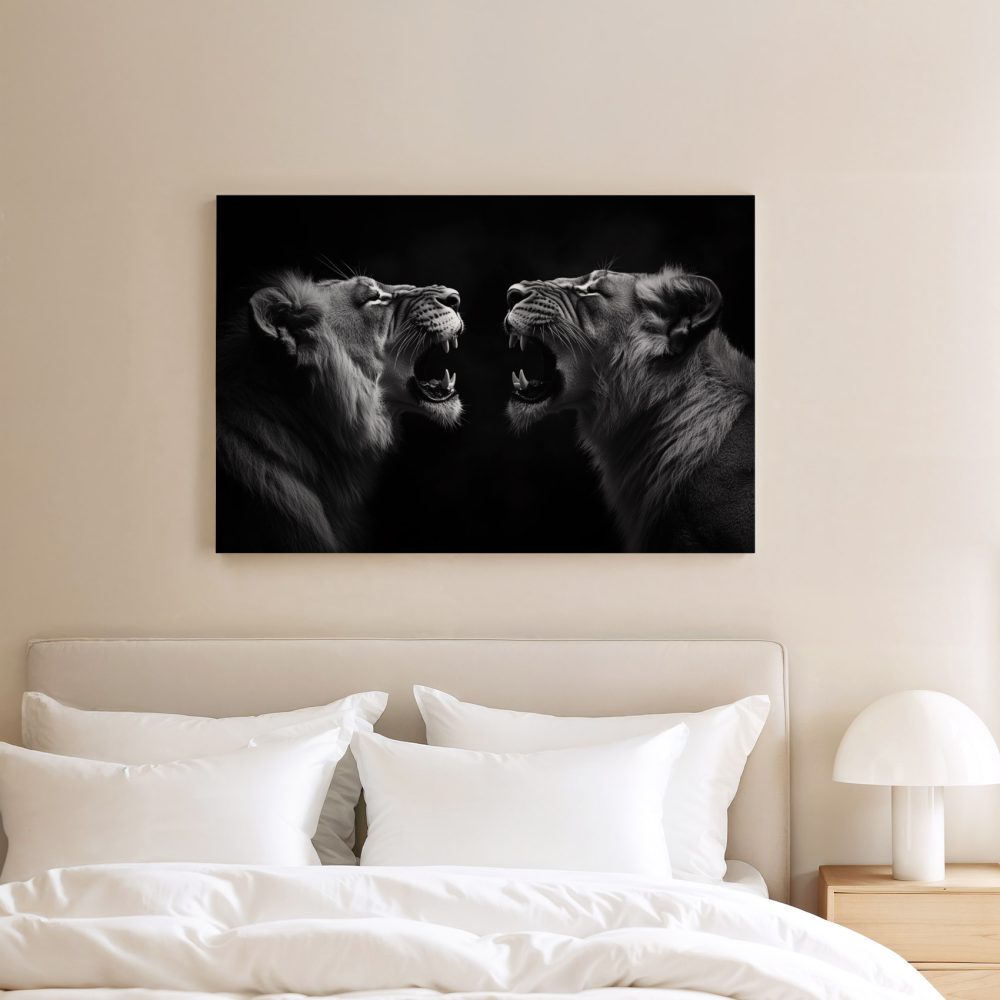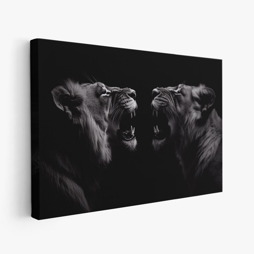 Terug naar collectie / Schilderijen / Dieren Schilderij / Zwart-wit brullende leeuwenportret