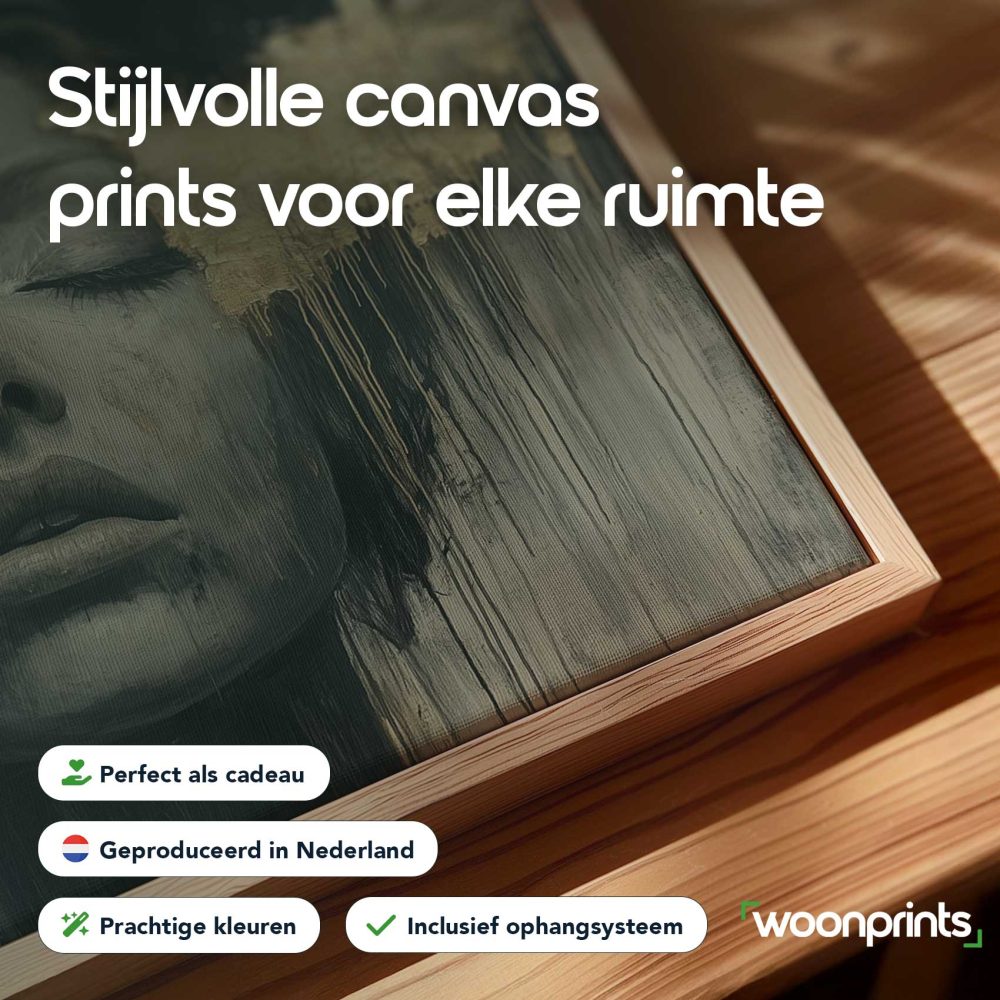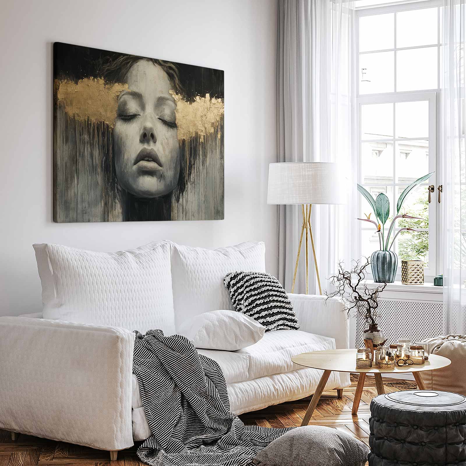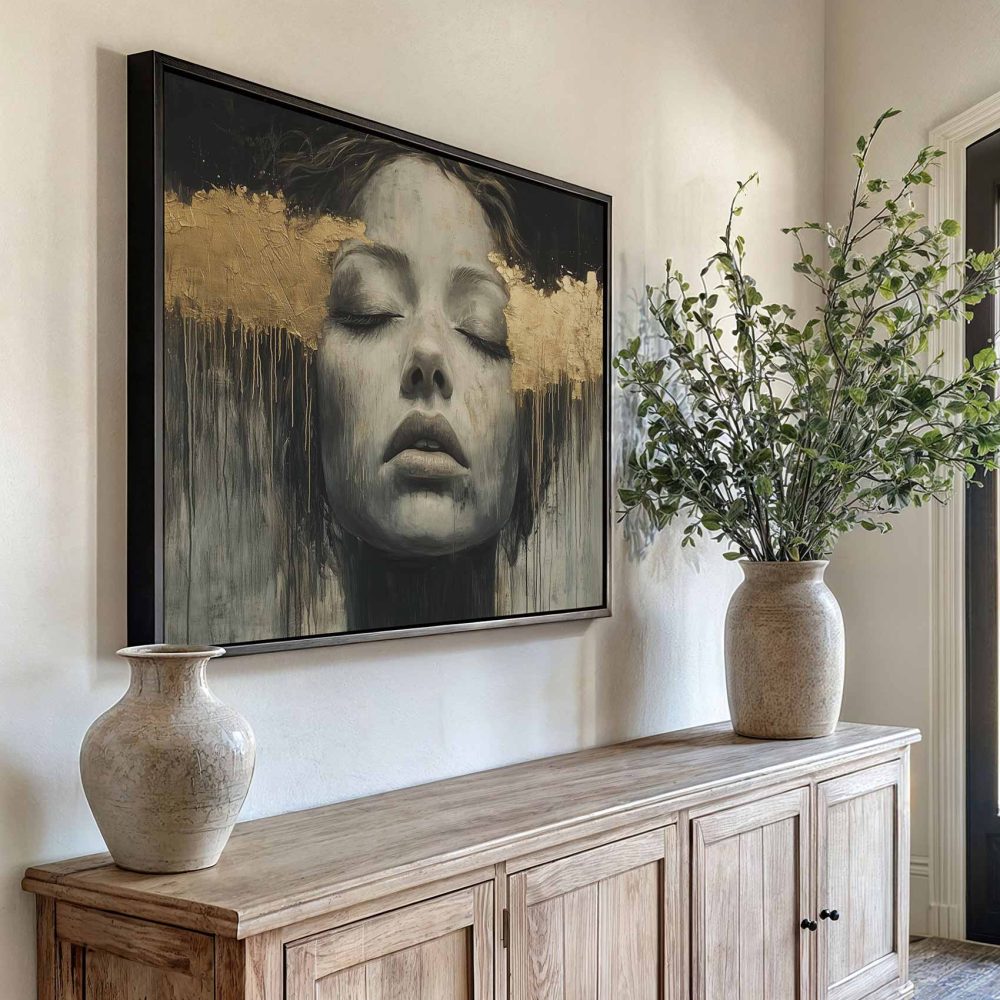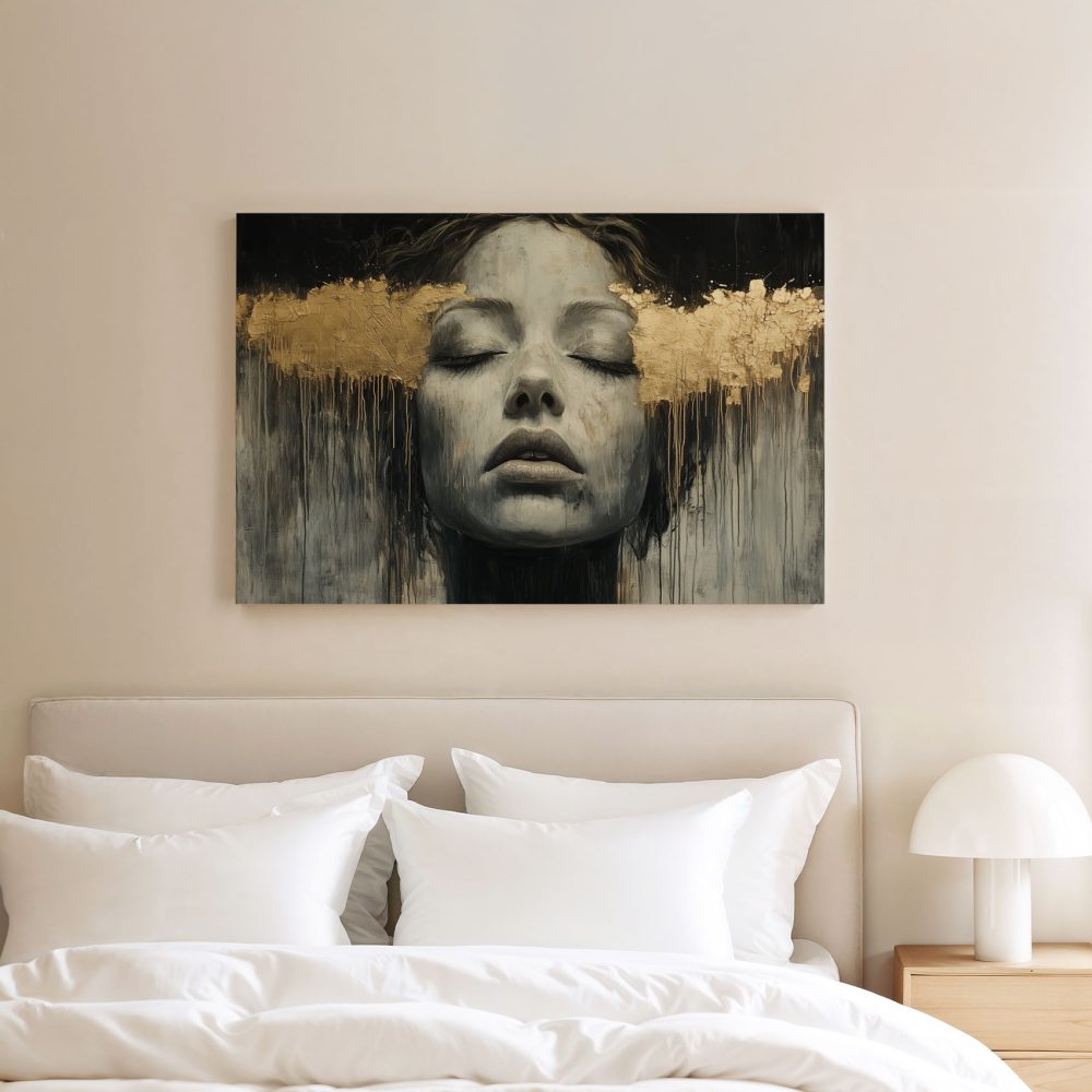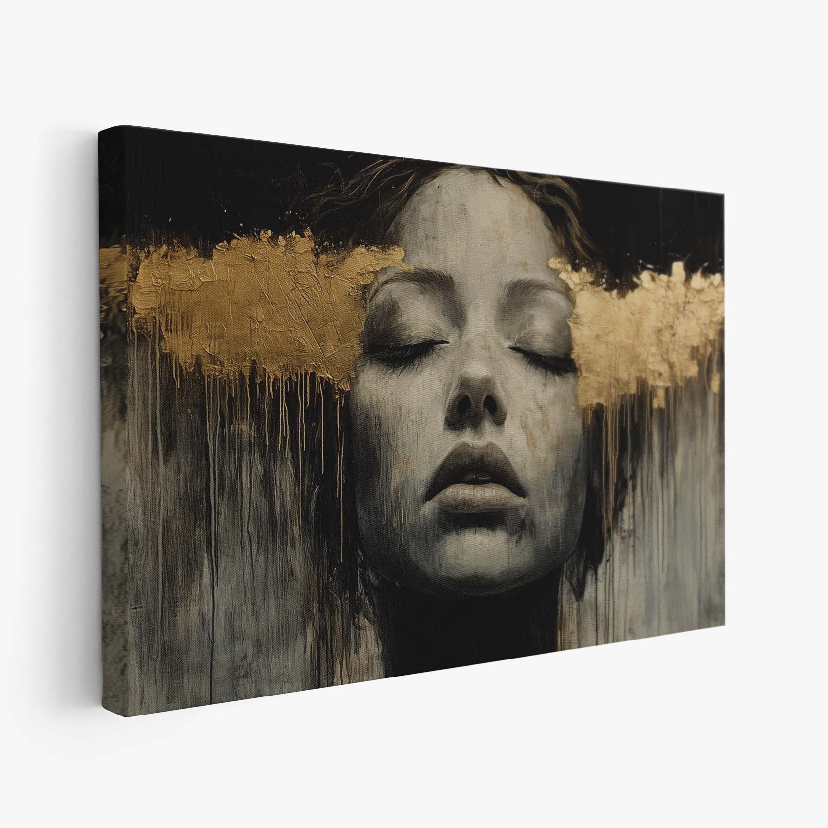 Terug naar collectie / Schilderijen / Abstract Schilderij / Zwart-wit droomportret met bladgoud