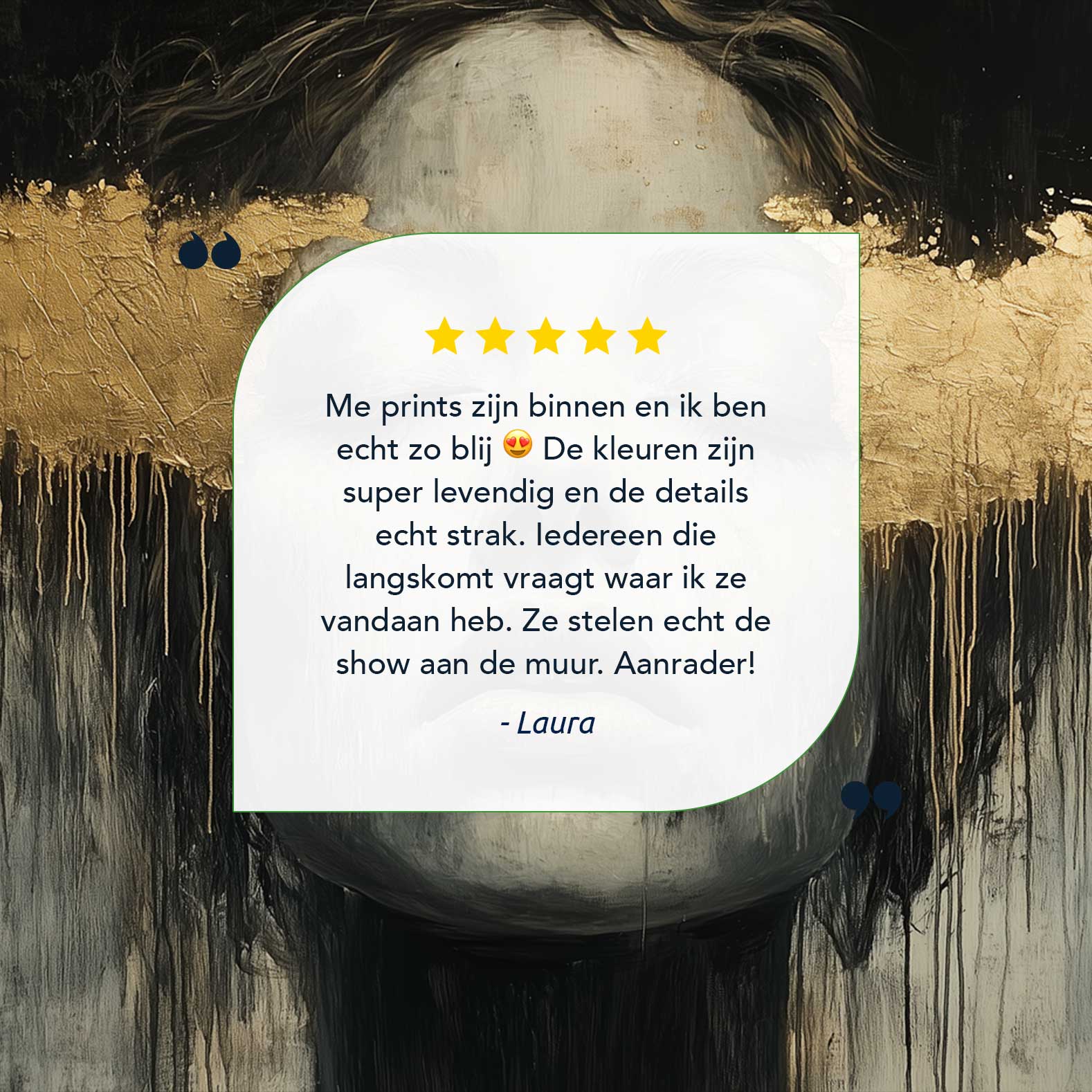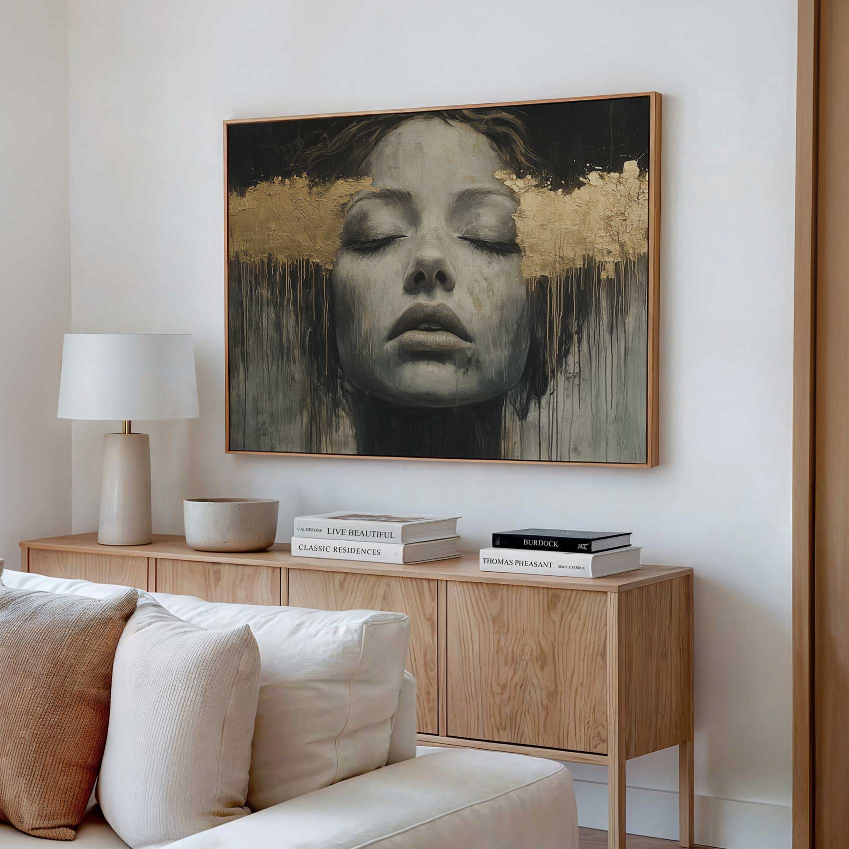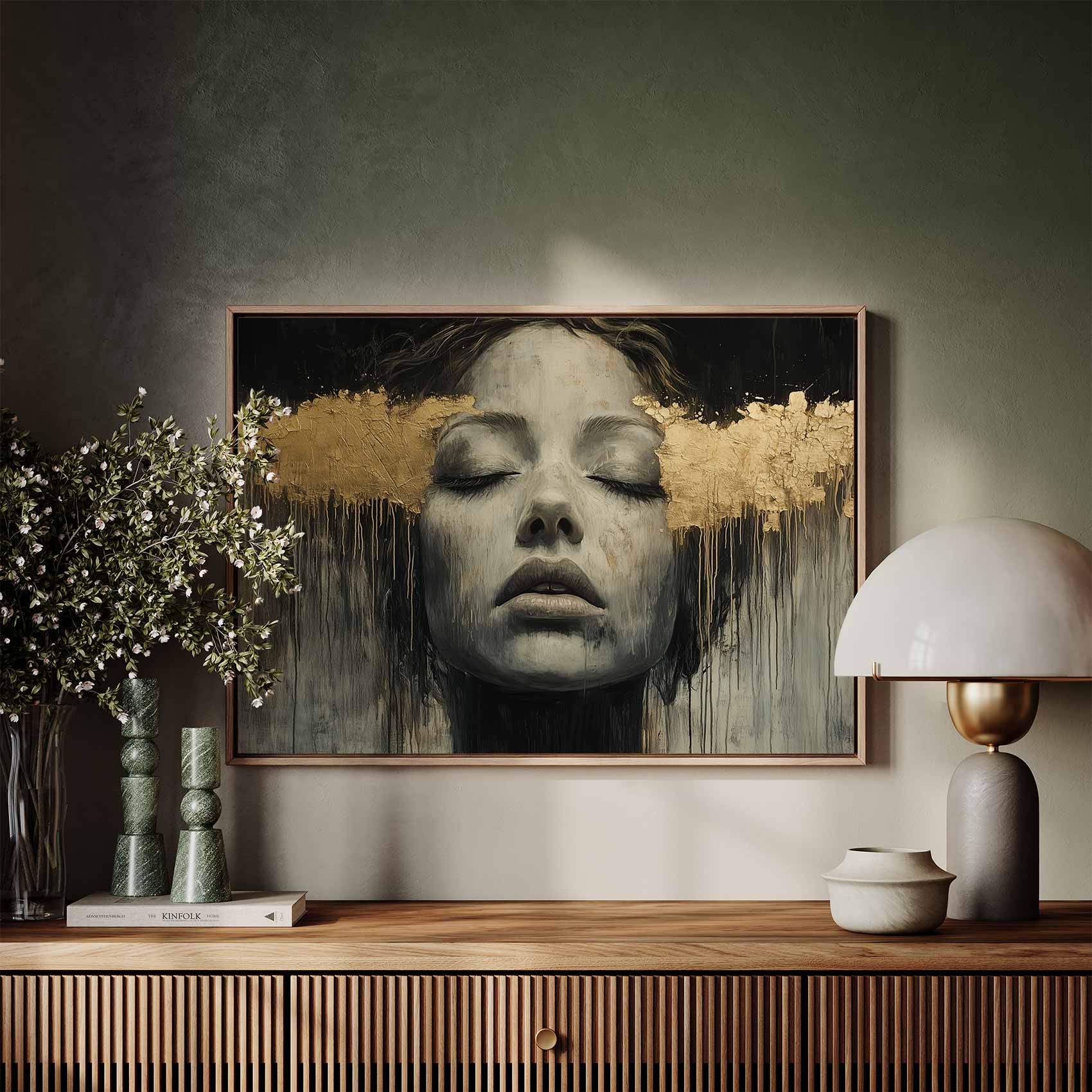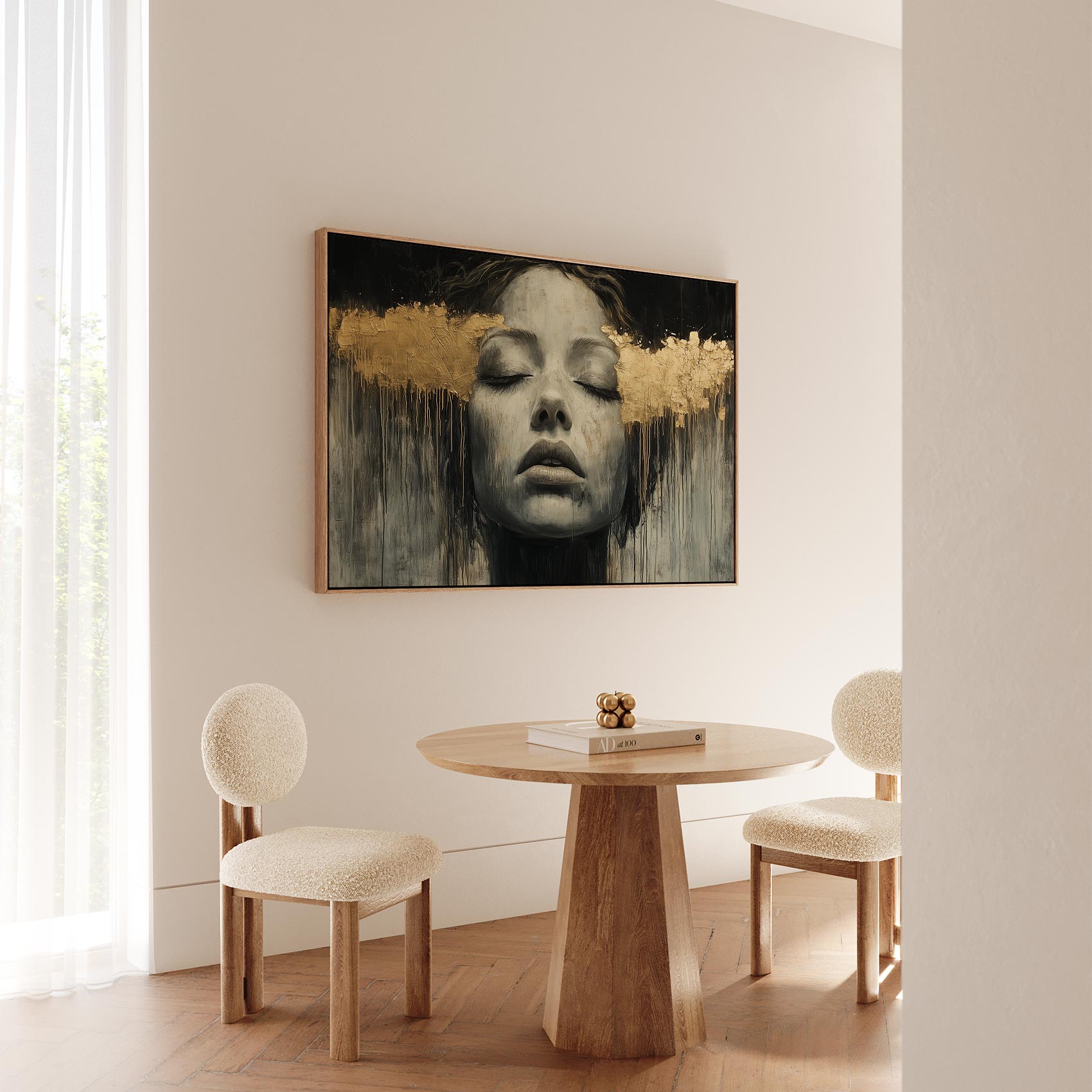 Terug naar collectie / Schilderijen / Abstract Schilderij / Zwart-wit droomportret met bladgoud