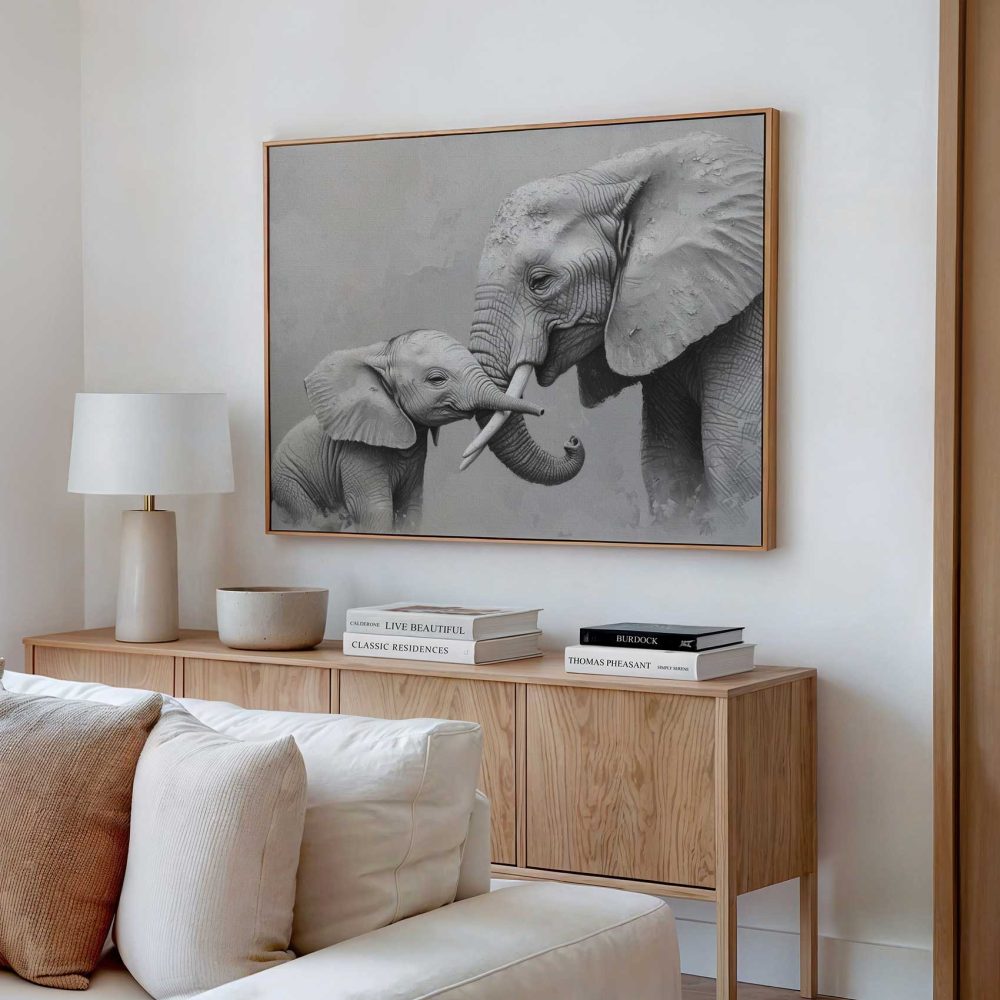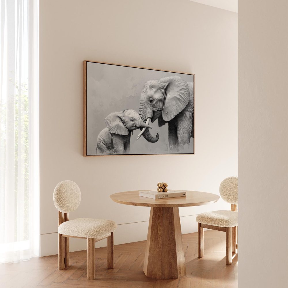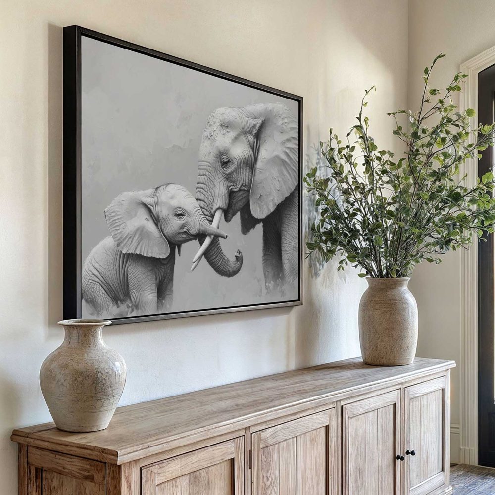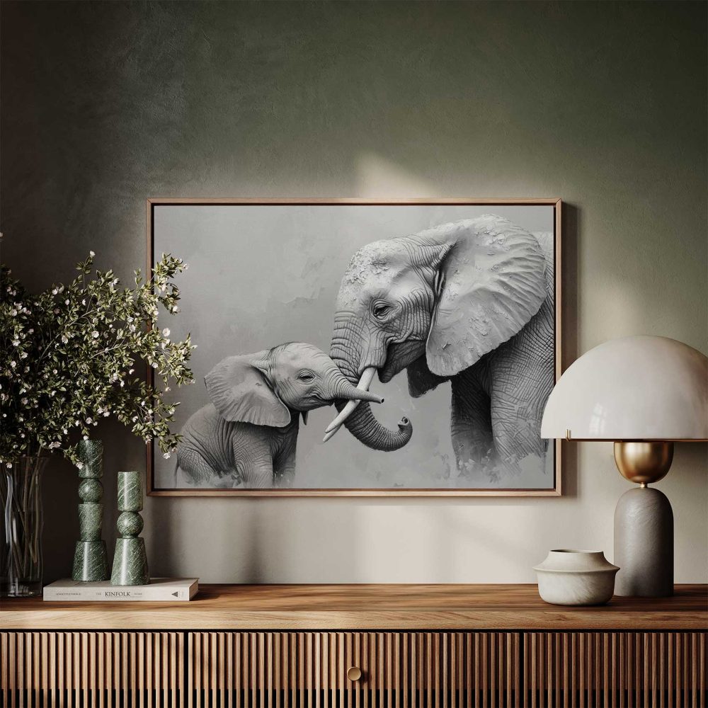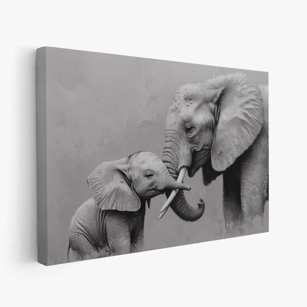 Terug naar collectie / Schilderijen / Dieren Schilderij / Zwart-wit olifantenliefde