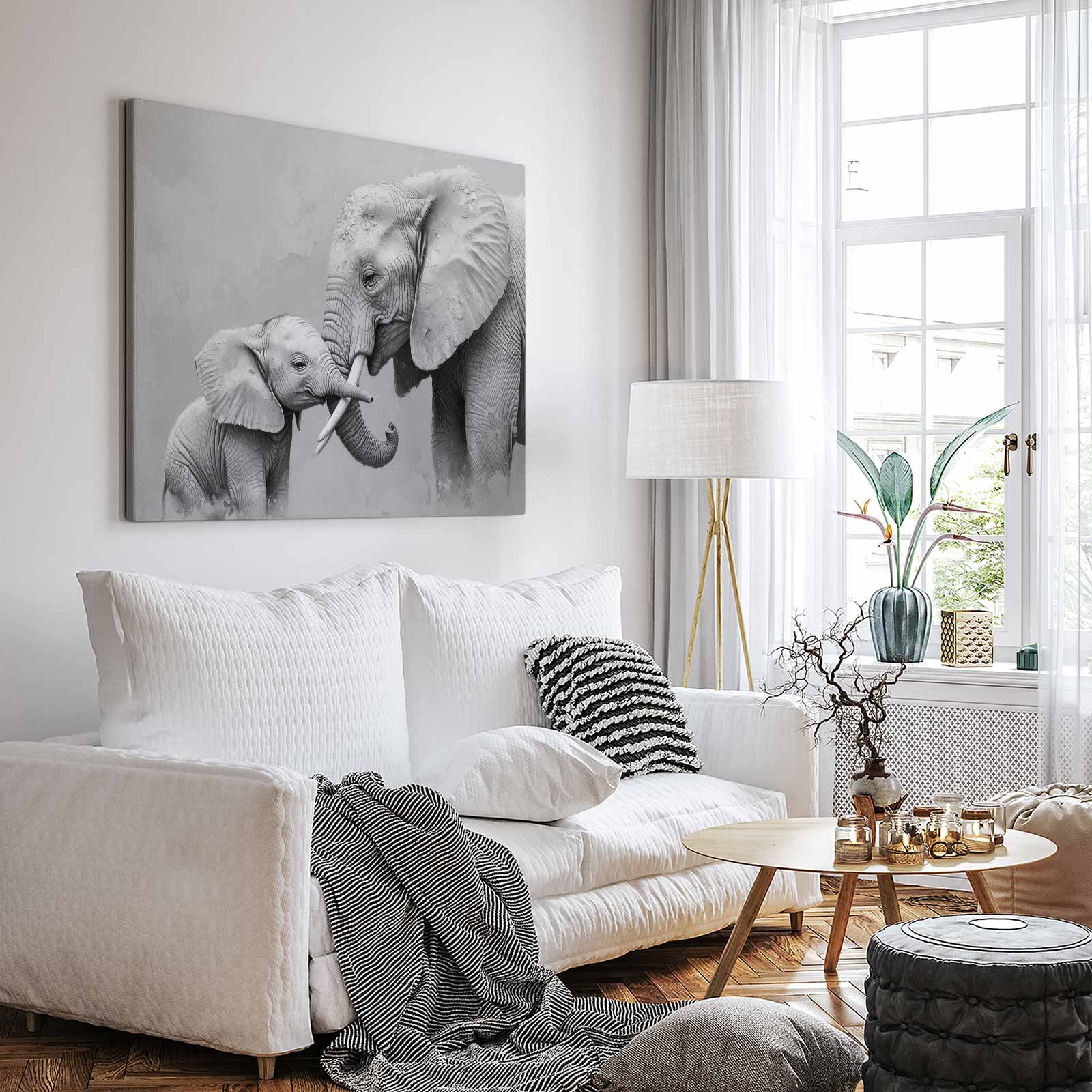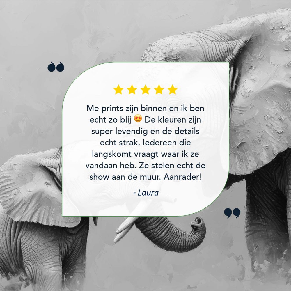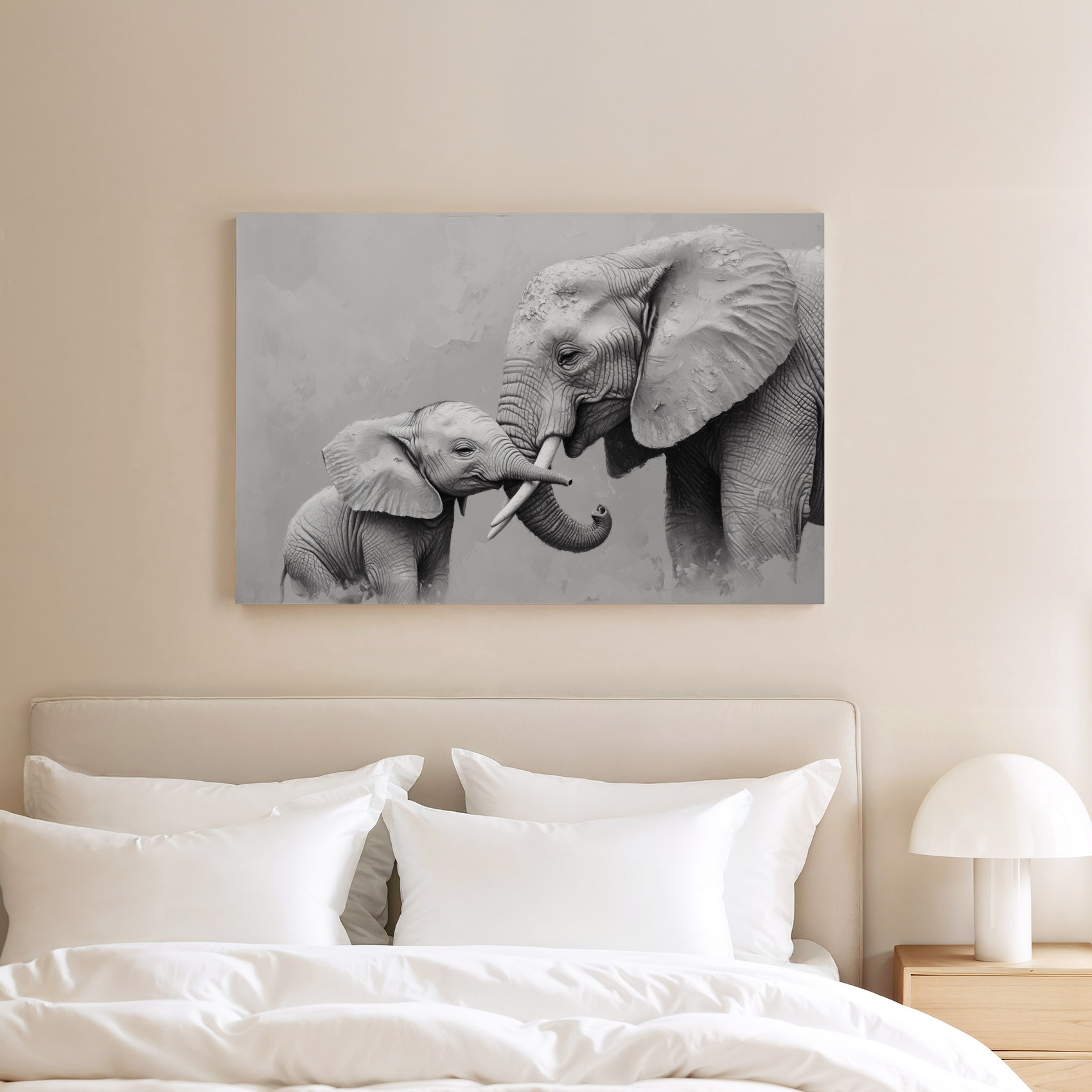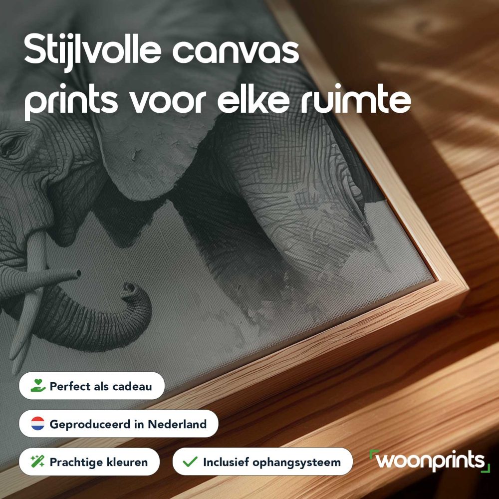 Terug naar collectie / Schilderijen / Dieren Schilderij / Zwart-wit olifantenliefde