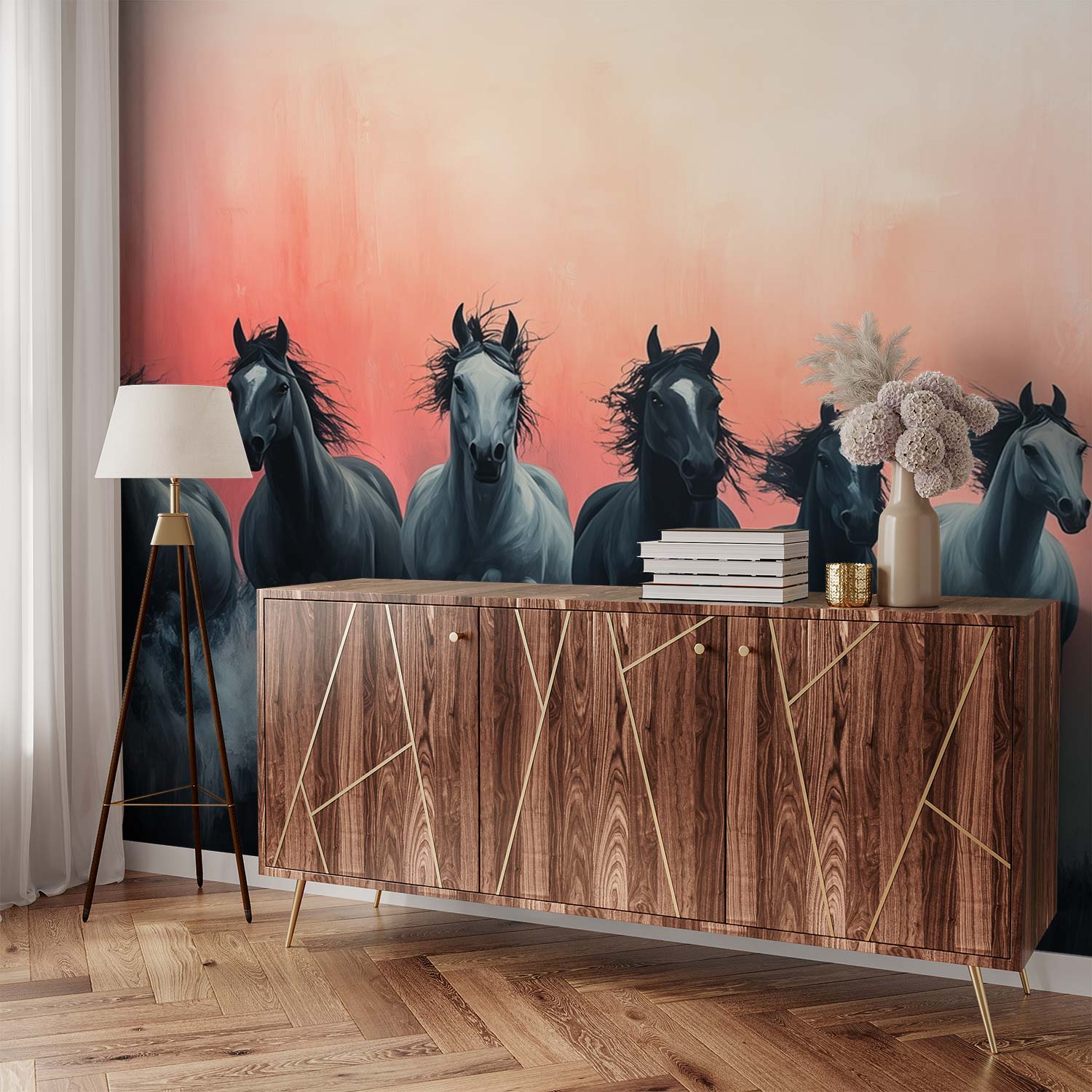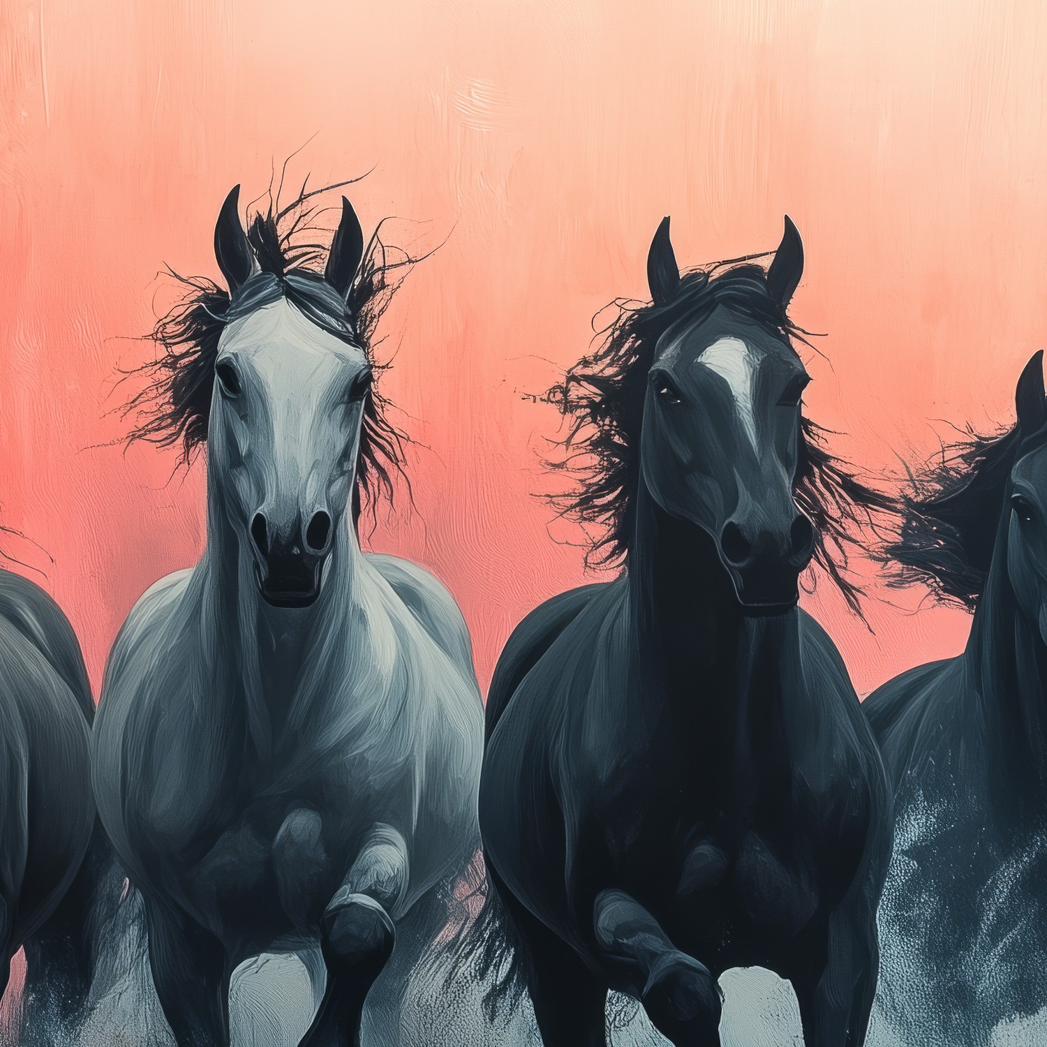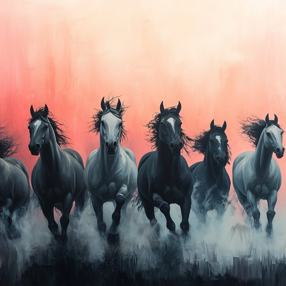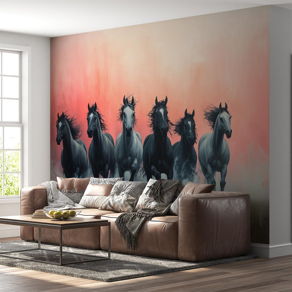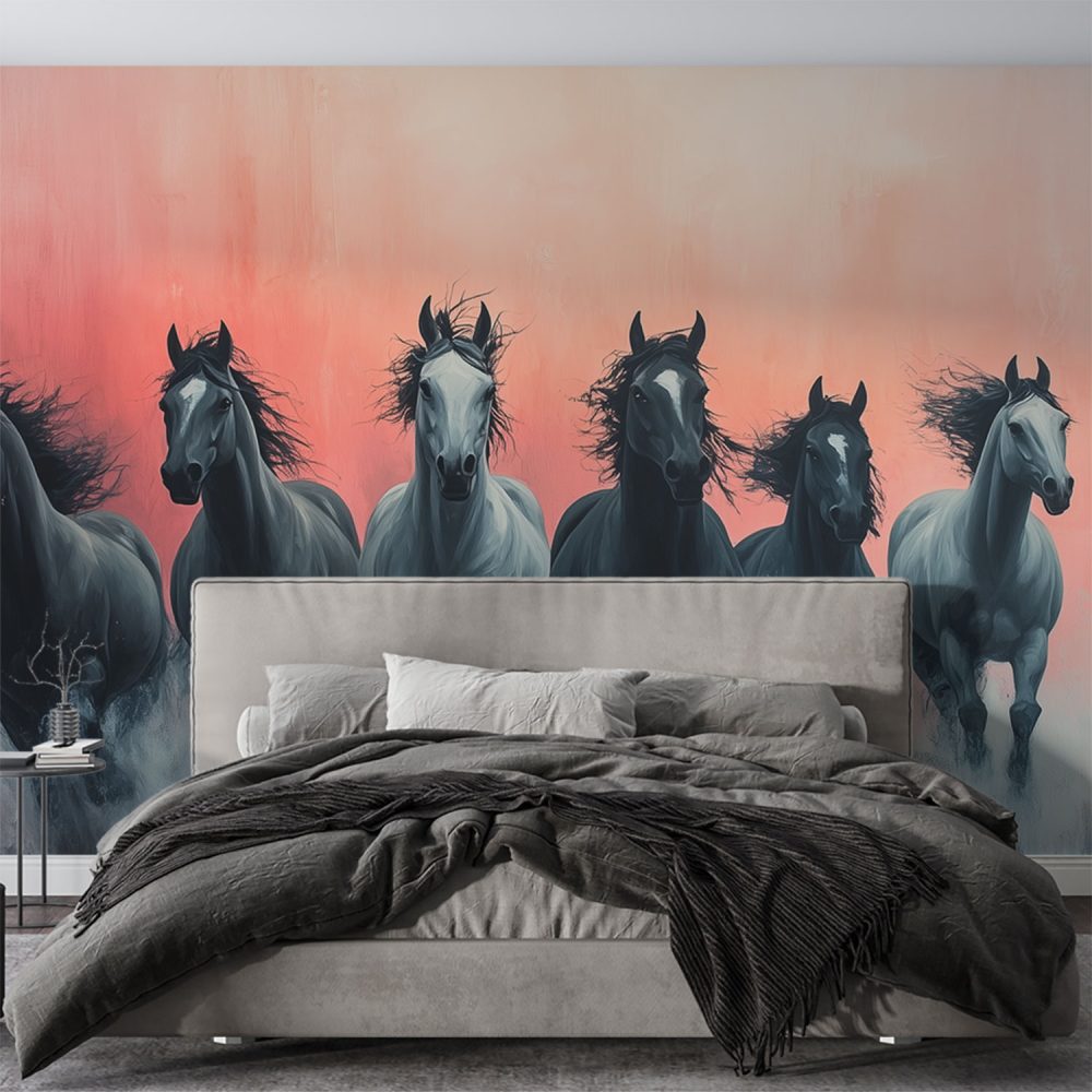 Zwart-witte rennende paarden behang