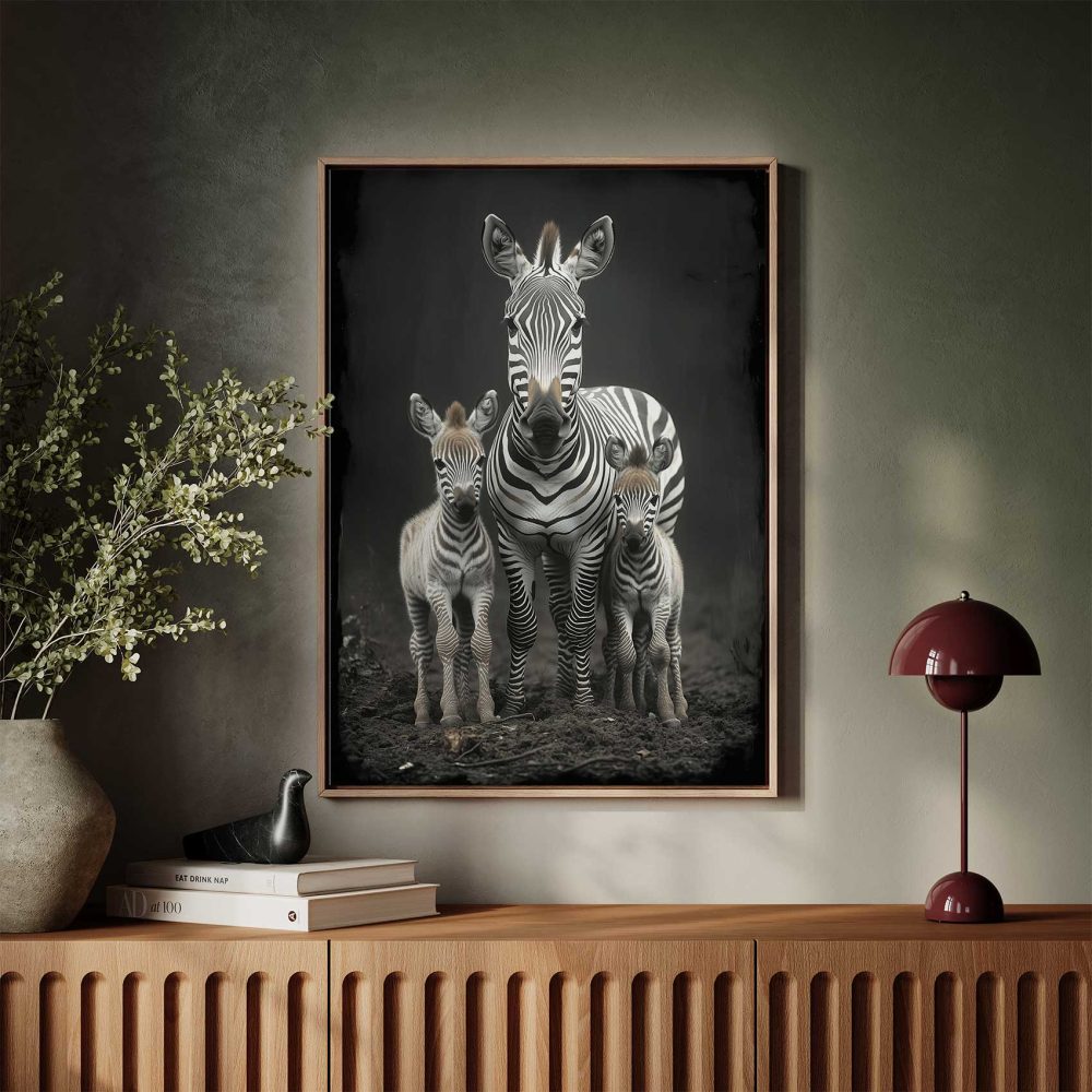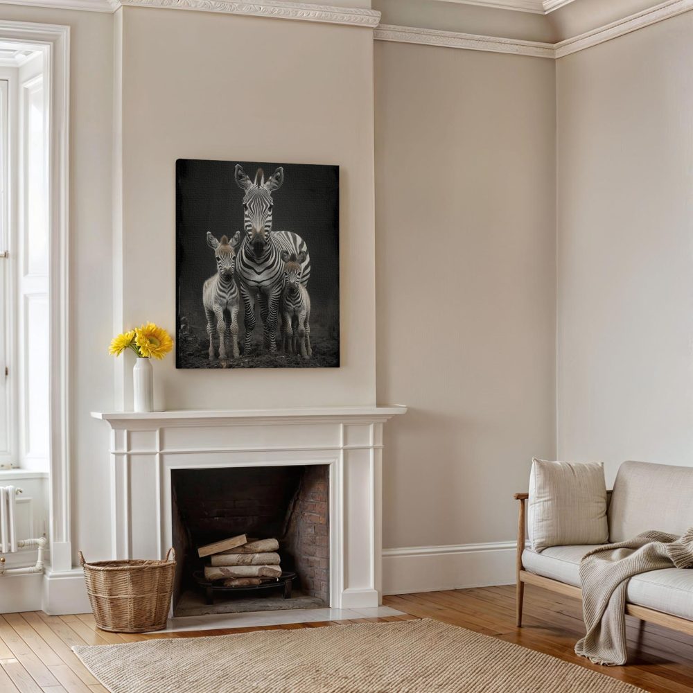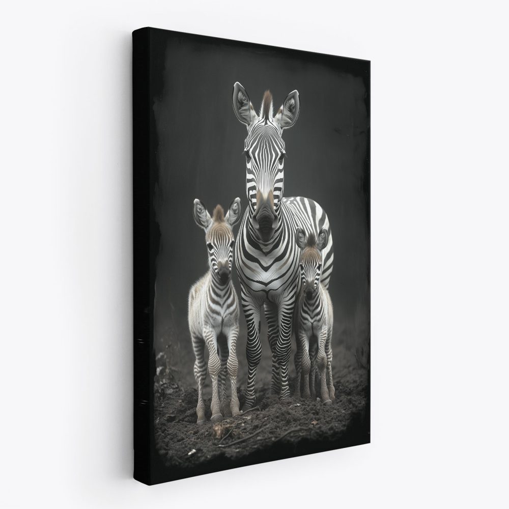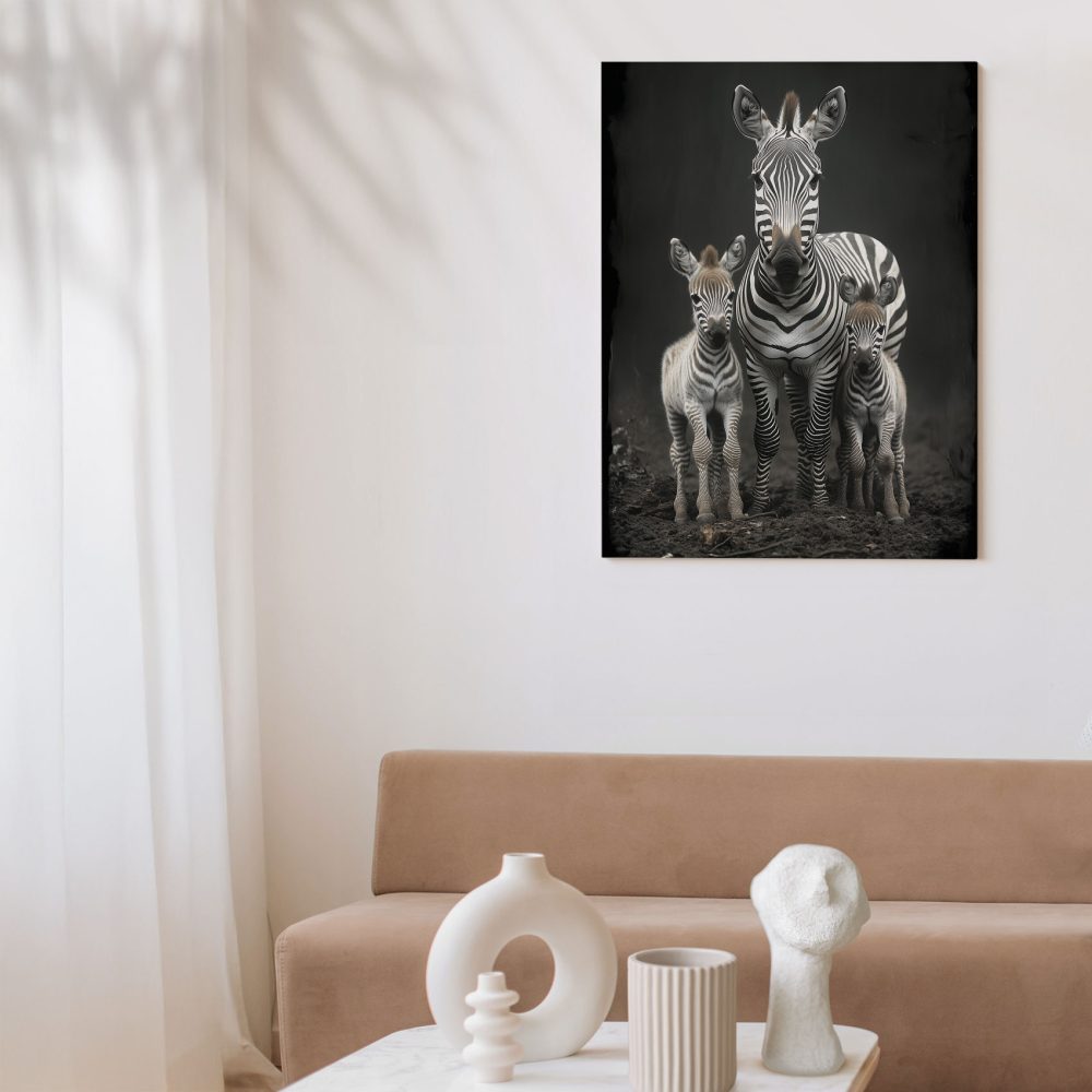 Terug naar collectie / Schilderijen / Dieren Schilderij / Zwart-witte zebrafamilie in veld