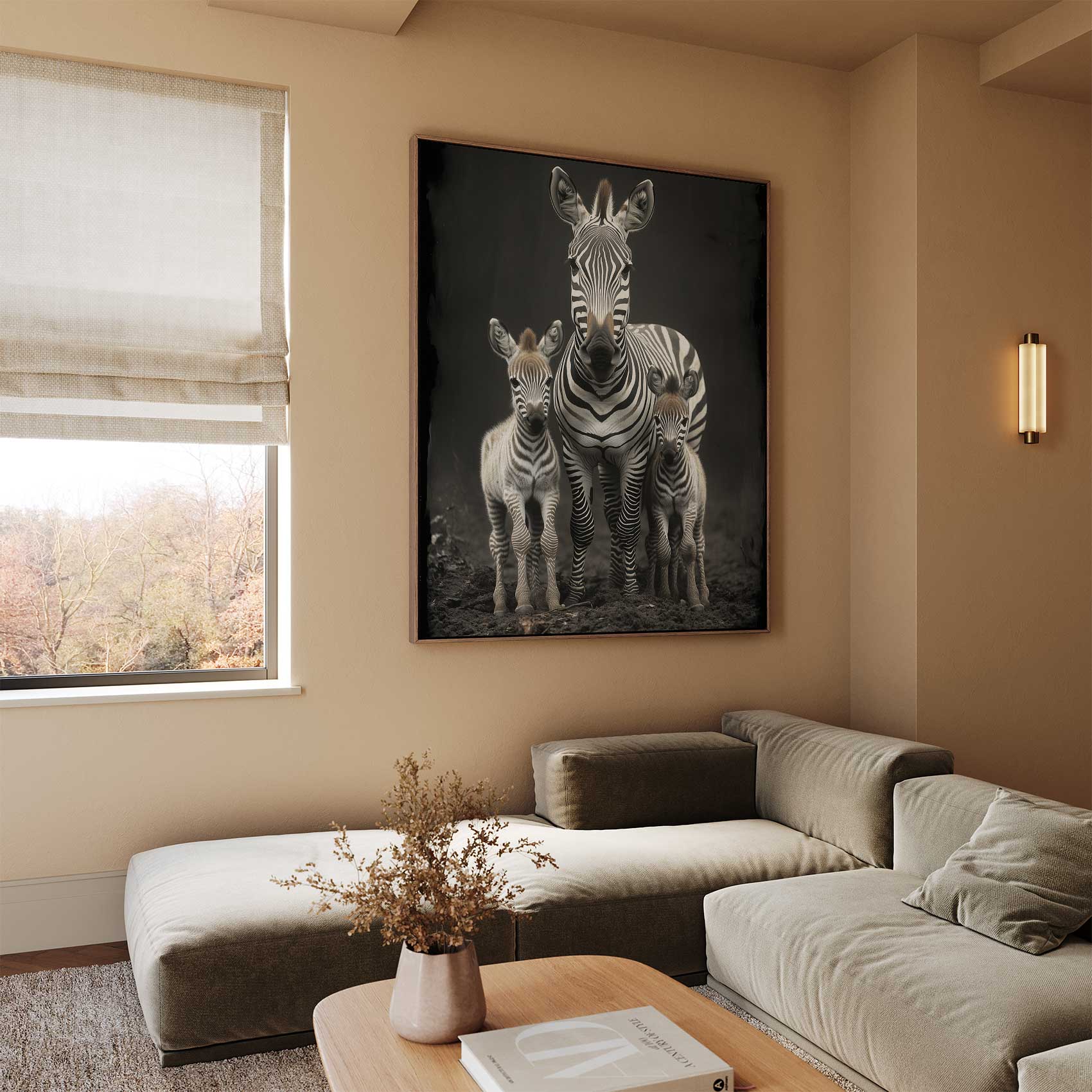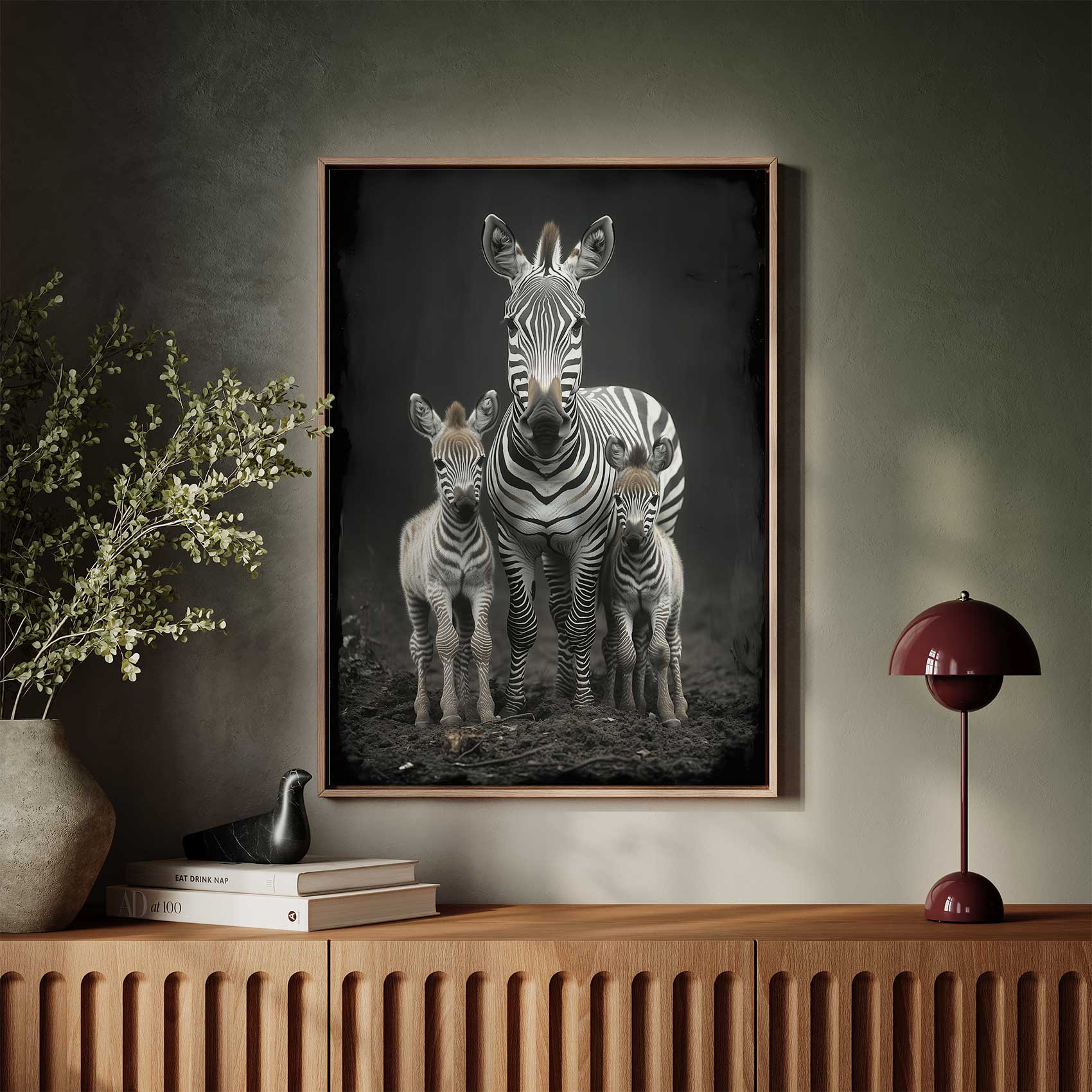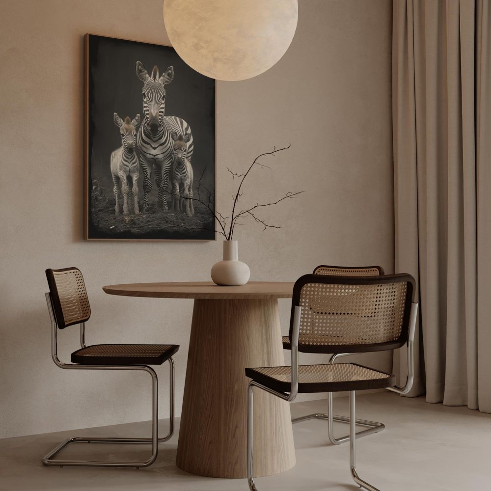 Terug naar collectie / Schilderijen / Dieren Schilderij / Zwart-witte zebrafamilie in veld