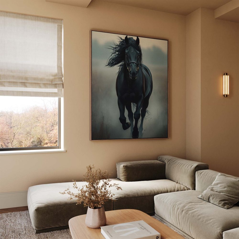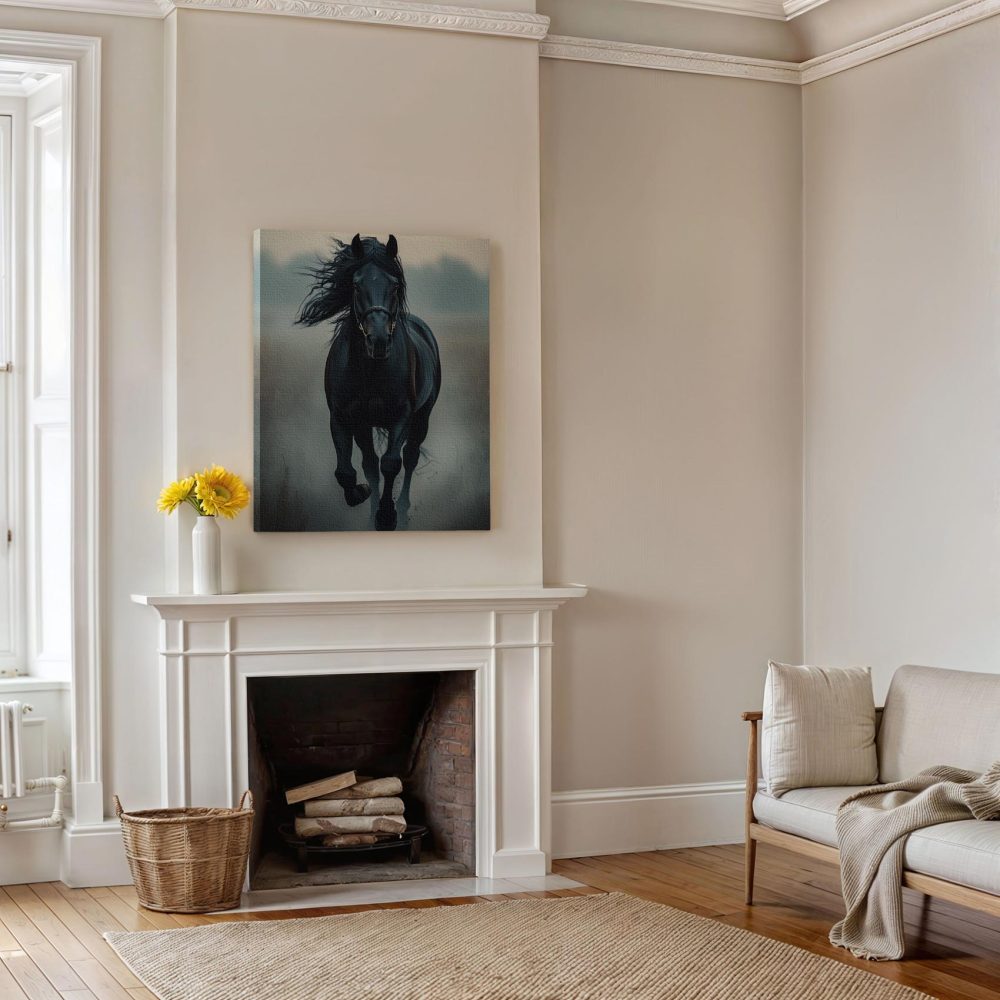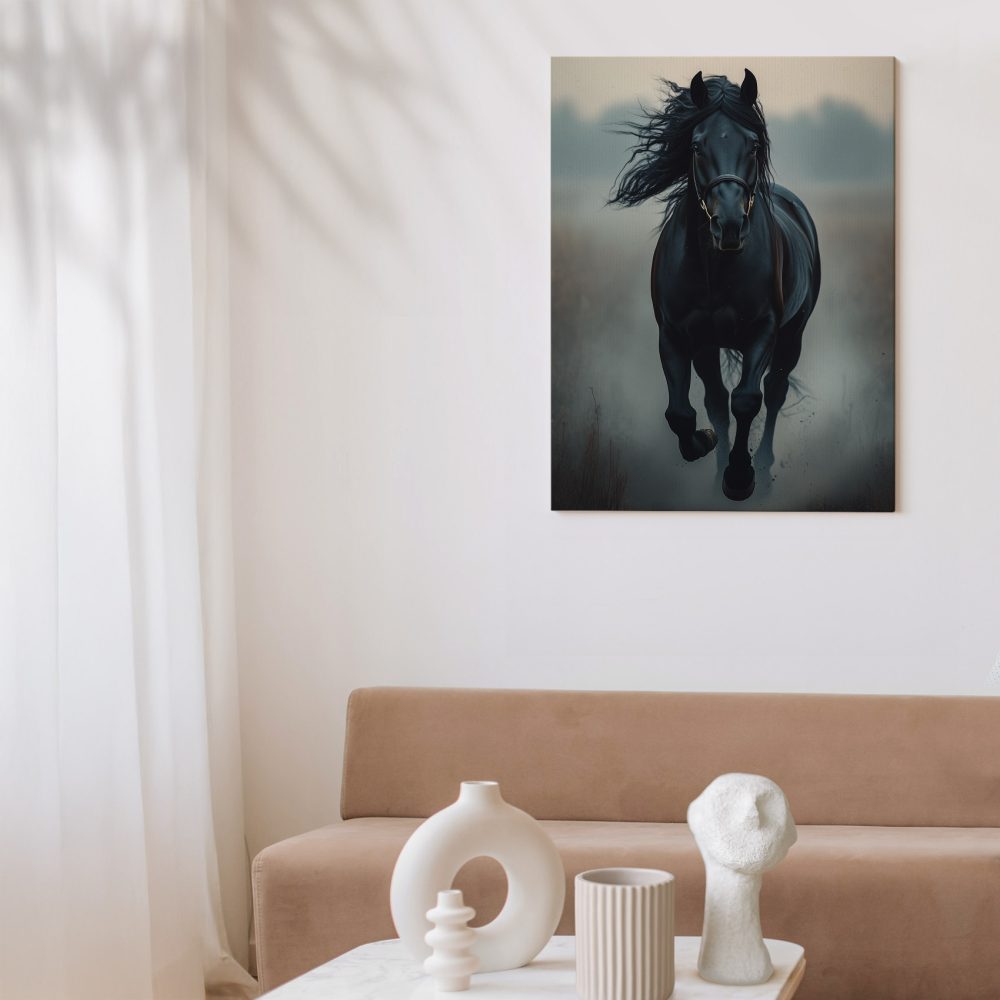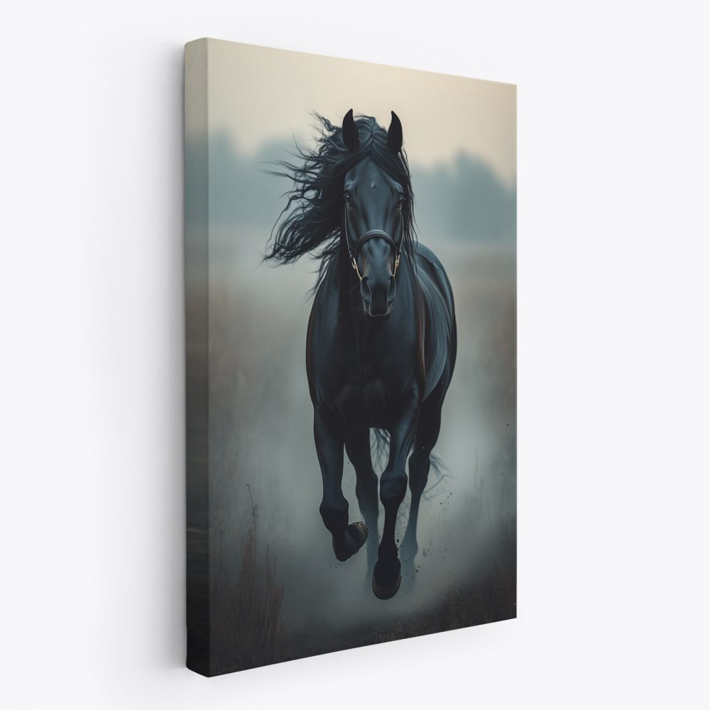 Zwarte paard in mist