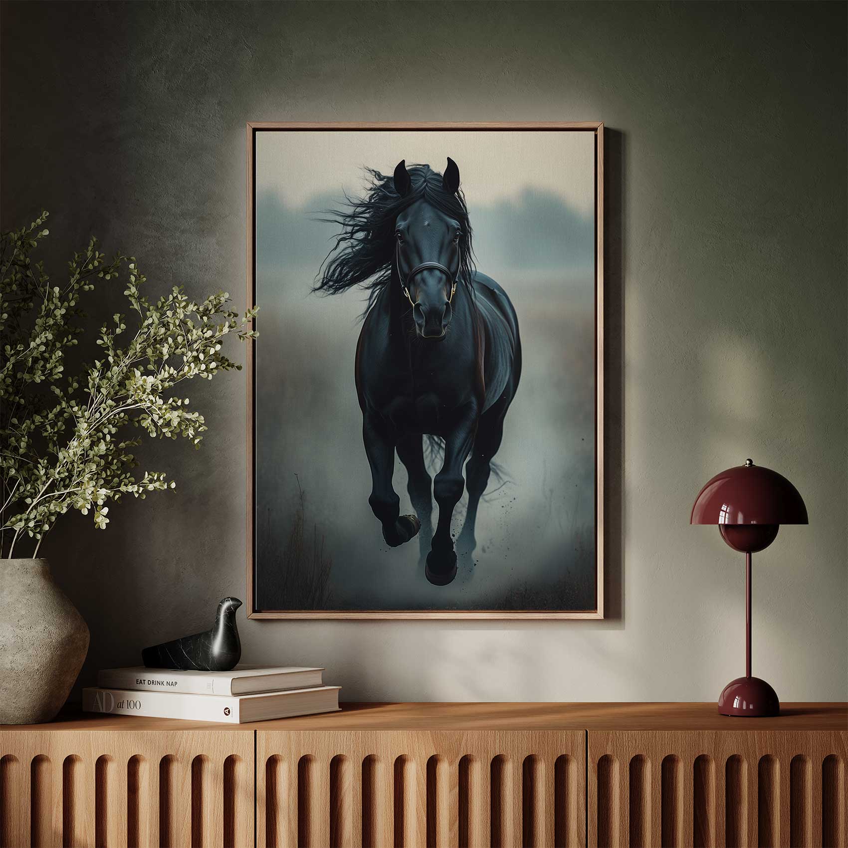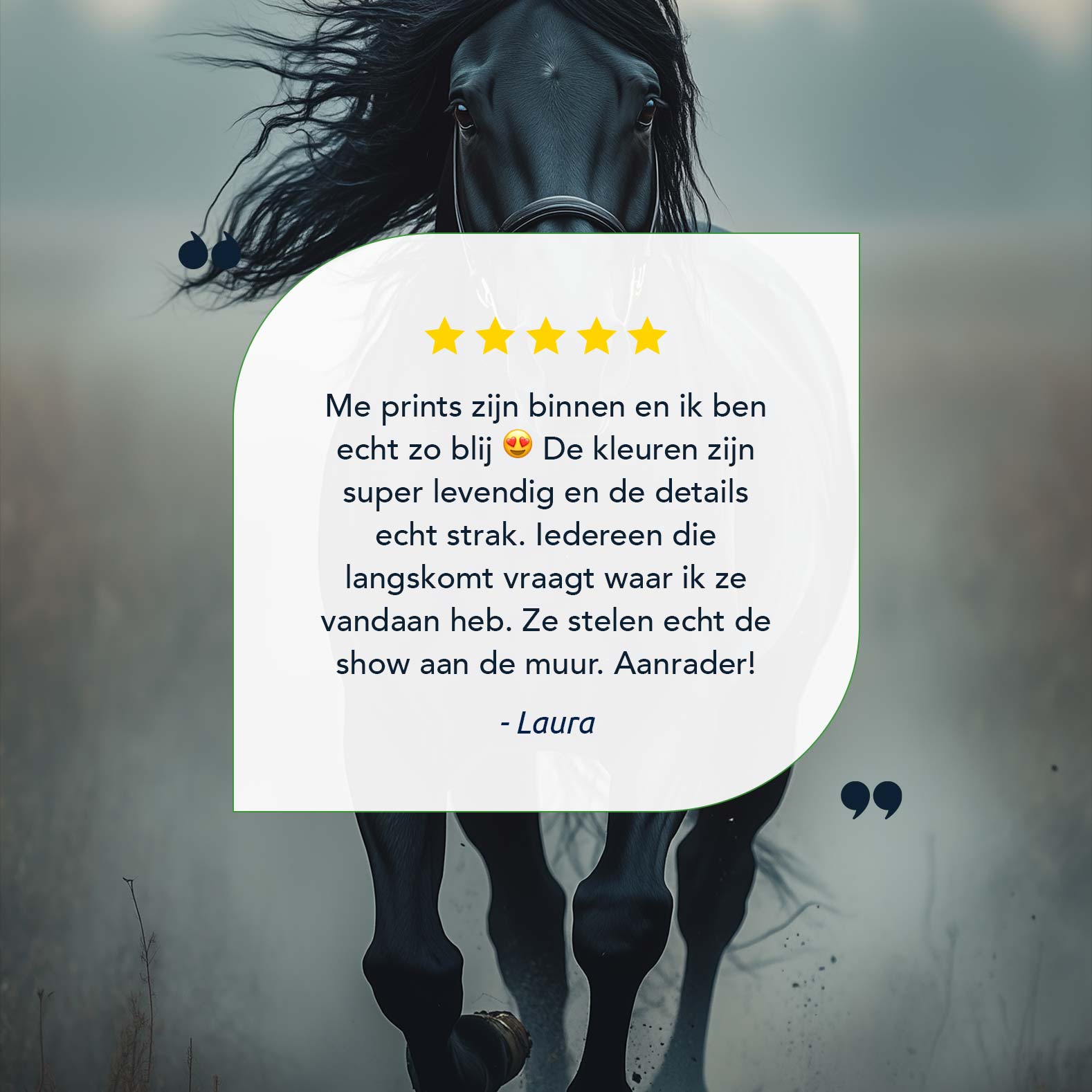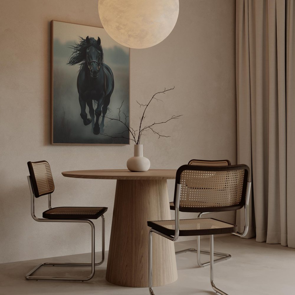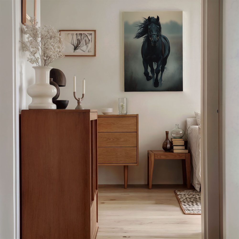 Zwarte paard in mist
