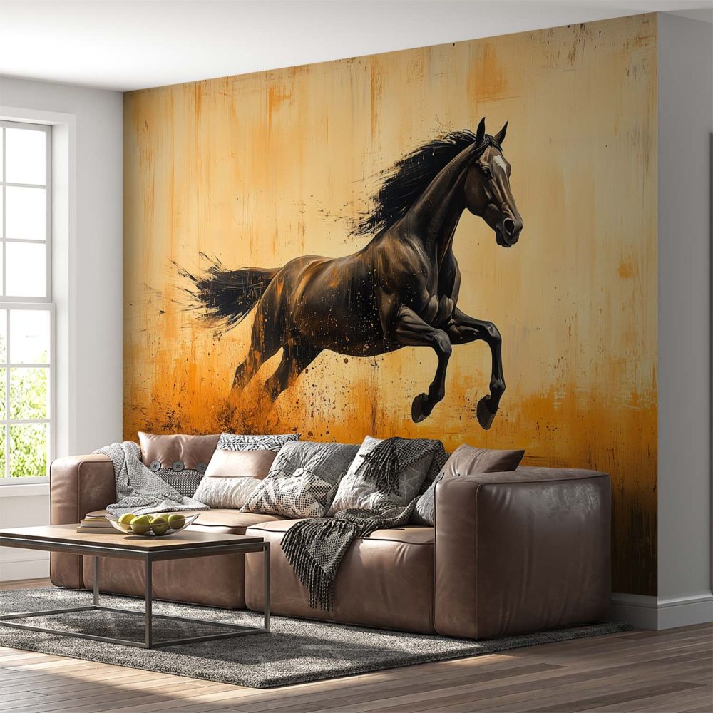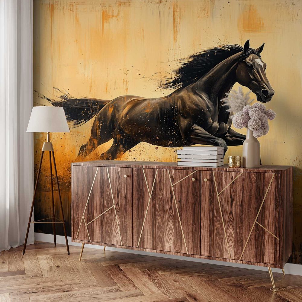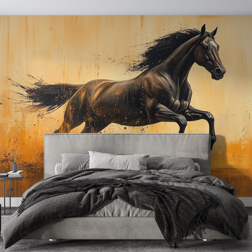 Zwarte rennende paardimpressie behang