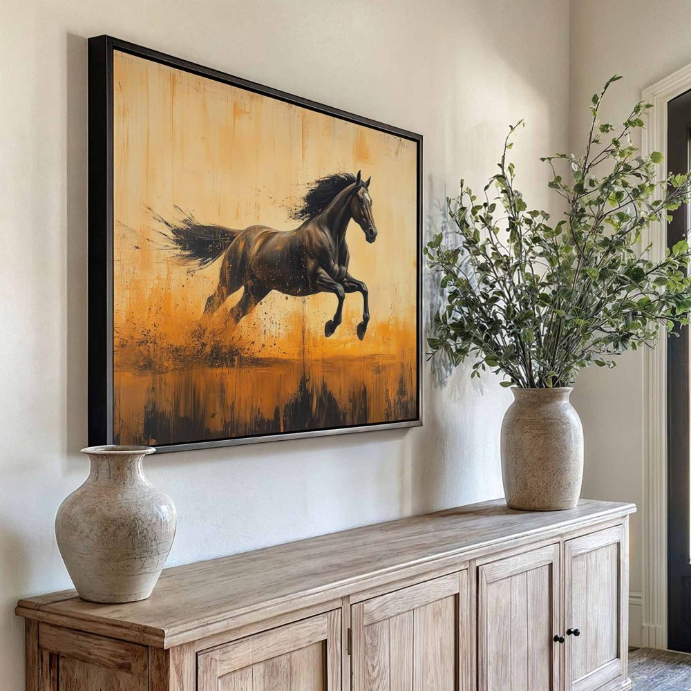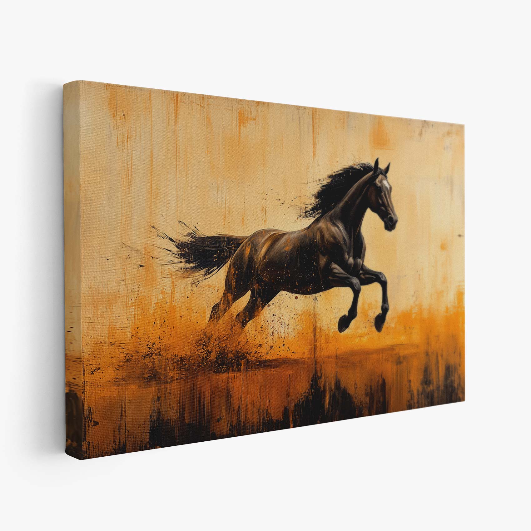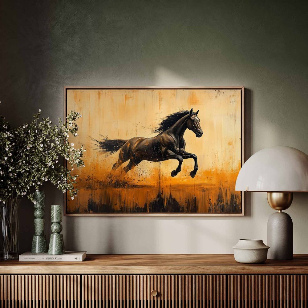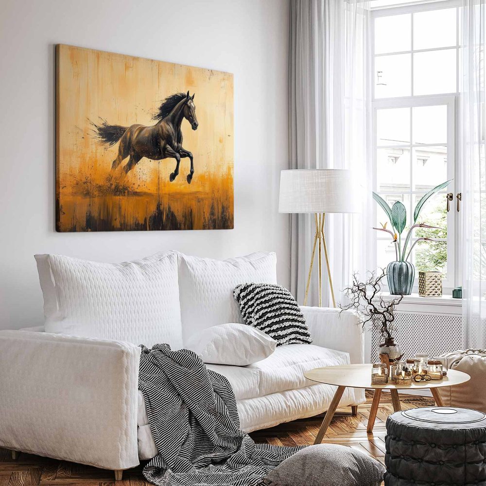 Terug naar collectie / Schilderijen / Abstract Schilderij / Zwarte renpaard in vlammen