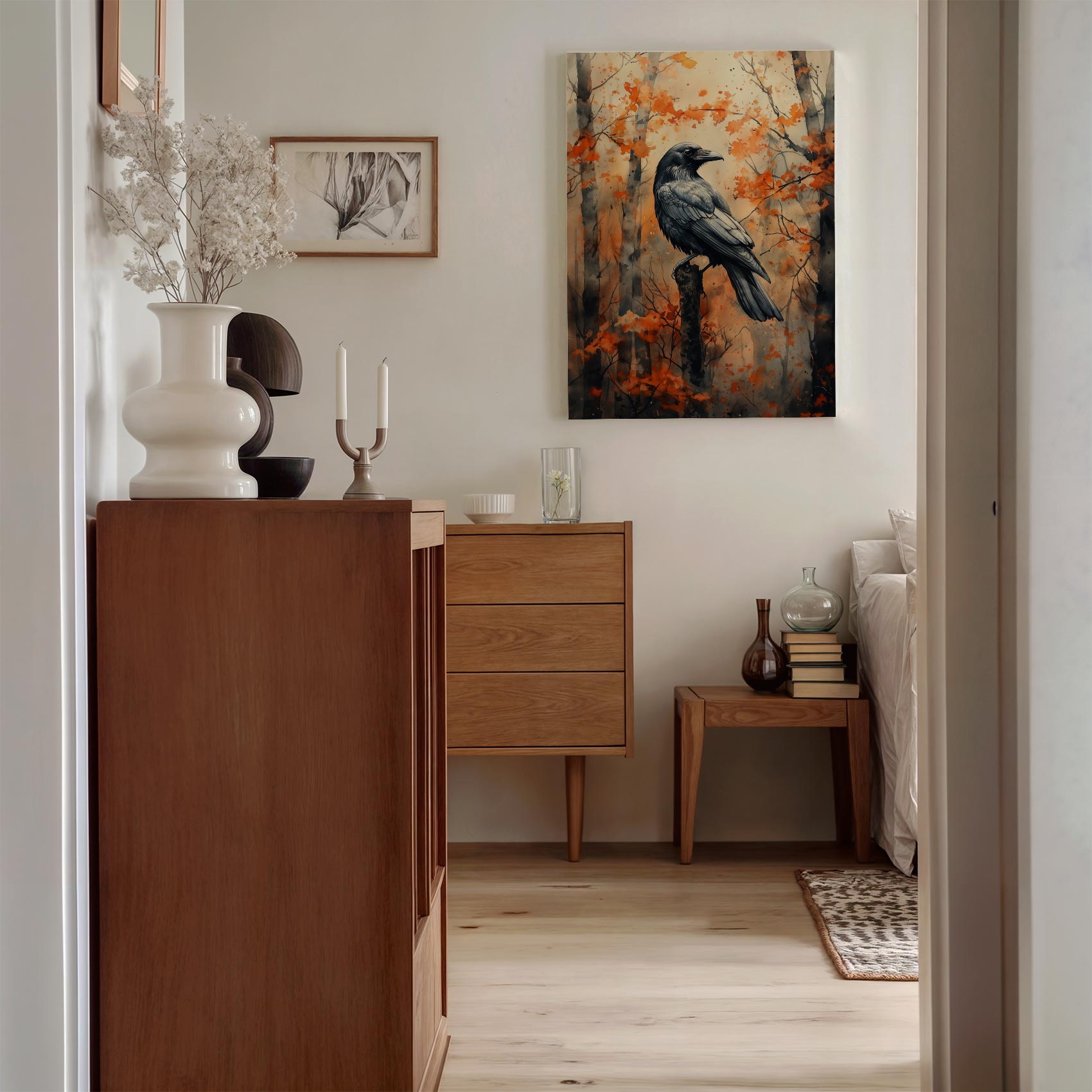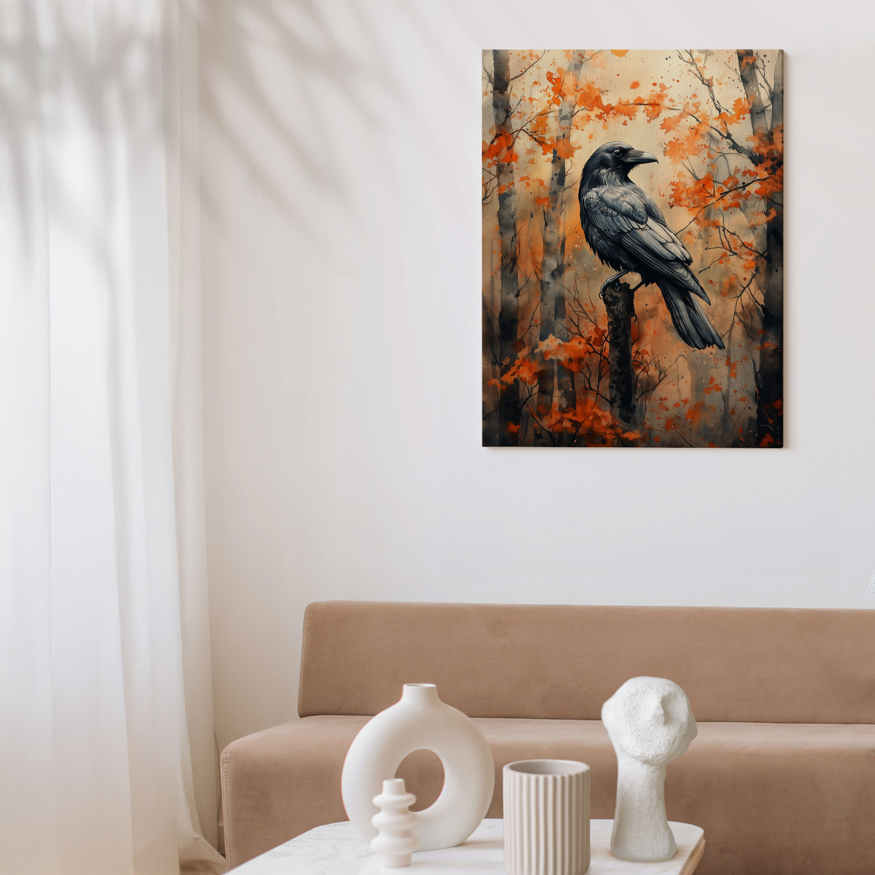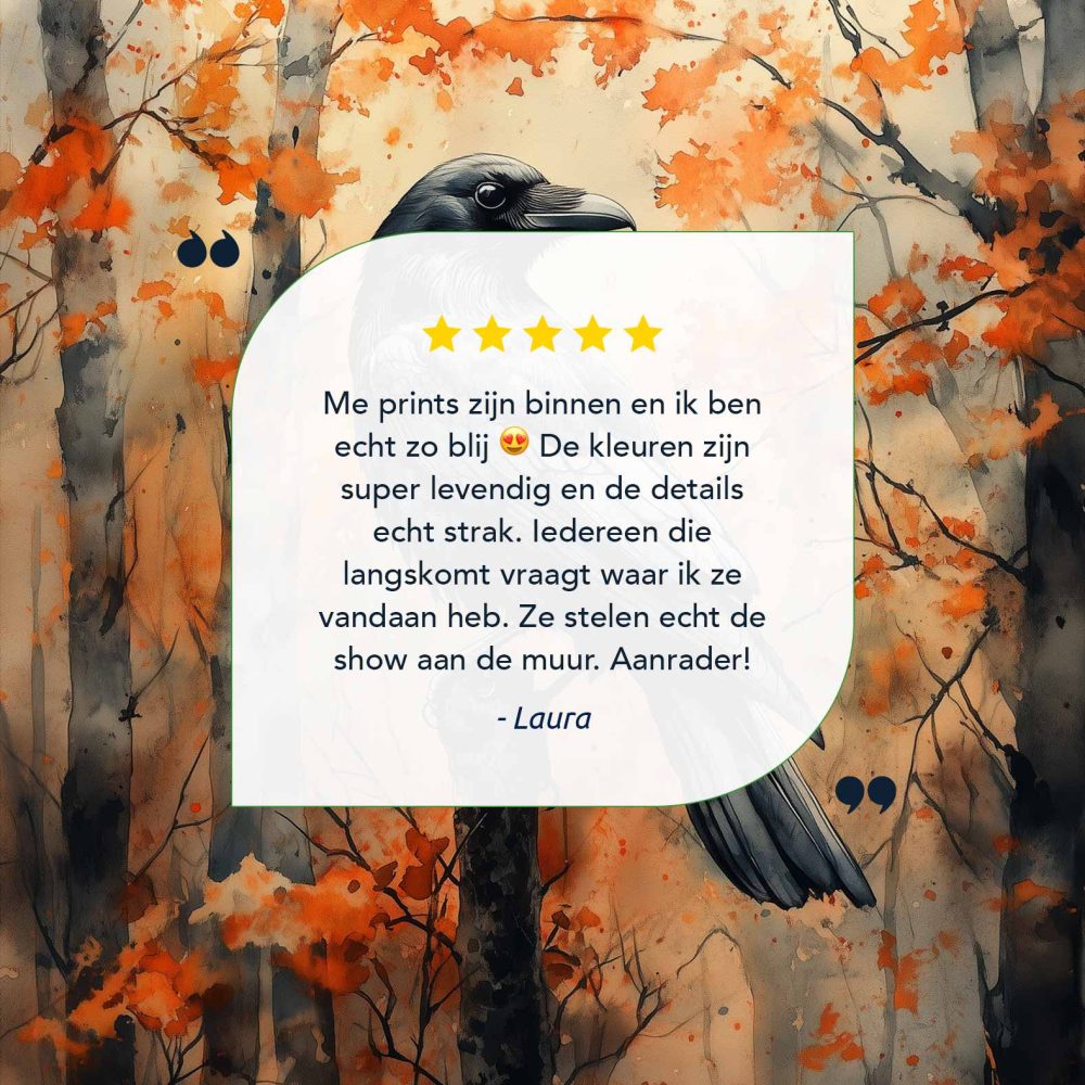 Terug naar collectie / Schilderijen / Bossen Schilderij / Zwarte vogel in herfstbos
