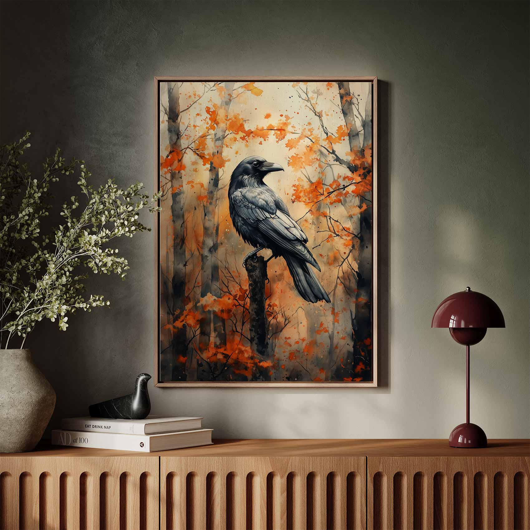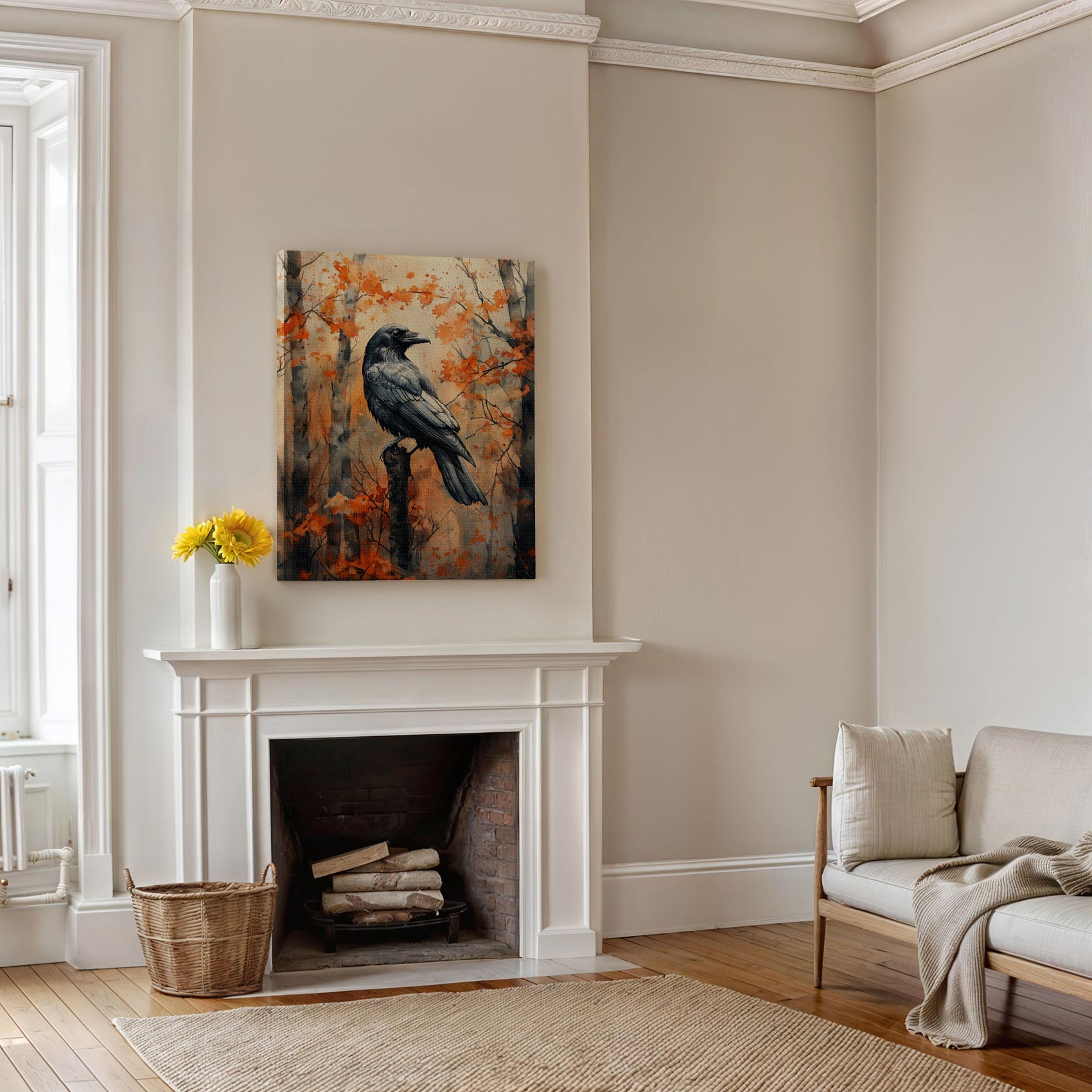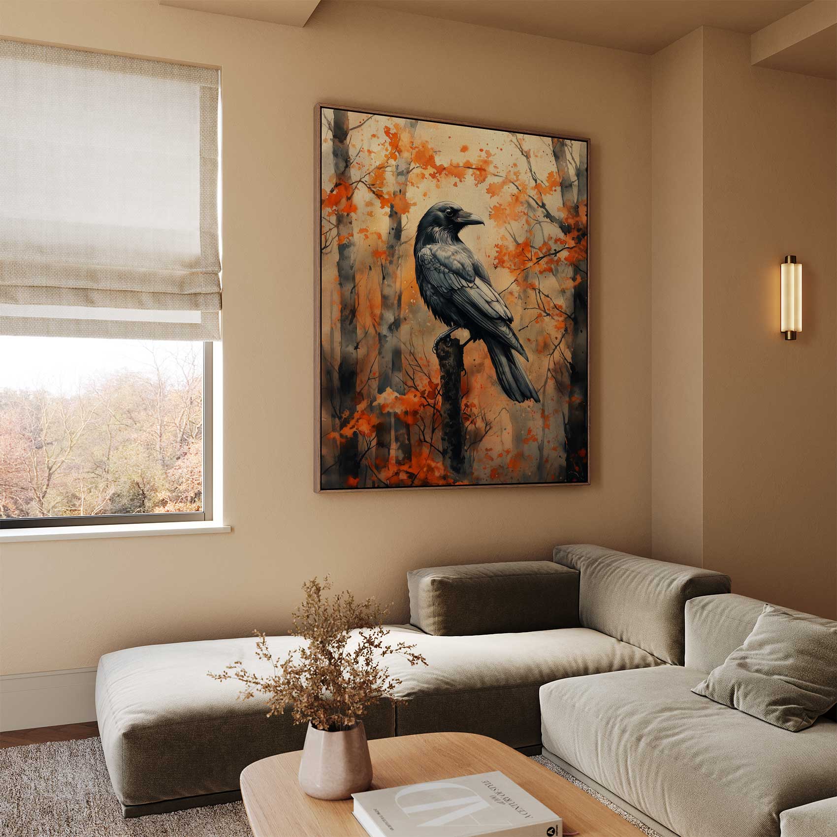 Terug naar collectie / Schilderijen / Bossen Schilderij / Zwarte vogel in herfstbos