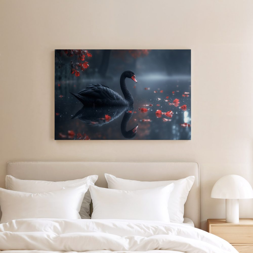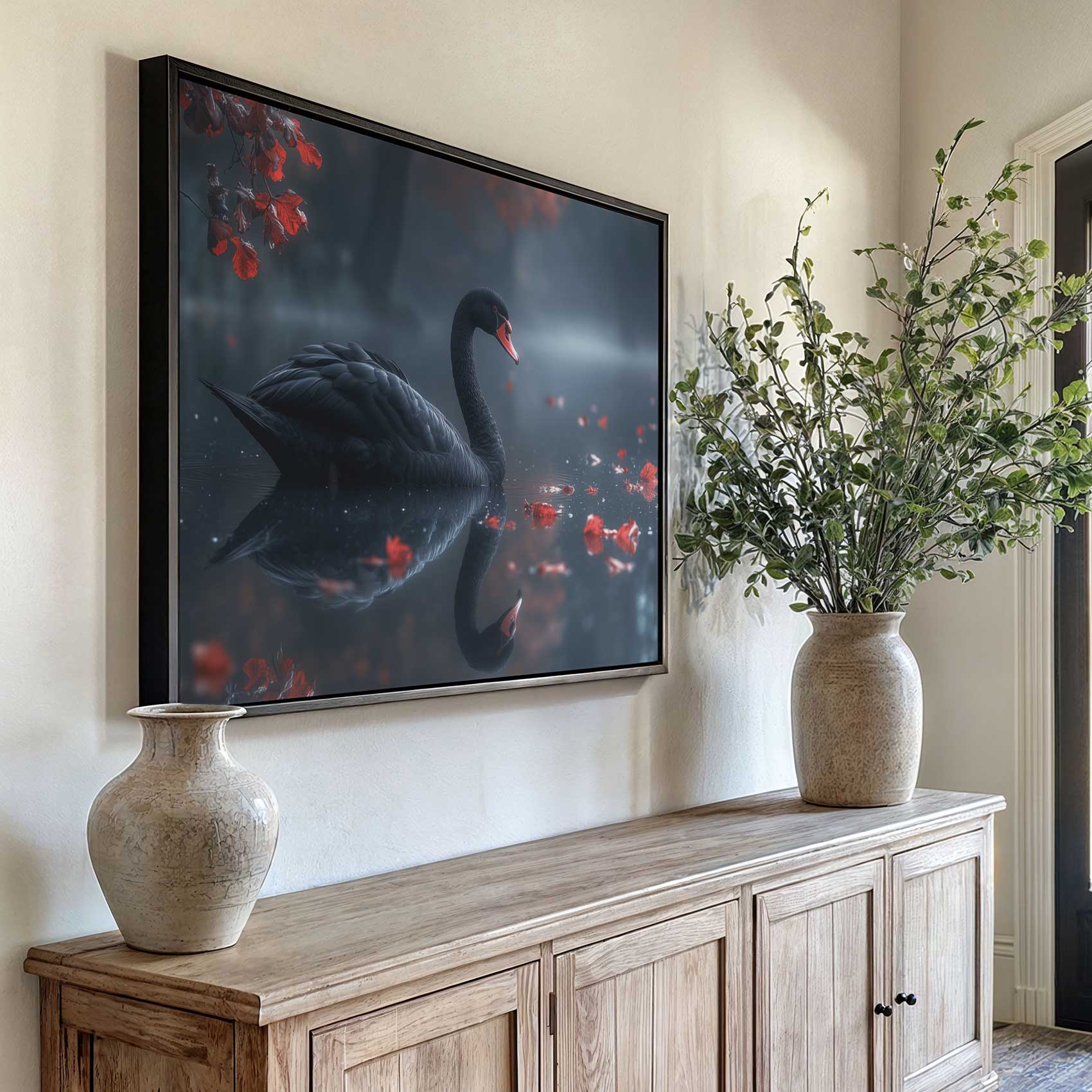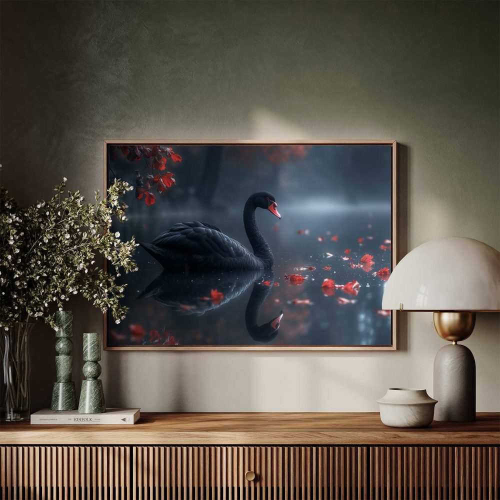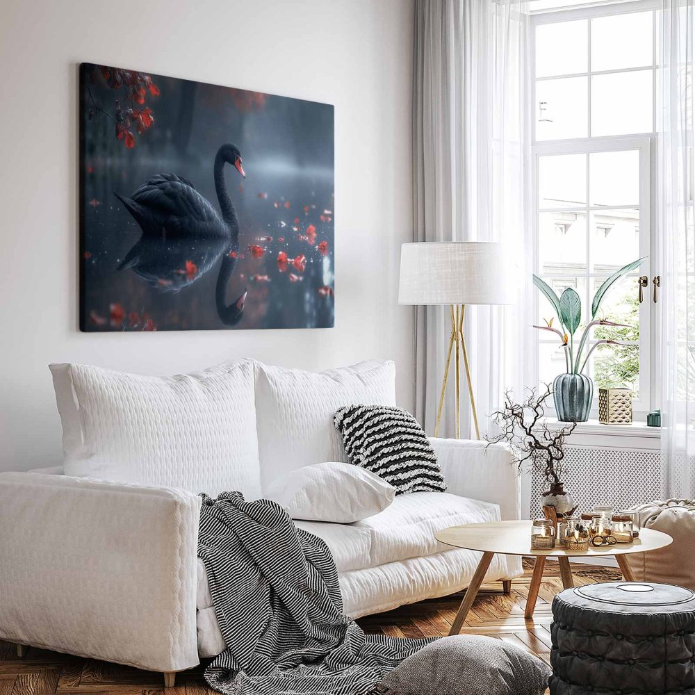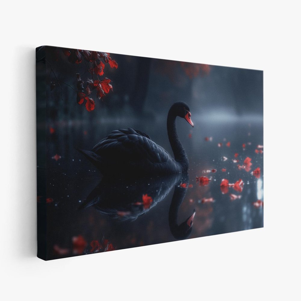 Terug naar collectie / Schilderijen / Bossen Schilderij / Zwarte zwaan tussen rode bladeren