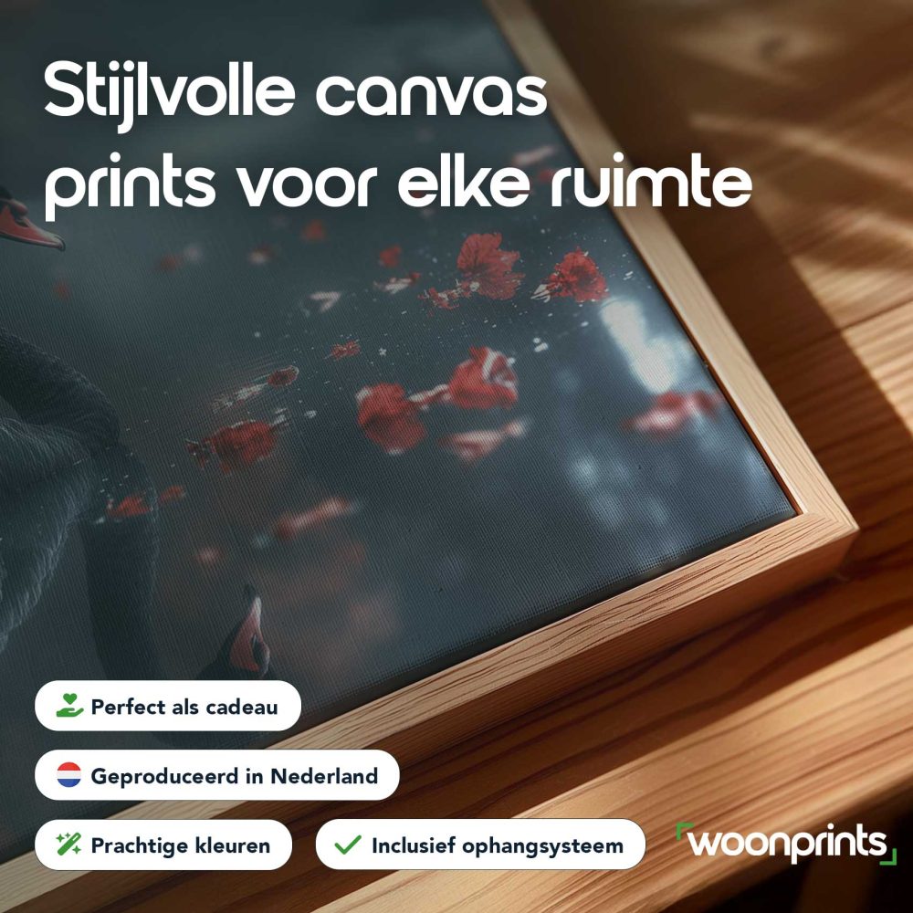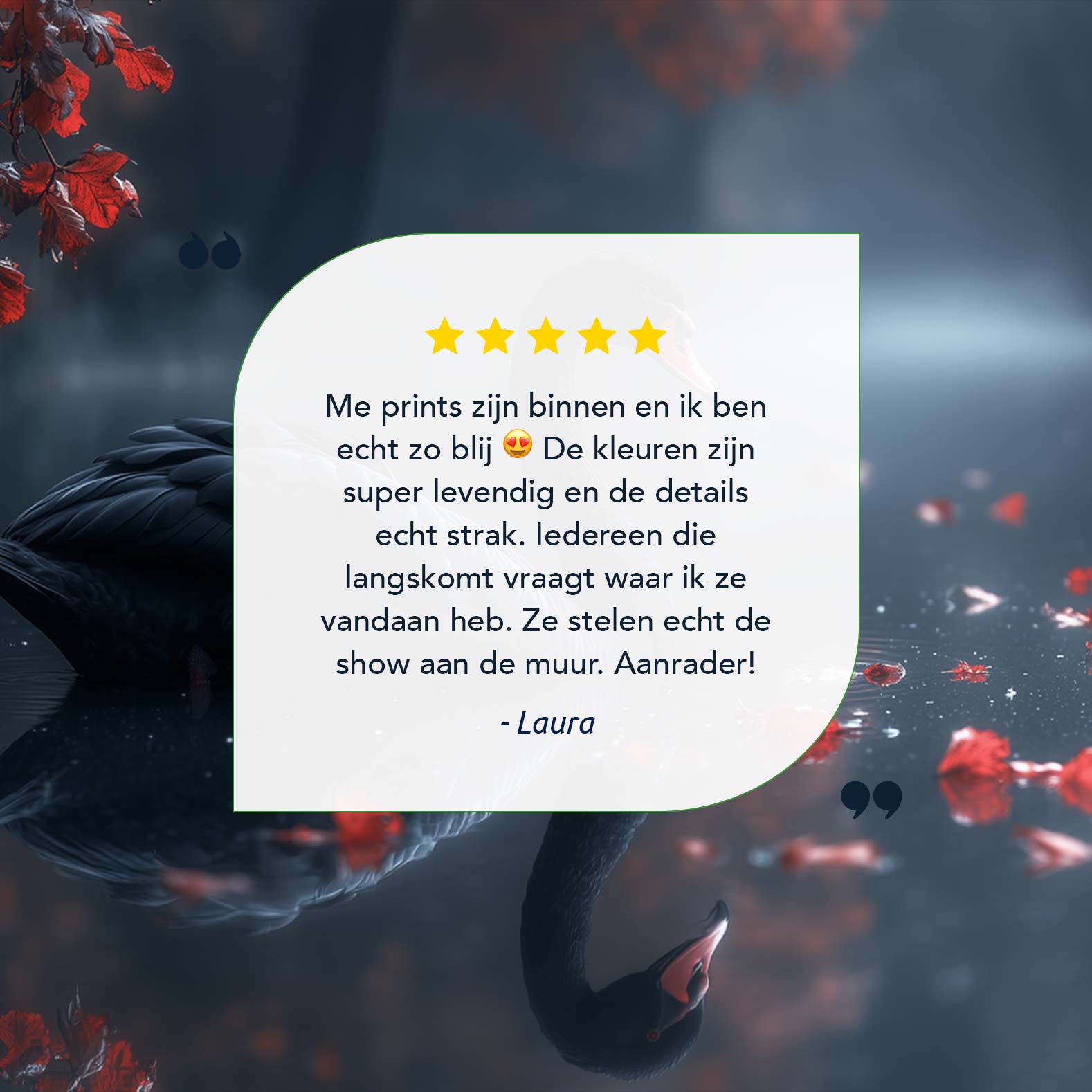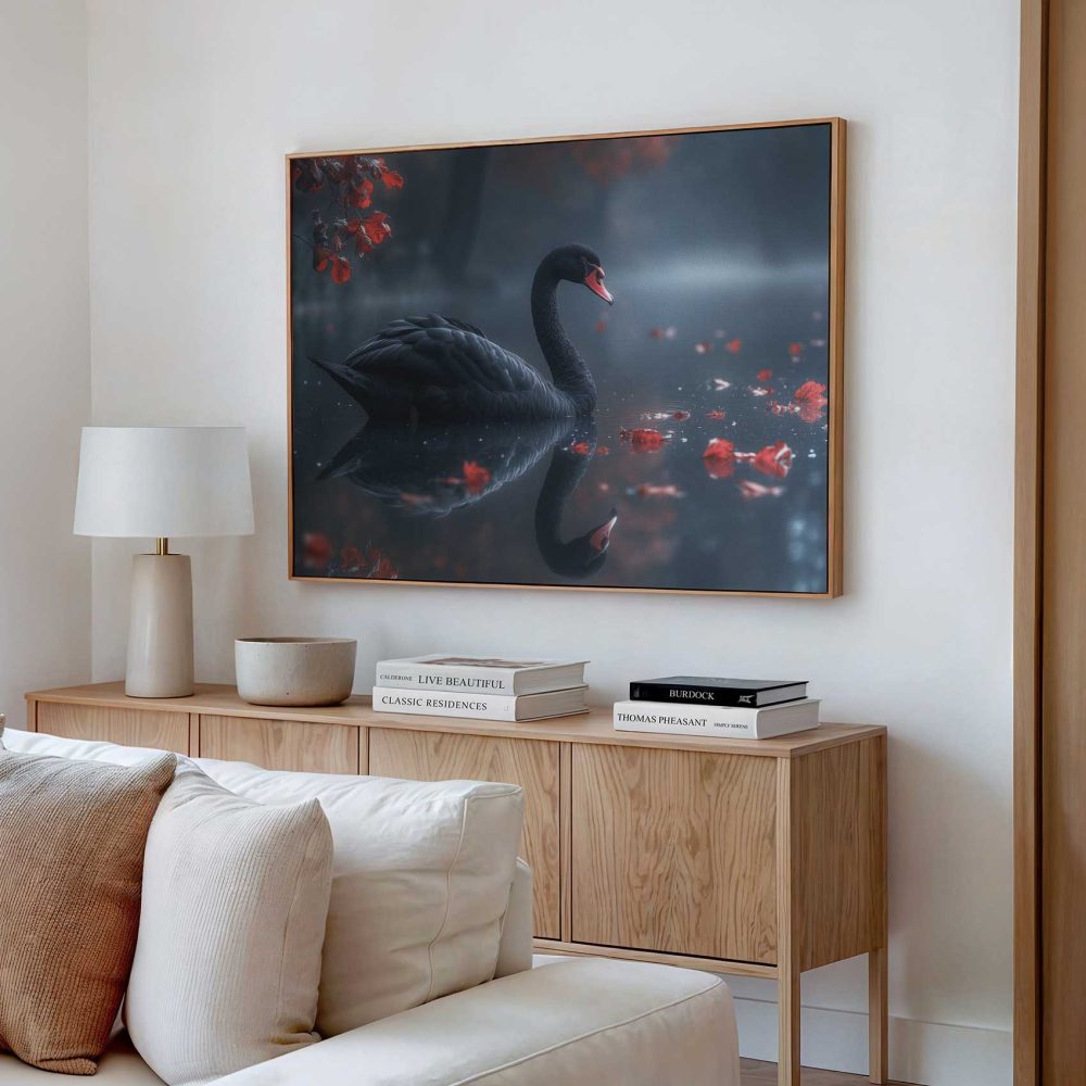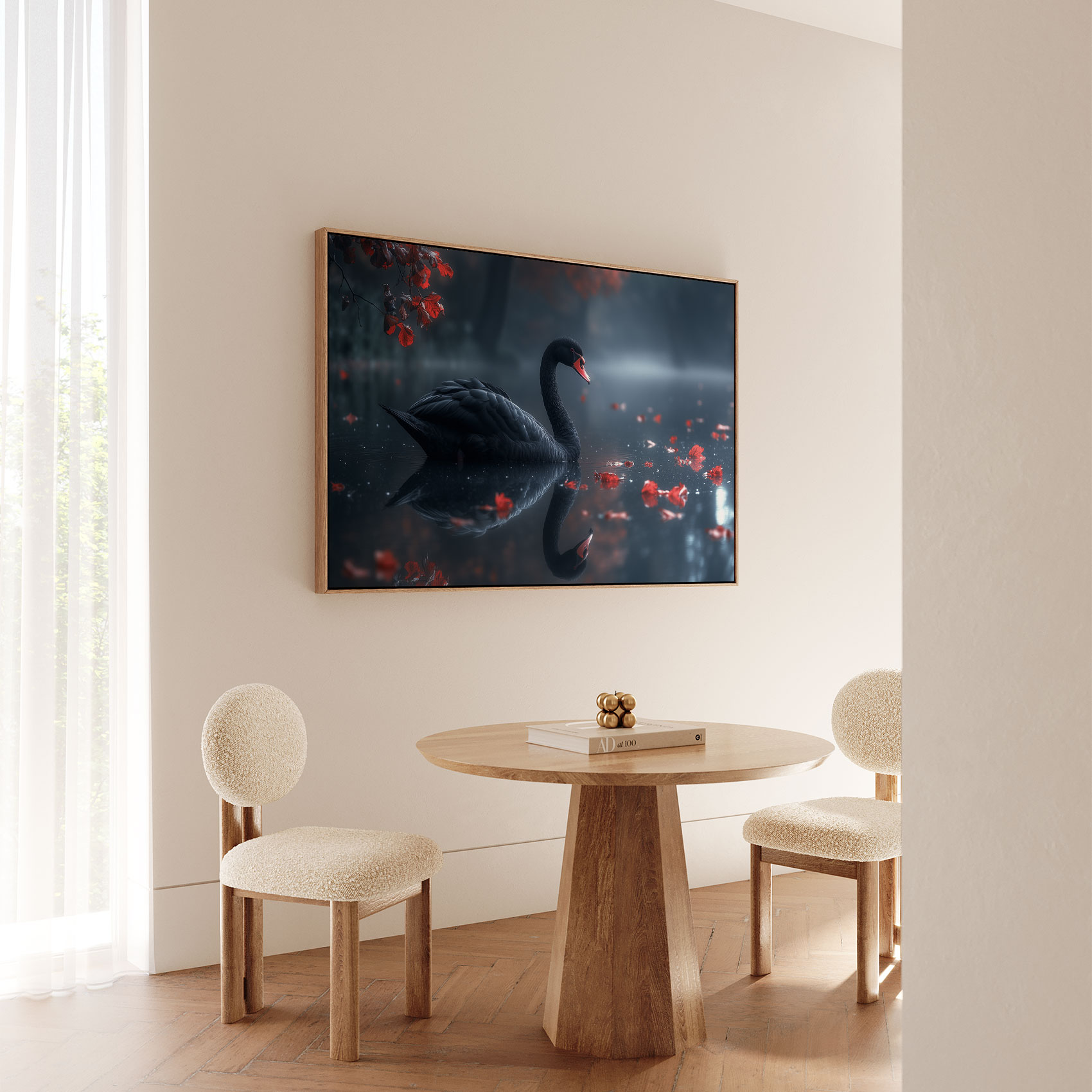 Terug naar collectie / Schilderijen / Bossen Schilderij / Zwarte zwaan tussen rode bladeren