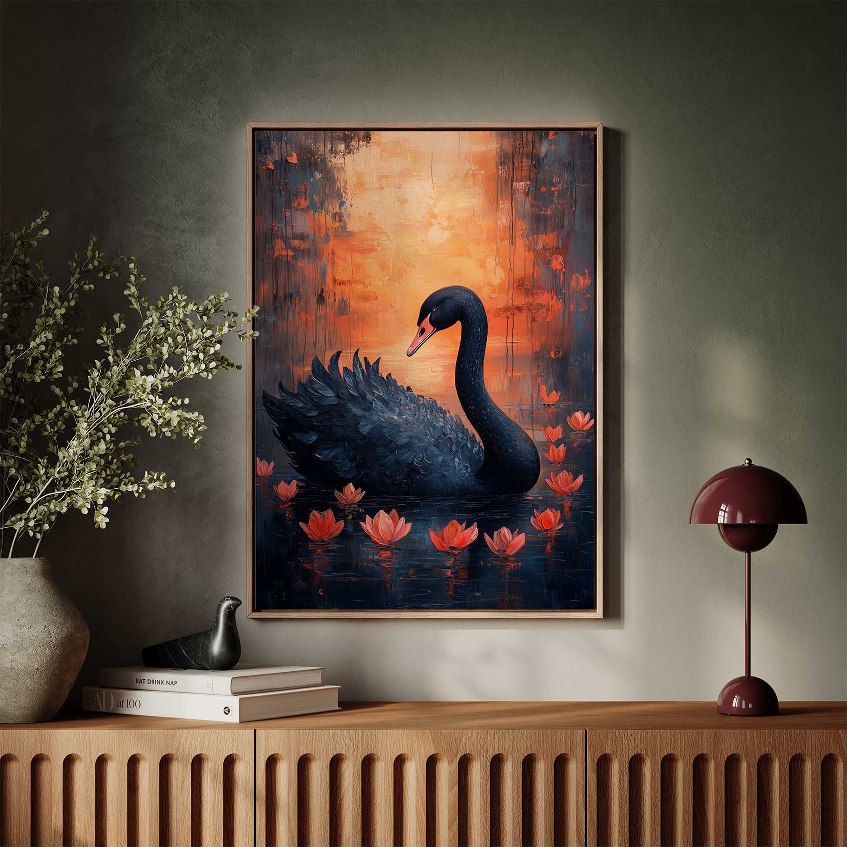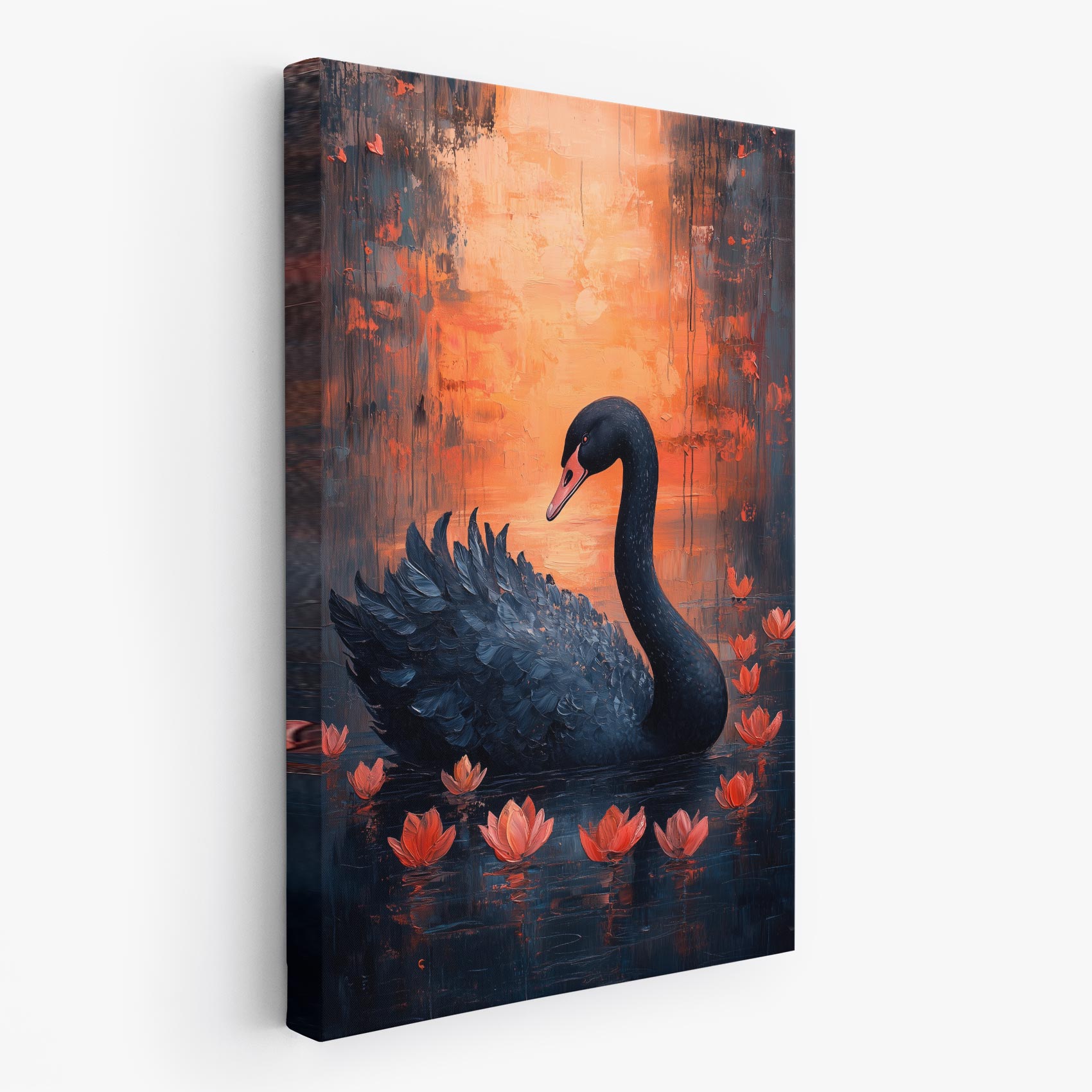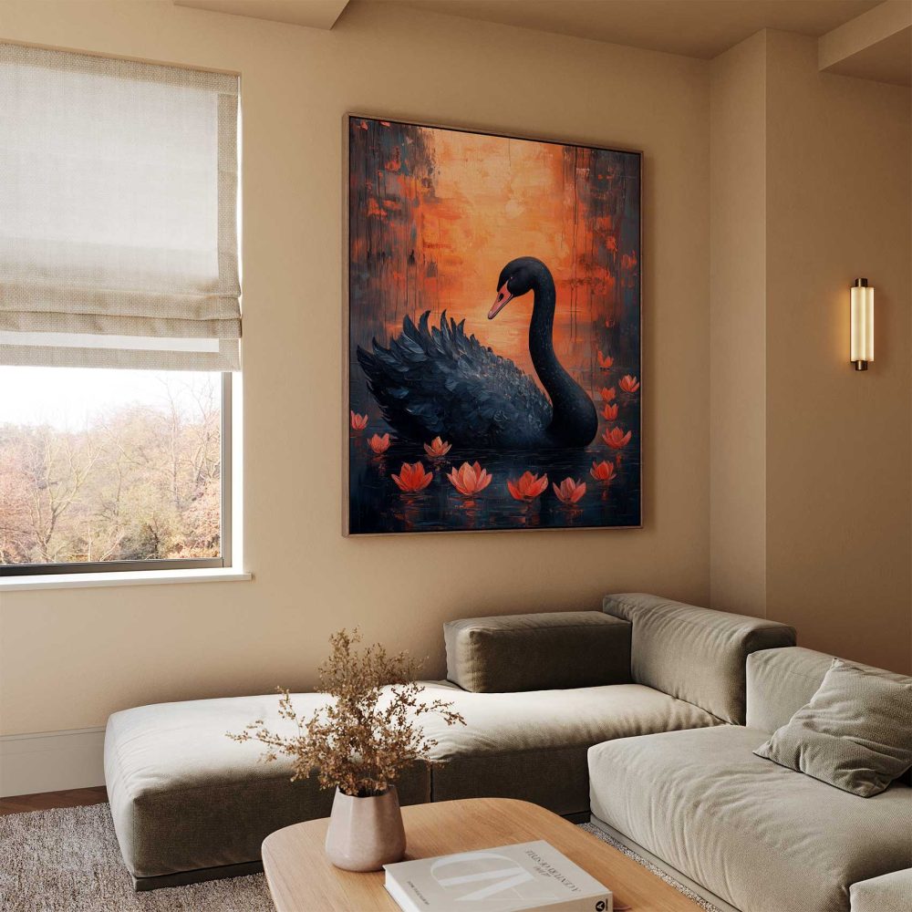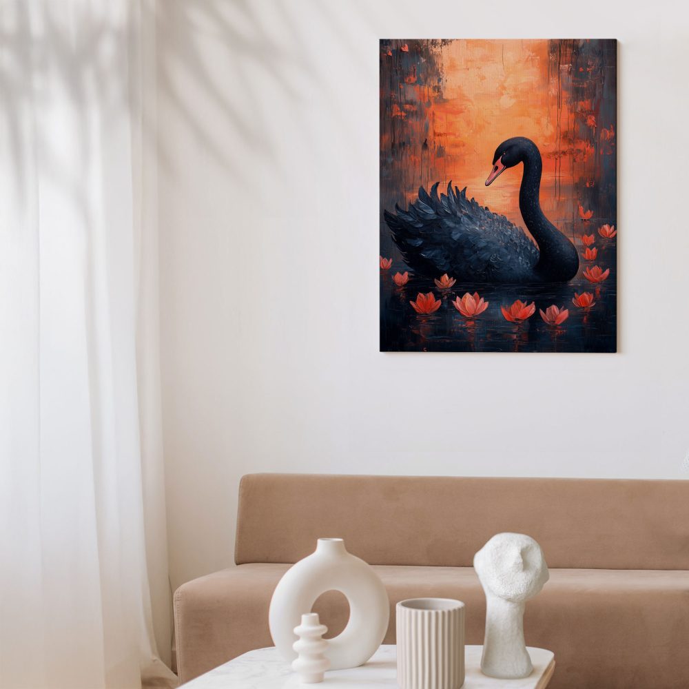 Terug naar collectie / Schilderijen / Bloemen Schilderij / Zwarte zwaan tussen roze bloemen