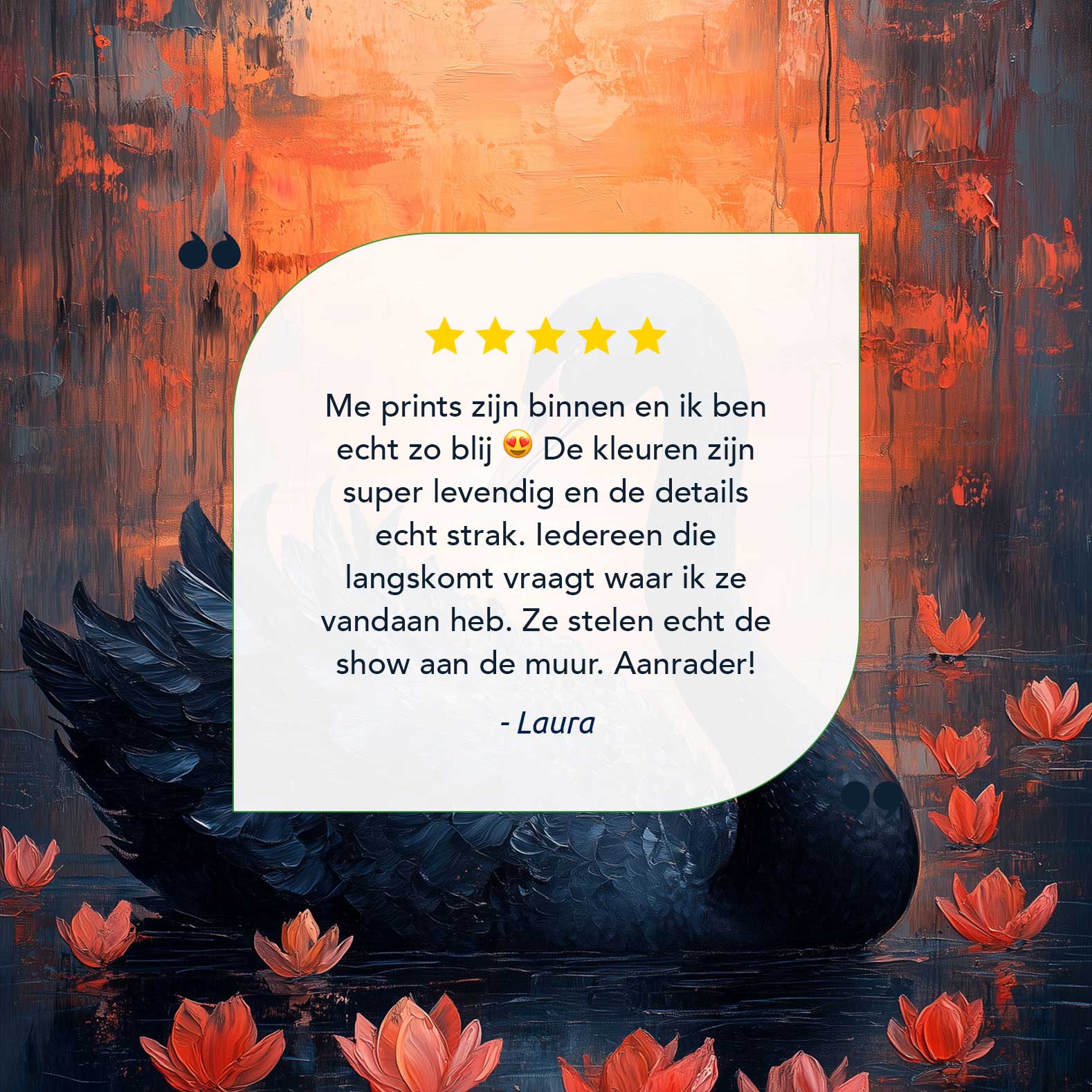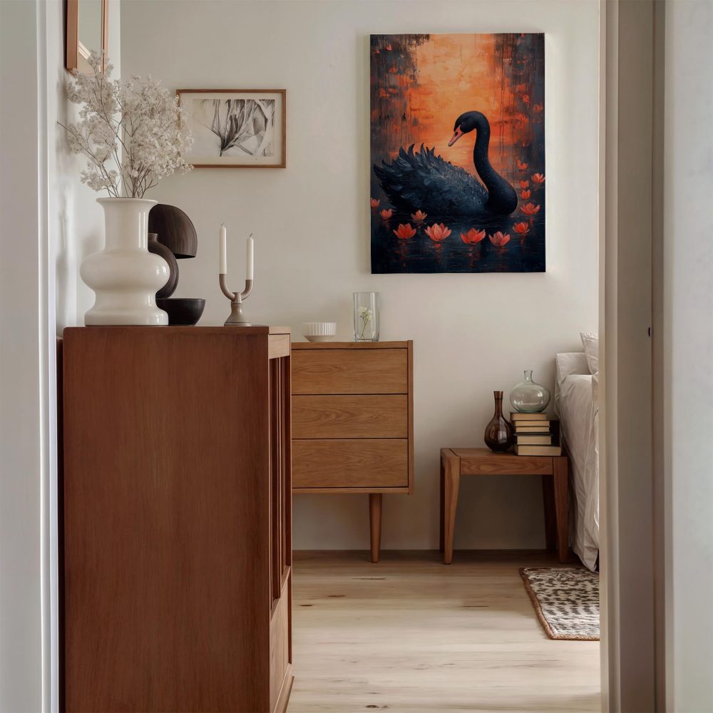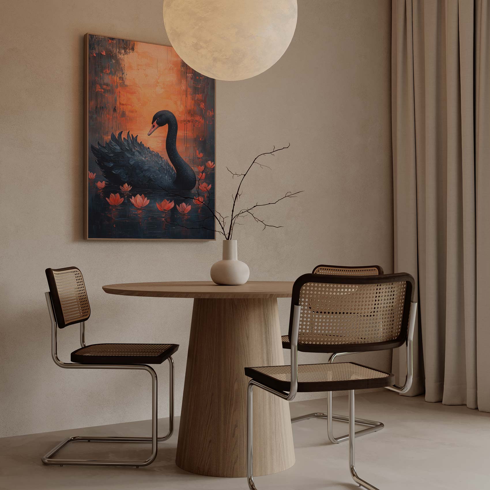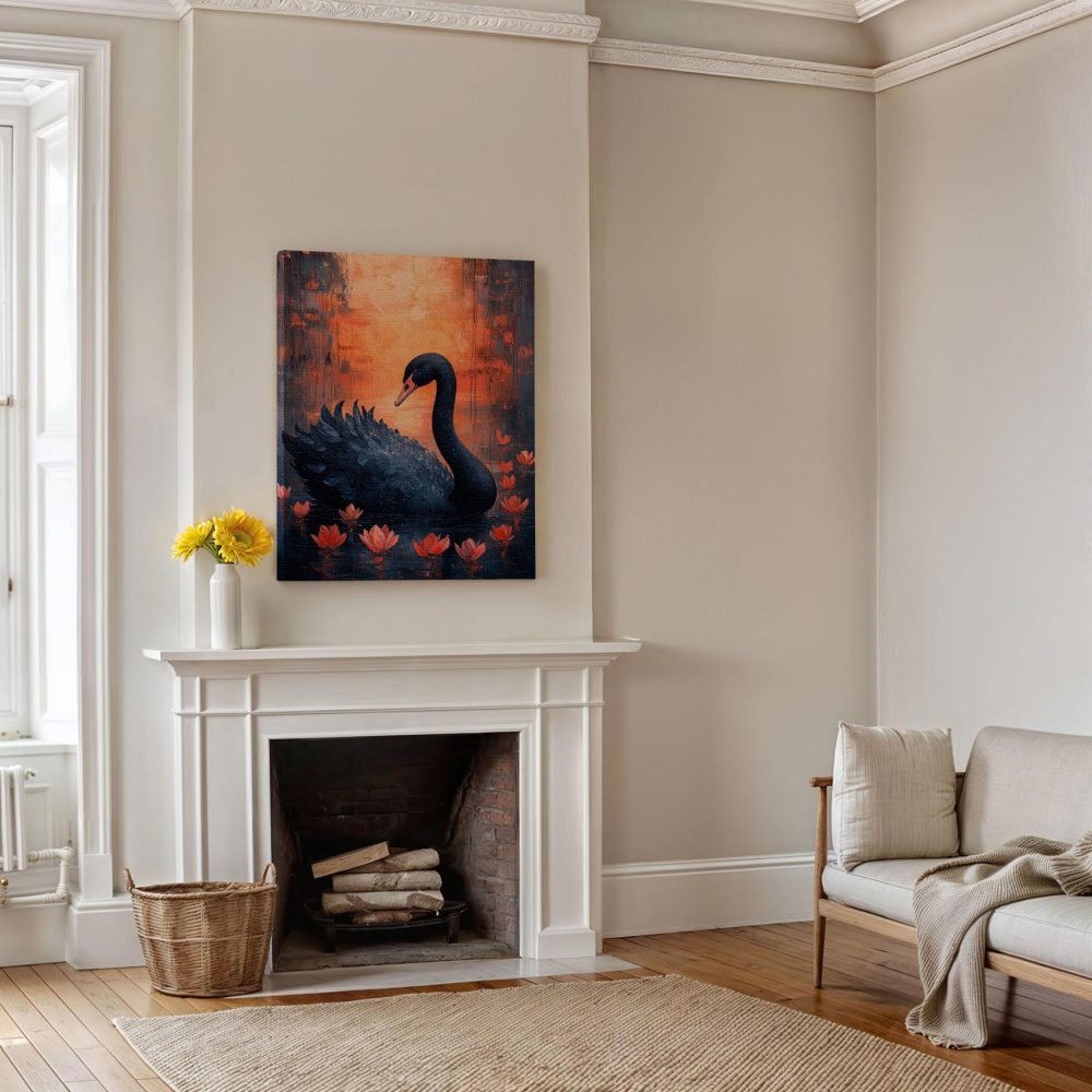 Terug naar collectie / Schilderijen / Bloemen Schilderij / Zwarte zwaan tussen roze bloemen